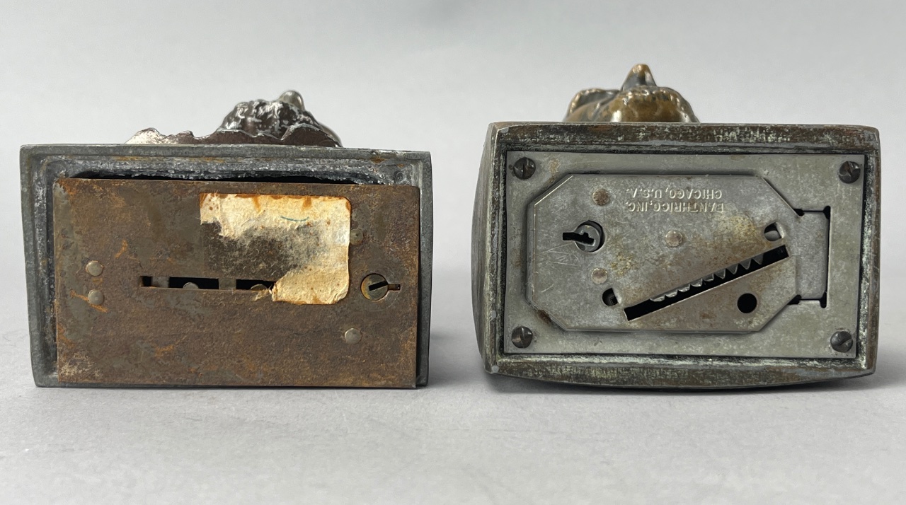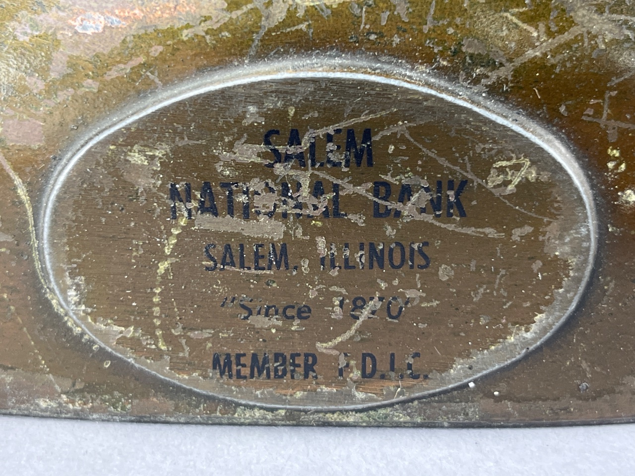 Pair of Abraham Lincoln bust banks in metal, featuring one in silver finish and one in bronze finish. The left bust is inscribed ‘Abraham Lincoln’ while the right bust is includes a plaque on the back reading ‘SALEM NATIONAL BANK, SALEM, ILLINOIS, Since 1870, MEMBER F.D.I.C.’ Designed with flat bases for upright display. Each coin bank measures about 5″ tall. CONDITION: The left bust shows significant paint loss and surface wear. The right bust has minor surface scratches but is generally in better condition. SHIPPING: In-House Shipping Available