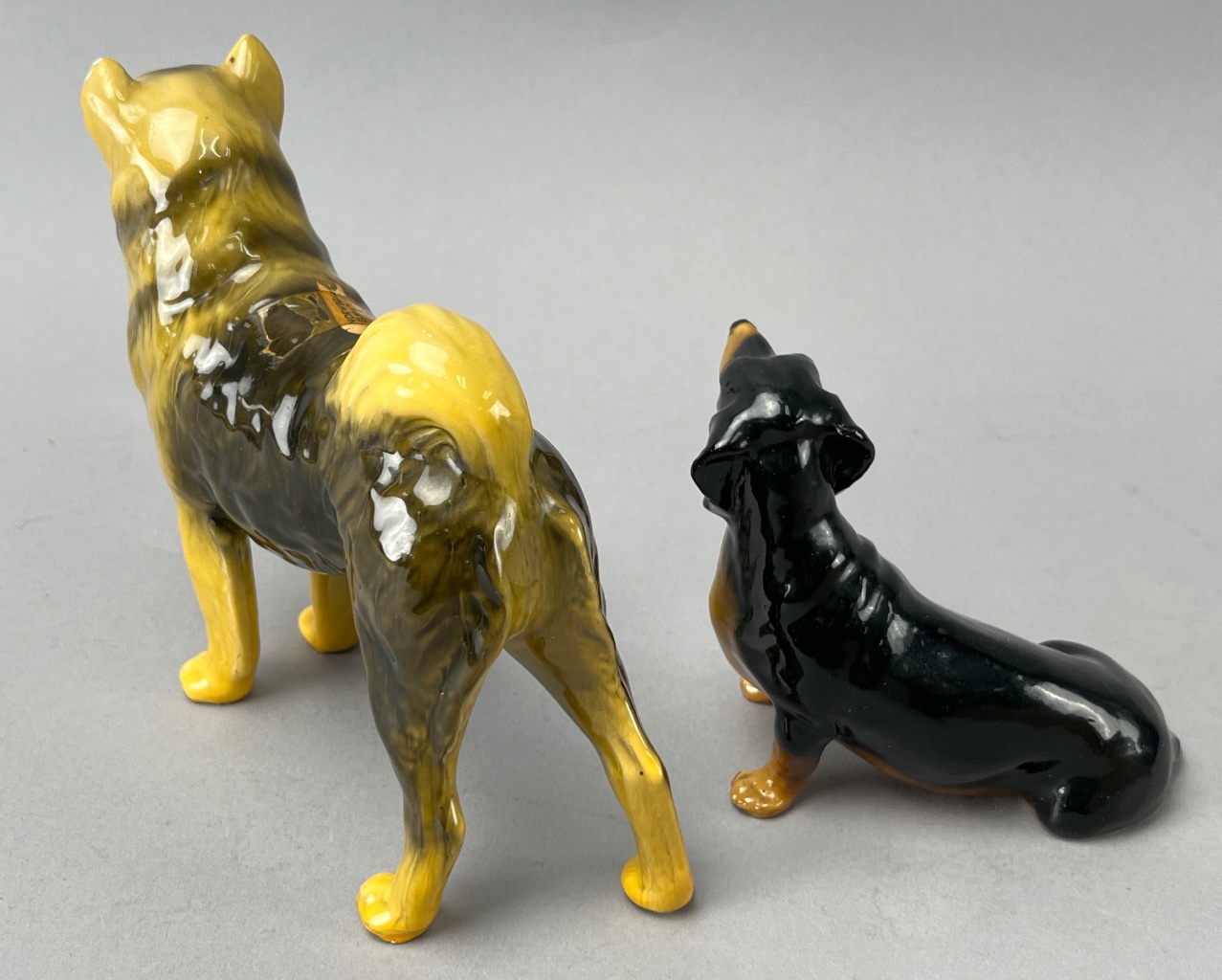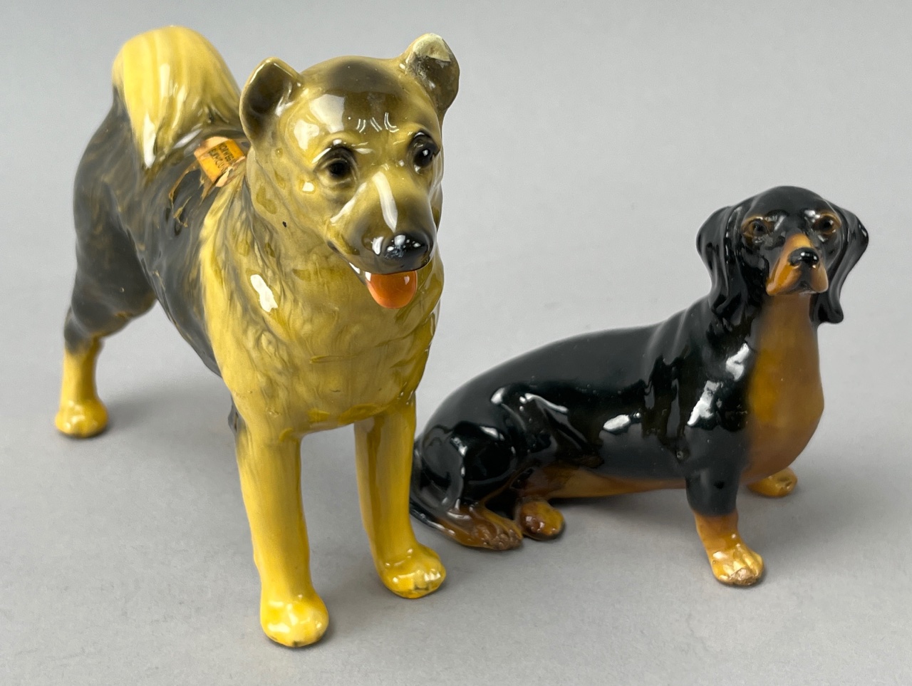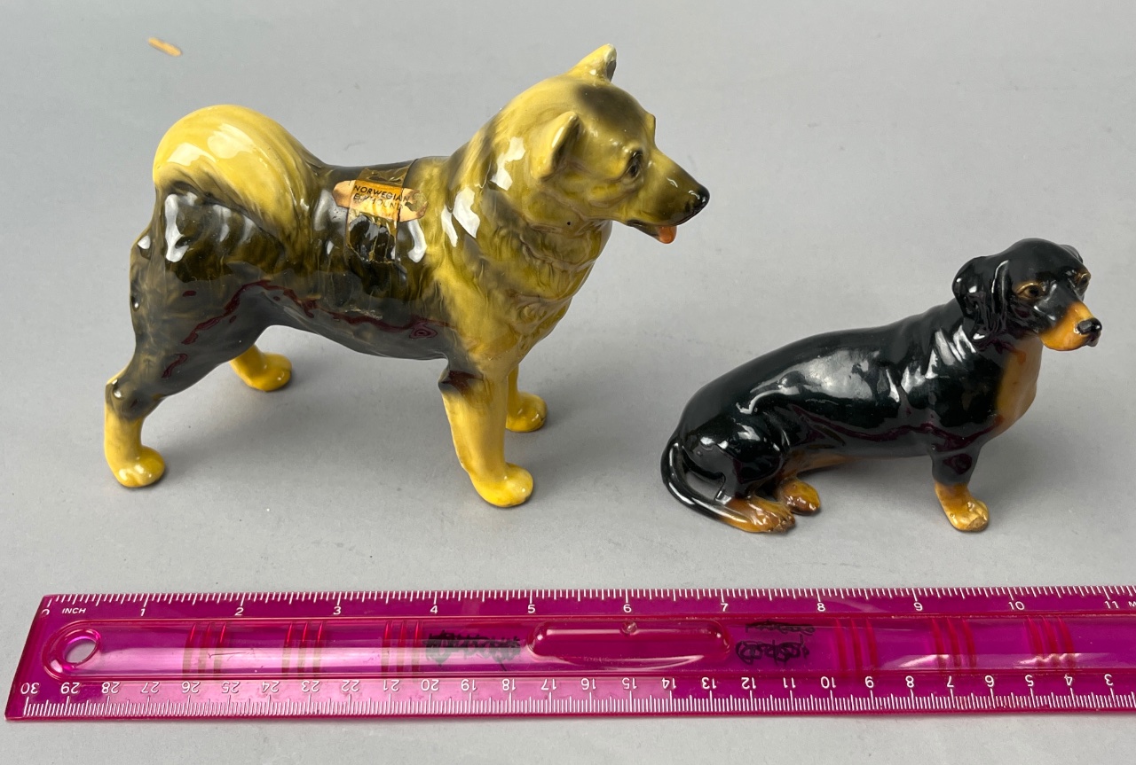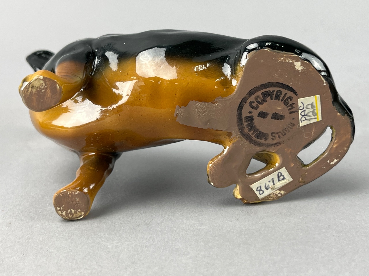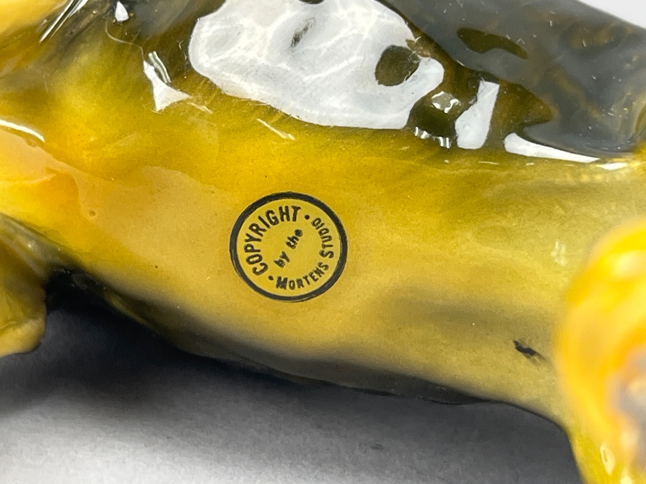 Pair of ceramic dog figurines by Mortens Studios, featuring one standing dog in yellow with black markings and one lying dog in black with brown and yellow accents. Both figurines have a glossy ceramic finish and are marked ‘COPYRIGHT by the MORTENS’ and ‘COPYRIGHT MORTENS STUDIOS 867B’. Larger dog measures about 6″ wide. CONDITION: Condition not assessed. SHIPPING: In-House Shipping Available