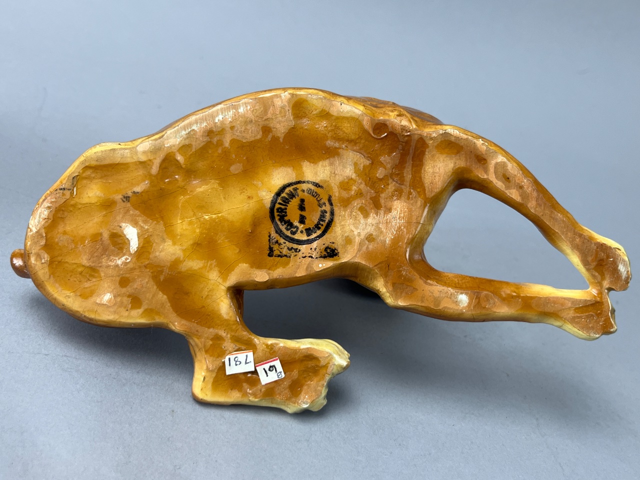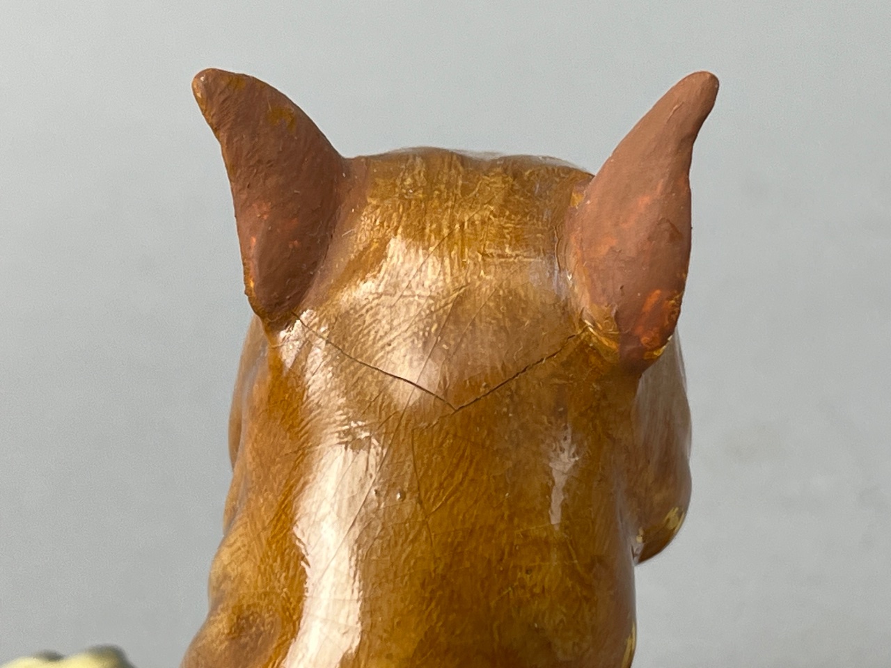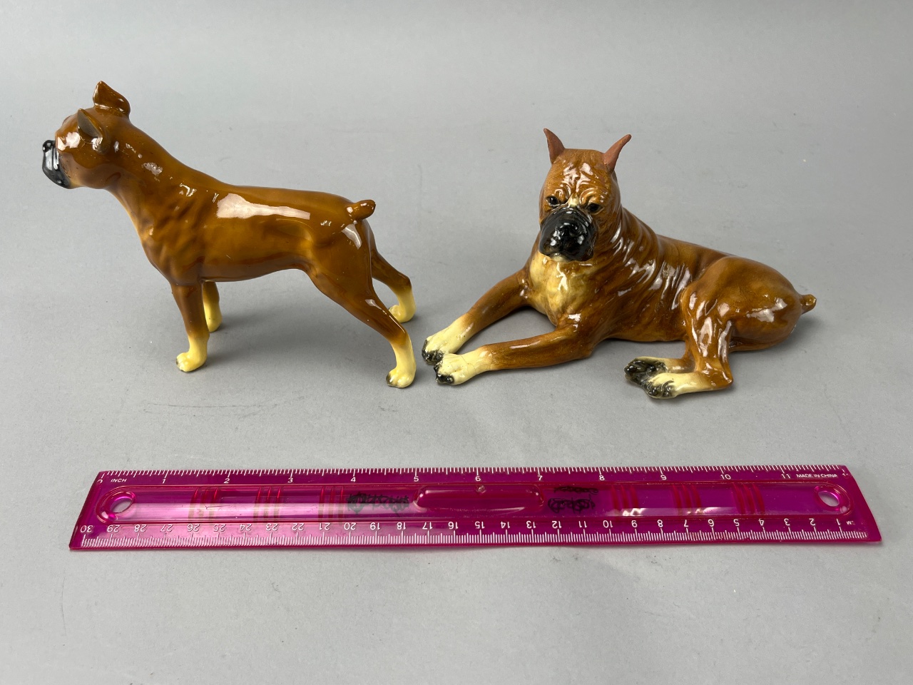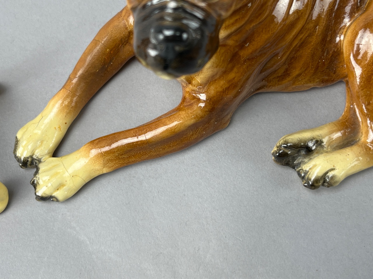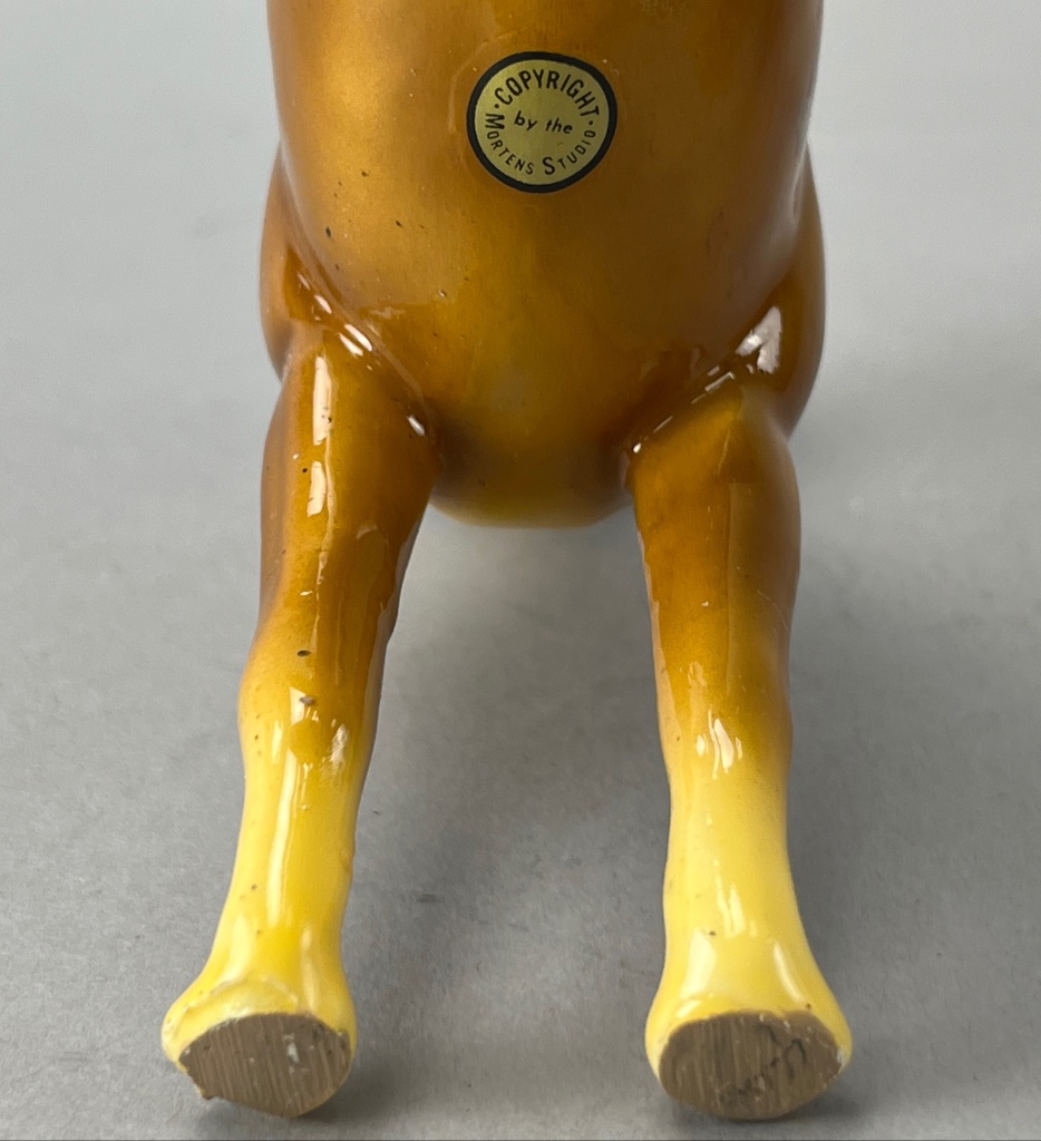 Pair of ceramic Boxer dog figurines by Mortens Studio, featuring one standing and one lying down. Both figurines have a glossy brown and black finish, with yellow-tipped legs on the standing dog and a similar color pattern on the lying dog. The underside of each figurine bears a mark reading ‘COPYRIGHT by the Mortens Studio.’ Both dog measure 4-5″ long. CONDITION: Both dogs have visible cracks on top of their heads as shown in photos. SHIPPING: In-House Shipping Available