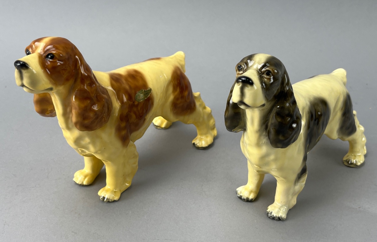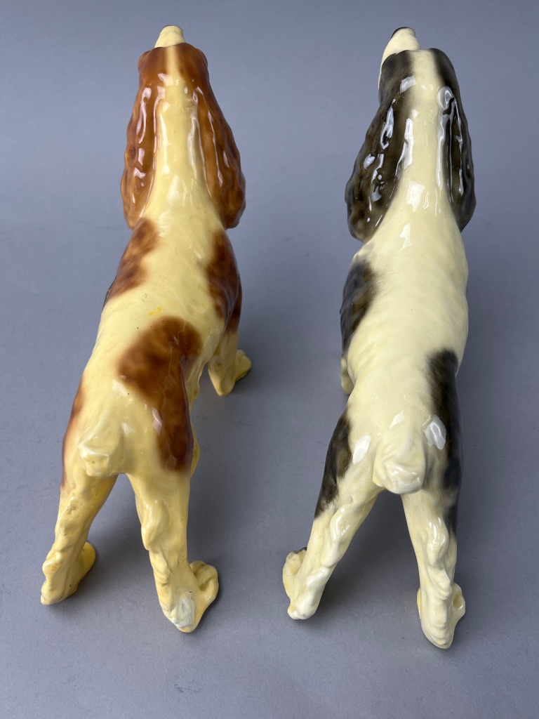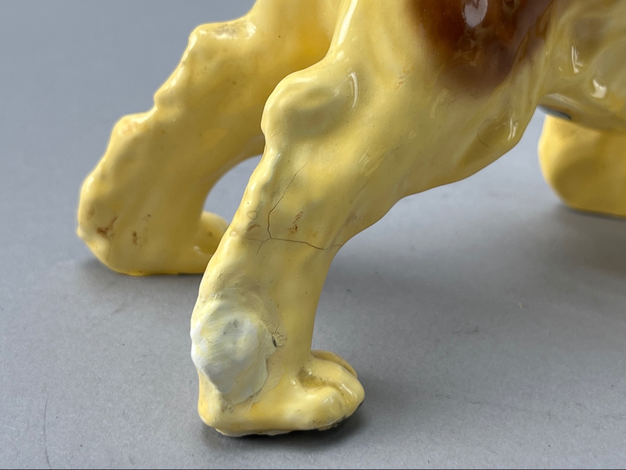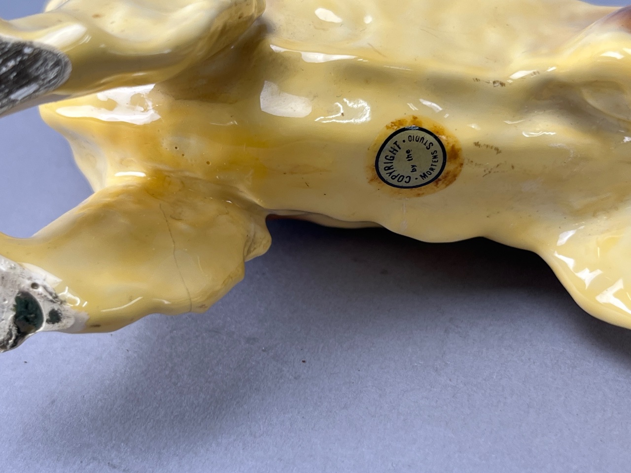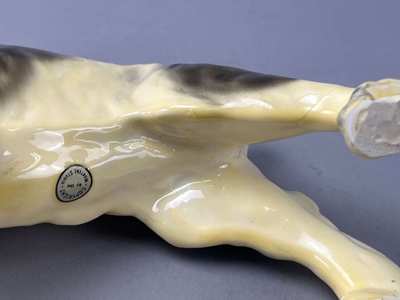 Mortens ceramic Cocker Spaniel figurines featuring a yellow glaze with black accents on the paws and ears. The surface displays a crackle finish, and the underside is marked ‘Mortens.’ The figurine rests on a circular base with a smooth finish. Measures 8.5″L each. CONDITION: Small chip on the legs and wear to the glaze on the paws of both dogs. SHIPPING: In-House Shipping Available
