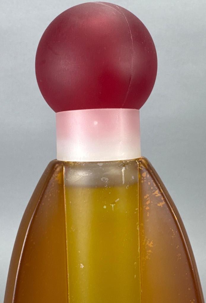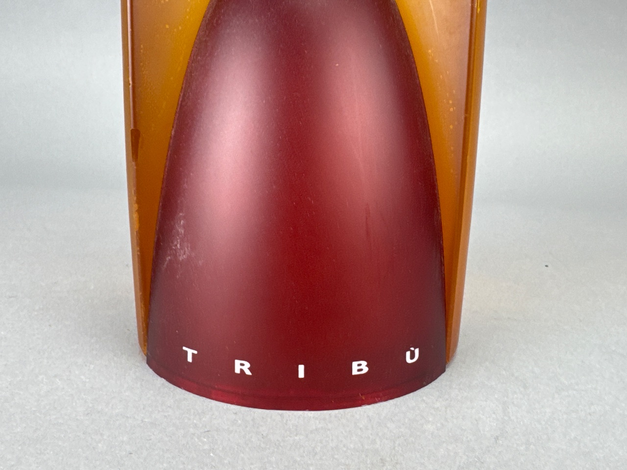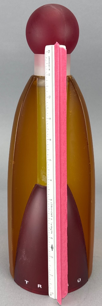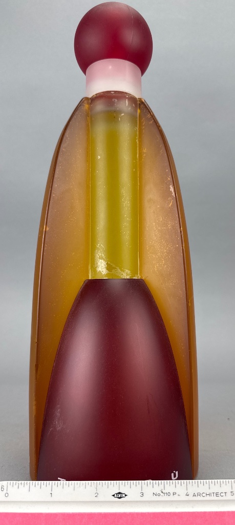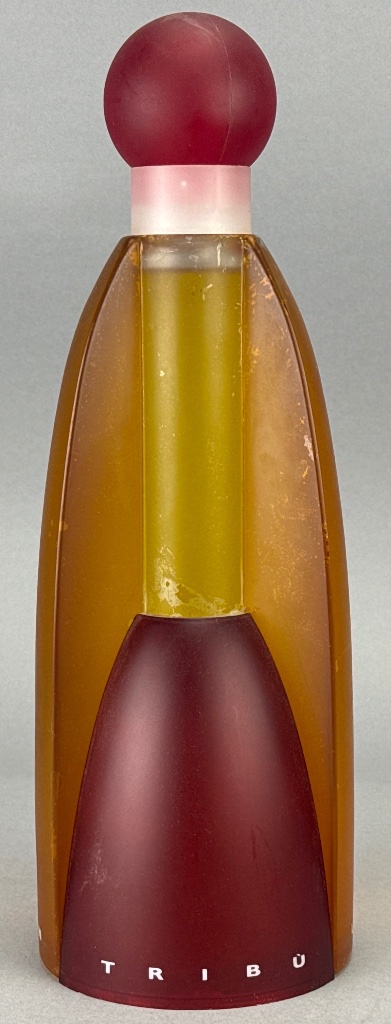 United Colors of Benetton Tribü fragrance display bottle, released in 1993. Tall cylindrical glass bottle with amber and red color scheme, rounded top, and bulbous frosted red cap. Marked ‘TRIBÜ’ on the base, with branding from United Colors of Benetton. Designed with inspiration from an Indian totem pole, Eiffel Tower, and test tube. Measures 13″H x 3.5″L. CONDITION: Minor surface scratches visible on the body. Some wear on the text at the base. SHIPPING: Local Pickup or 3rd Party Shipping Only