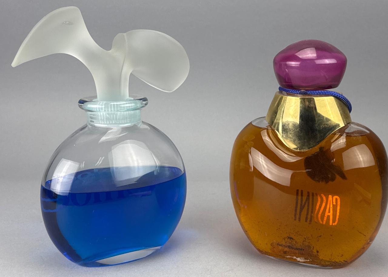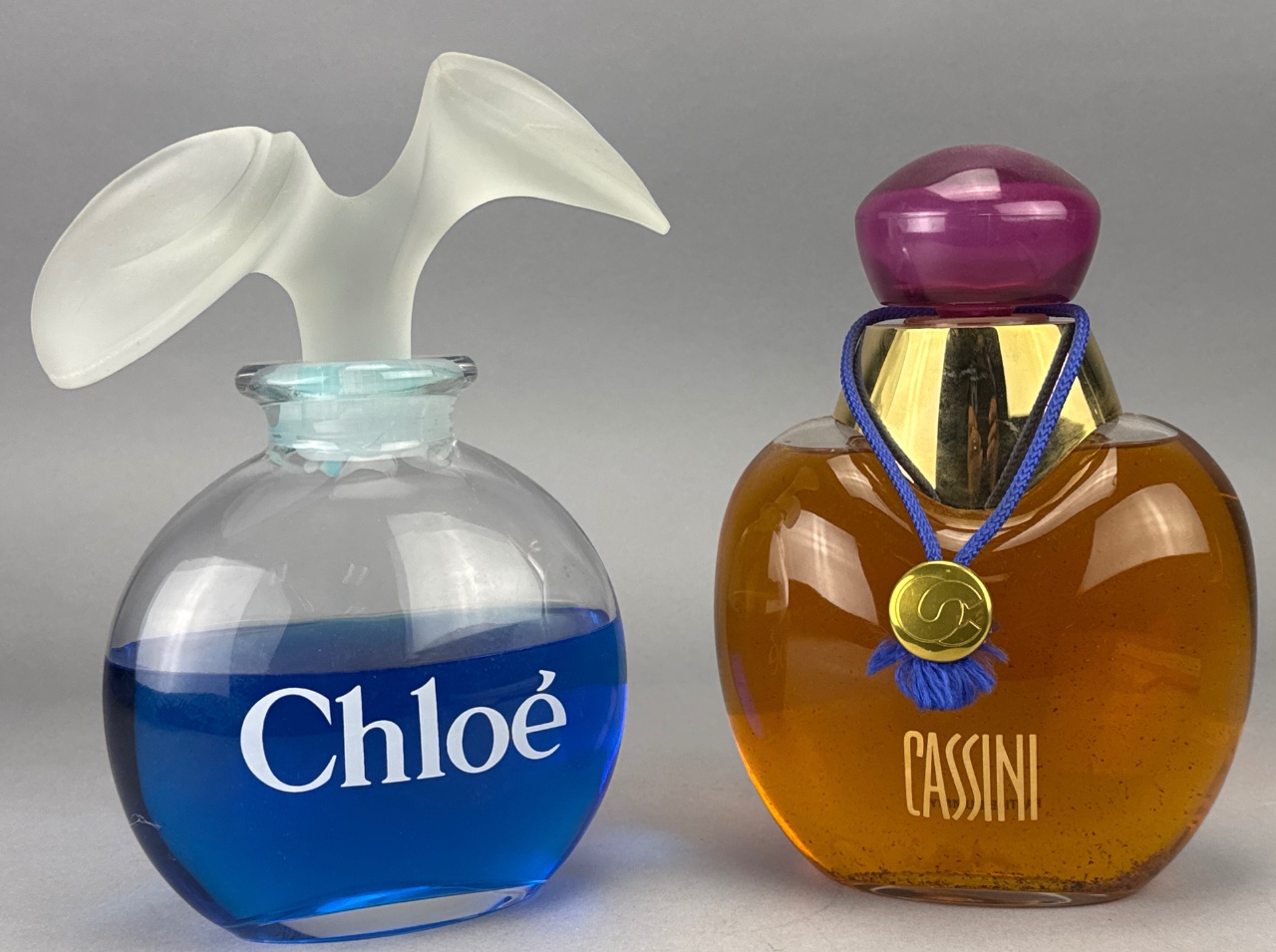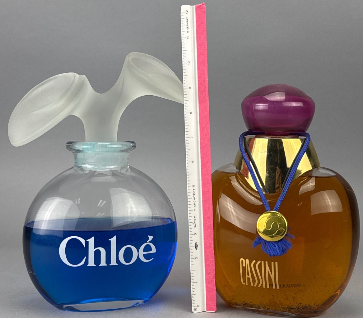 Pair of glass perfume display bottles, including one with frosted glass top and blue liquid marked ‘Chloé’ in white, and one with rounded shape, purple cap, gold neck, and amber liquid marked ‘CASSINI’ in gold. Both measure 5"W. CONDITION: Fragrance contents have not been tested or evaluated. Due to age and storage conditions, scents may have degraded, altered, or dissipated. These items are being sold as-is, with primary value attributed to the bottle and display qualities rather than the fragrance itself. No guarantees are made regarding scent, usability, or condition of contents.