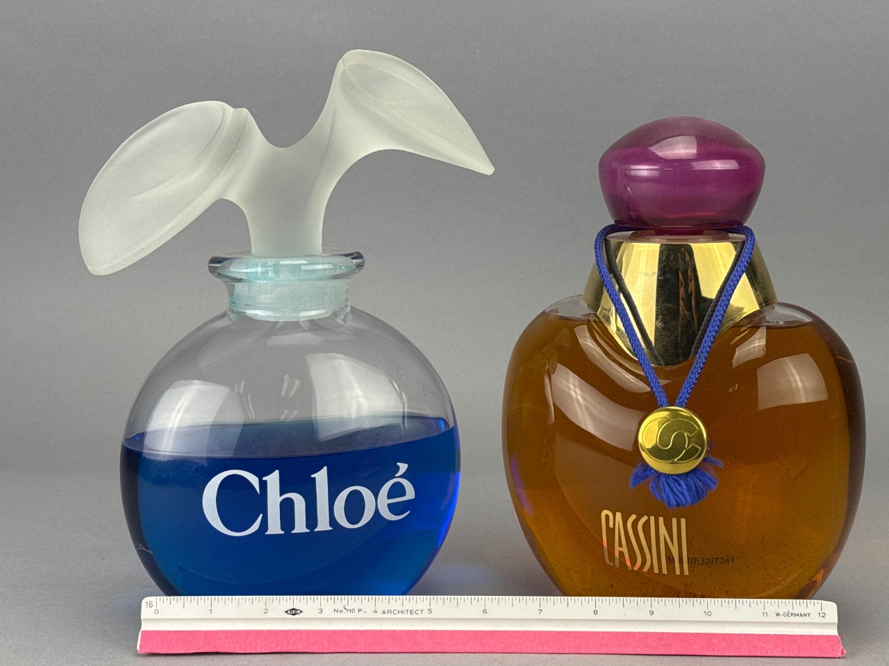 Pair of Glass Perfume Display Bottles, Chloé and Cassini