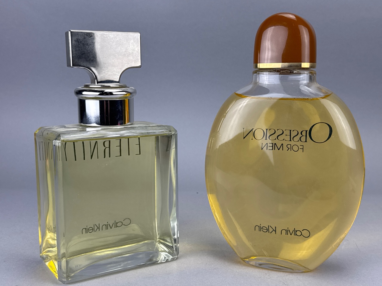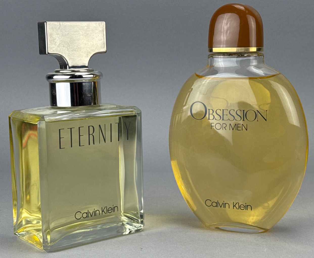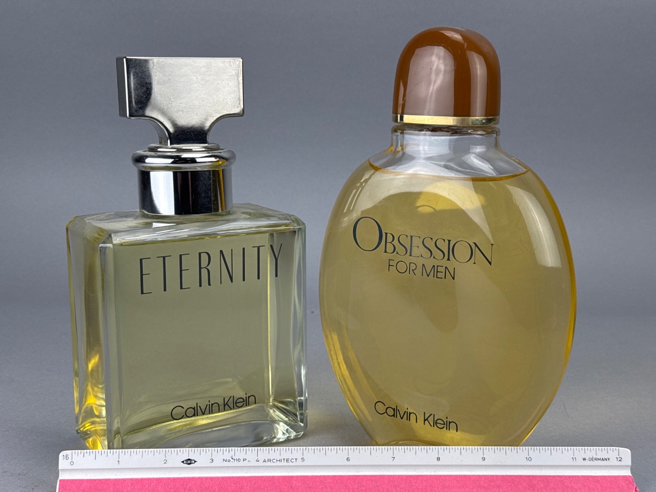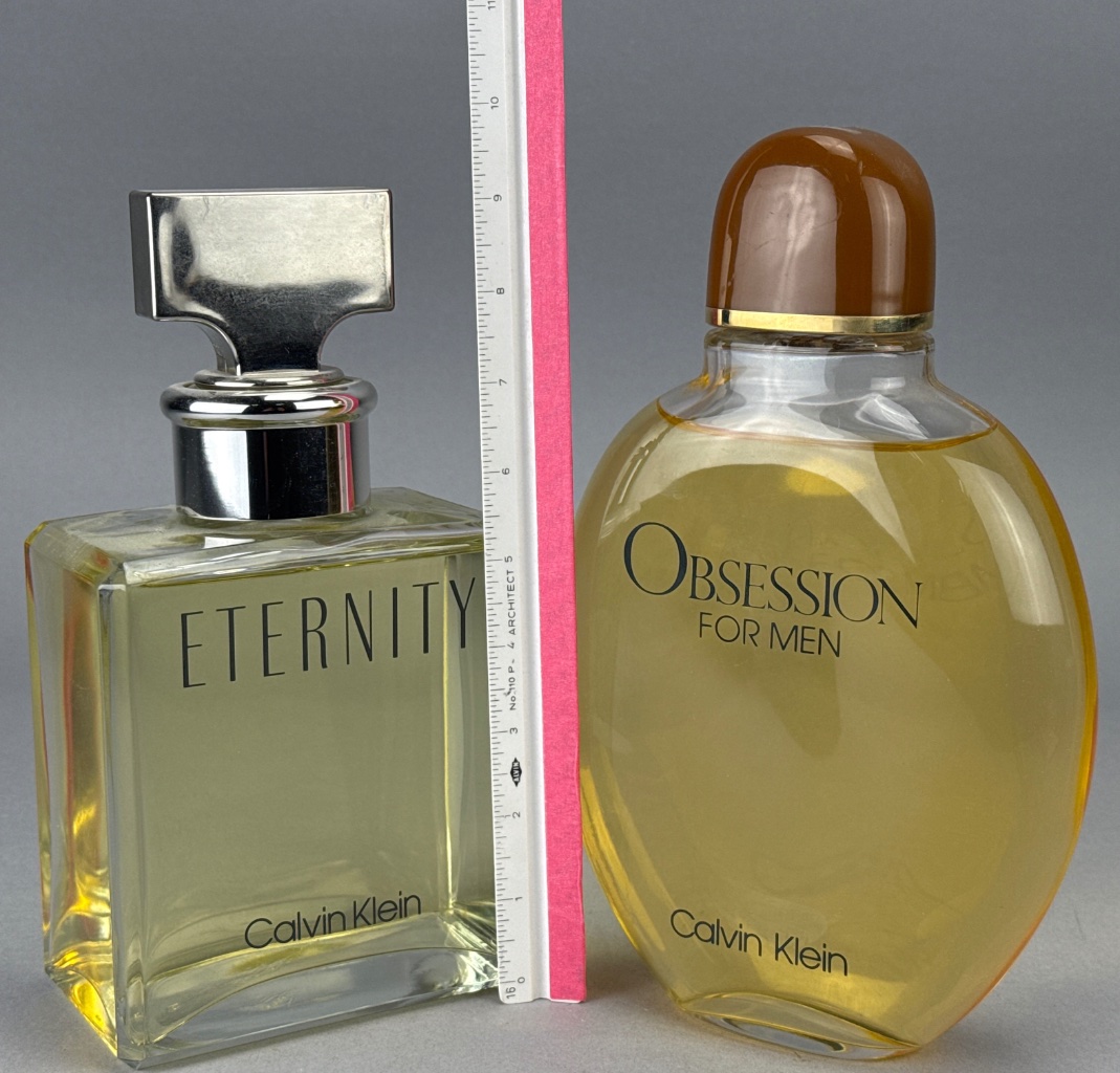 Pair of Calvin Klein glass perfume display bottles labeled ‘ETERNITY’ and ‘OBSESSION FOR MEN’. Both bottles feature ‘Calvin Klein’ branding printed on the front, with a silver cap on the Eternity bottle and a brown cap on the Obsession for Men bottle. Measure 5"W. CONDITION: Fragrance contents have not been tested or evaluated. Due to age and storage conditions, scents may have degraded, altered, or dissipated. These items are being sold as-is, with primary value attributed to the bottle and display qualities rather than the fragrance itself. No guarantees are made regarding scent, usability, or condition of contents.