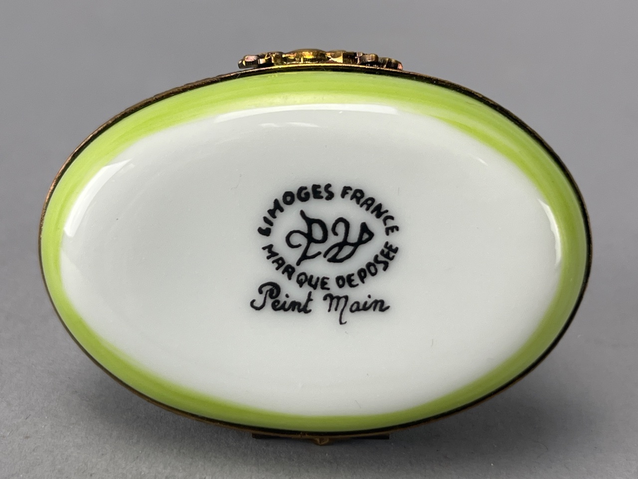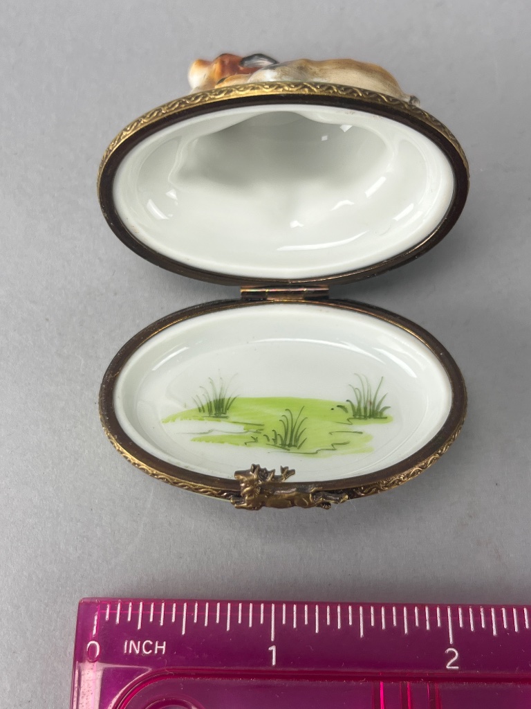 Limoges porcelain trinket box featuring a hand-painted deer figurine on a green grass-like base. The box is accented with gold-tone metal trim and bears the mark ‘LIMOGES FRANCE MARQUE DEPOSEE Peint Main’ on the base. Measures 2″L. CONDITION: Minor wear to the gold-tone trim. No visible chips or cracks observed. SHIPPING: In-House Shipping Available