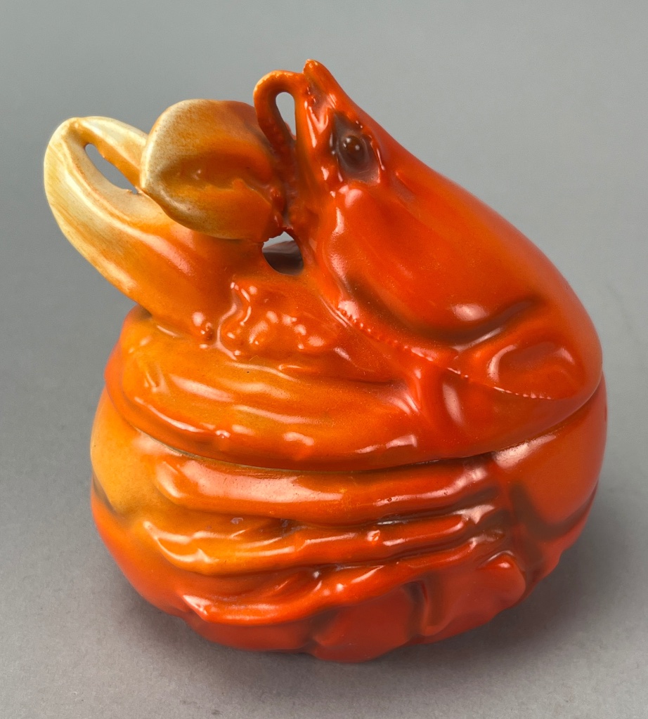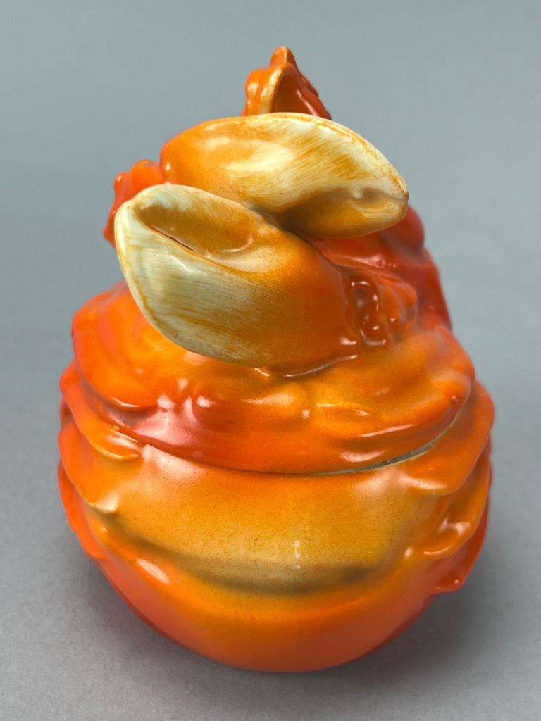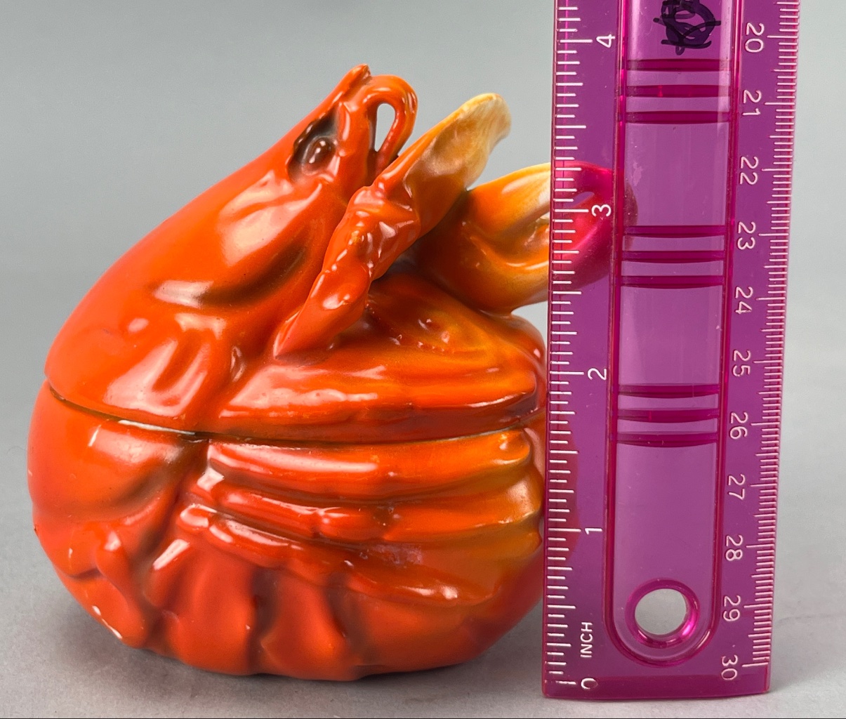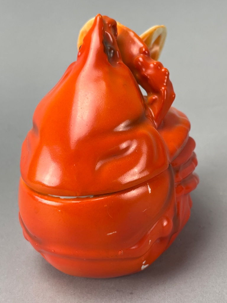 Ceramic container shaped like a lobster with a glossy orange and yellow glaze. The lid features a lobster claw and head, and the interior is white and smooth. Measure 3.5″H. CONDITION: Visible crack on the interior rim of the container. SHIPPING: In-House Shipping Available