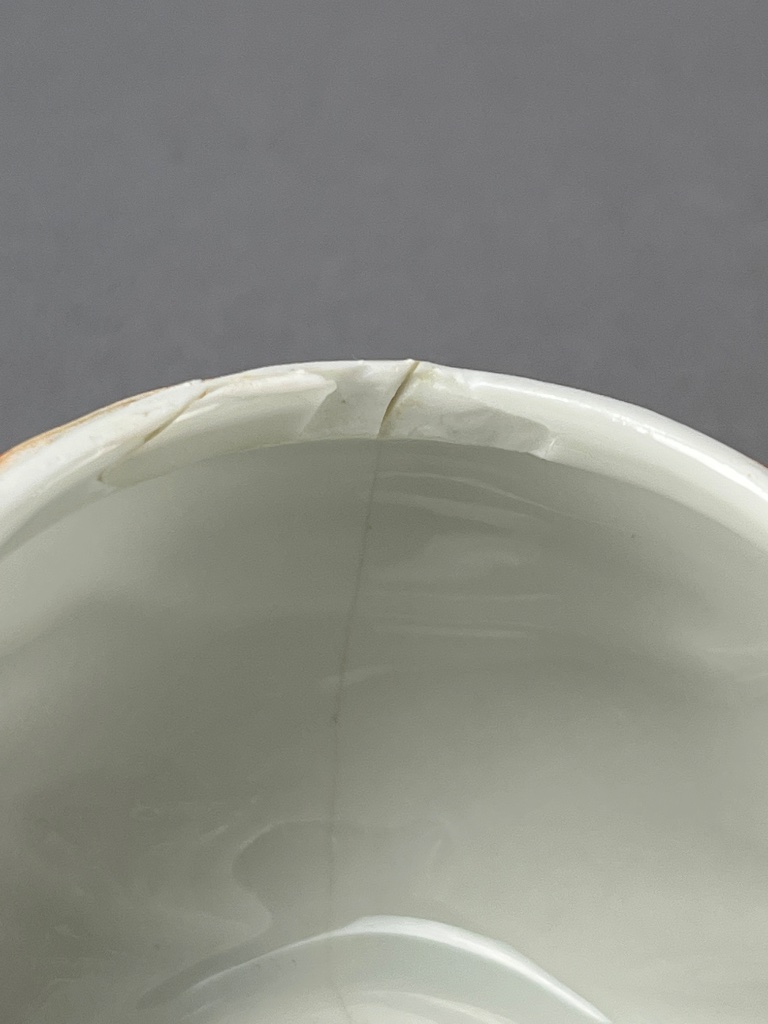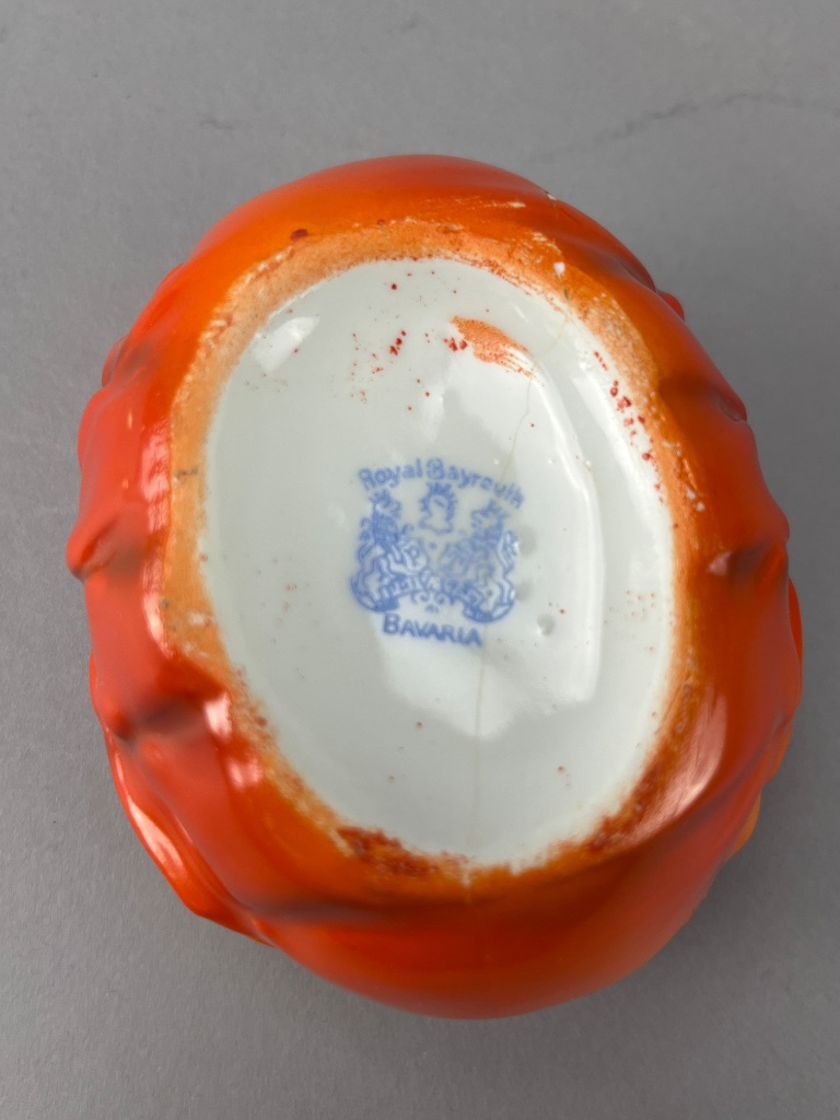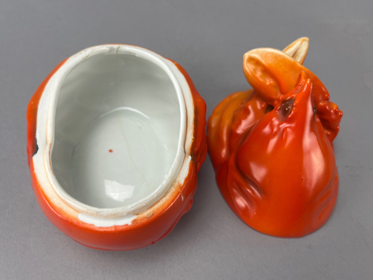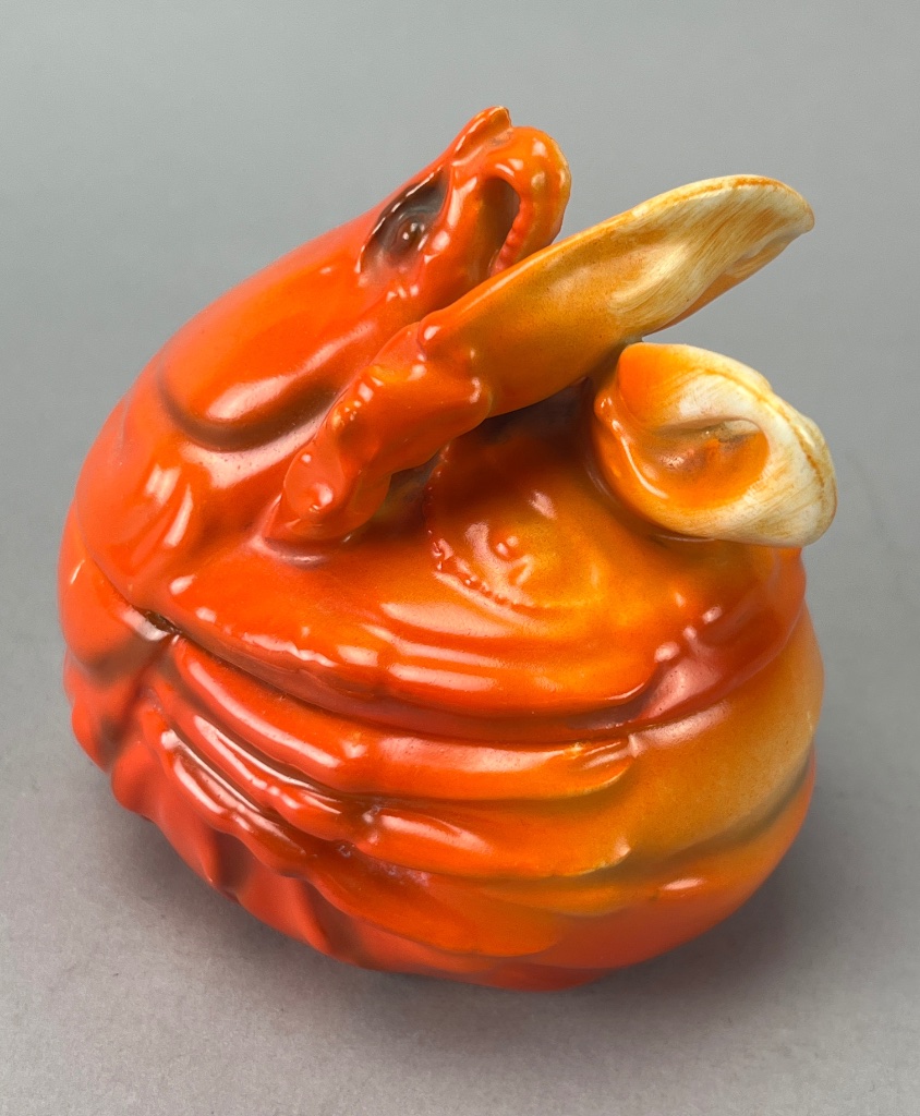 Ceramic container shaped like a lobster with a glossy orange and yellow glaze. The lid features a lobster claw and head, and the interior is white and smooth. Measure 3.5″H. CONDITION: Visible crack on the interior rim of the container. SHIPPING: In-House Shipping Available