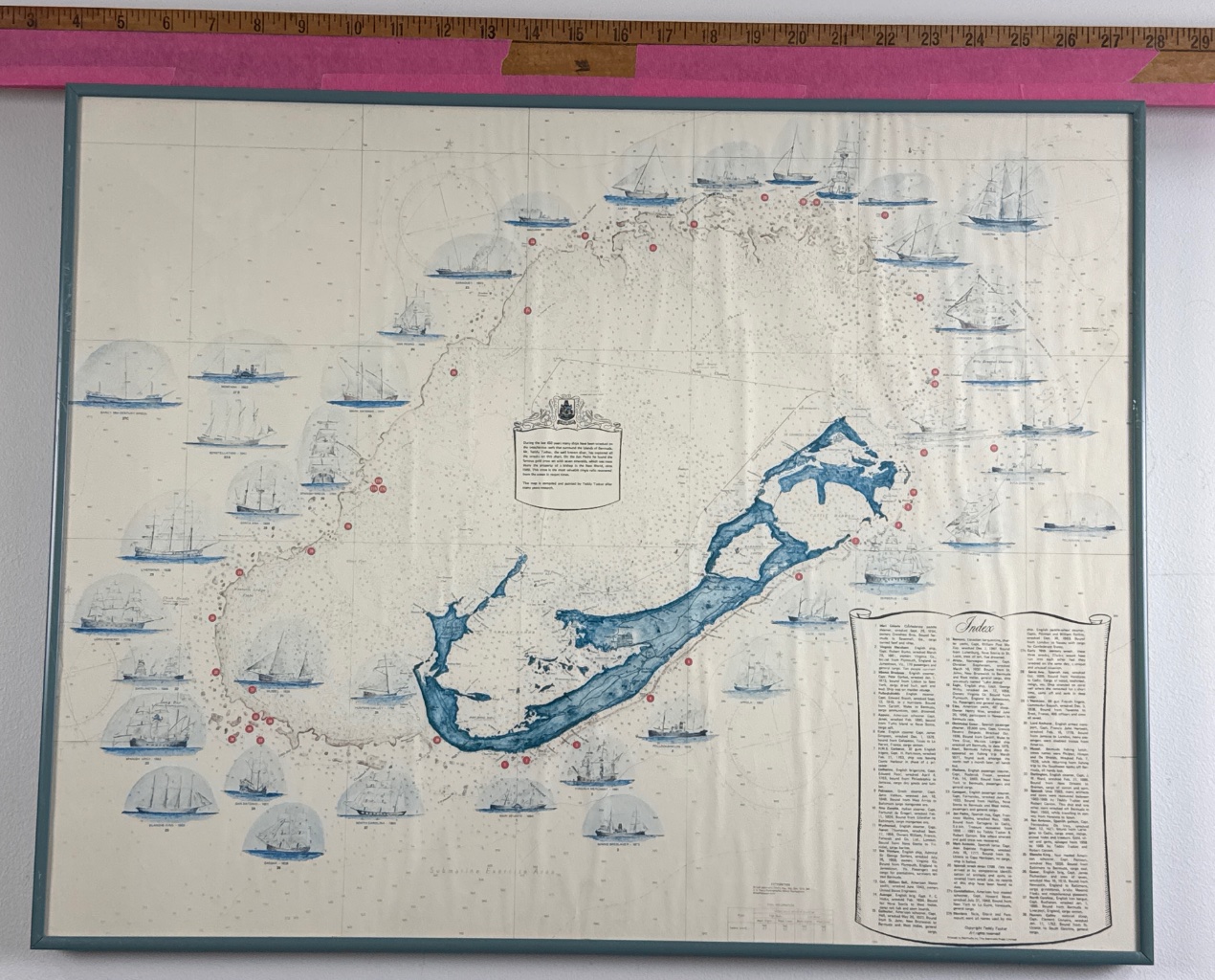 Framed nautical map of Bermuda with shipwreck index, compiled and painted by Teddy Tucker. The map features illustrated sailing ships, a central legend detailing shipwrecks, tidal information, and historical text. Printed on textured paper with copyright text reading ‘Copyright Teddy Tucker / All rights reserved.’ Measure 23″W. CONDITION: Map appears to be in good condition with no visible tears or significant wear. Frame shows minor signs of wear. SHIPPING: In-House Shipping Available