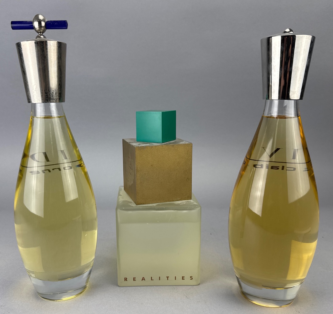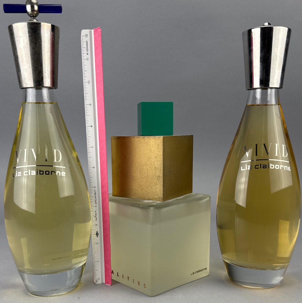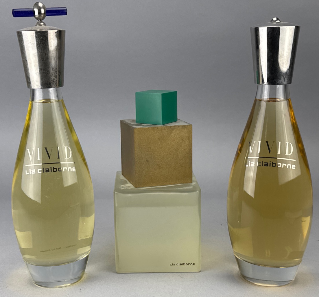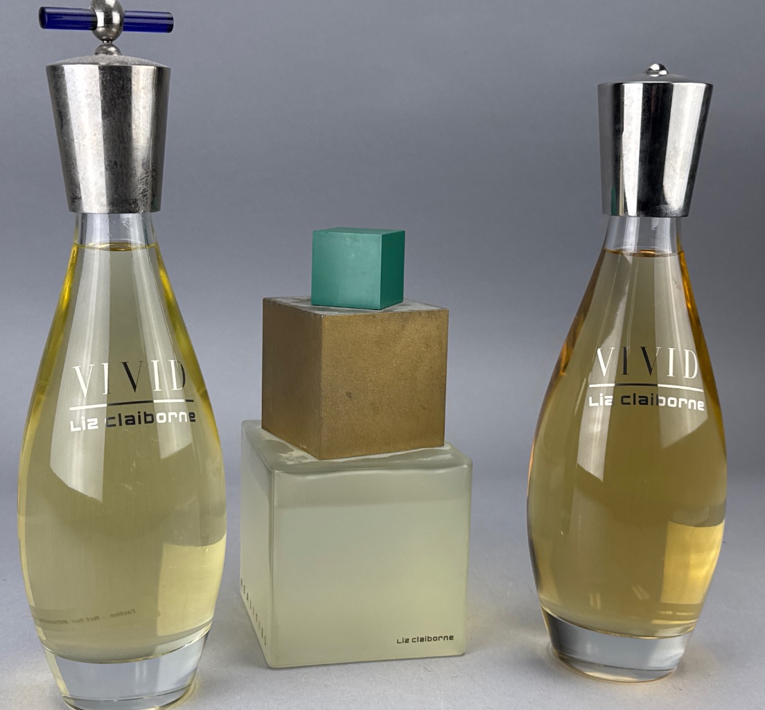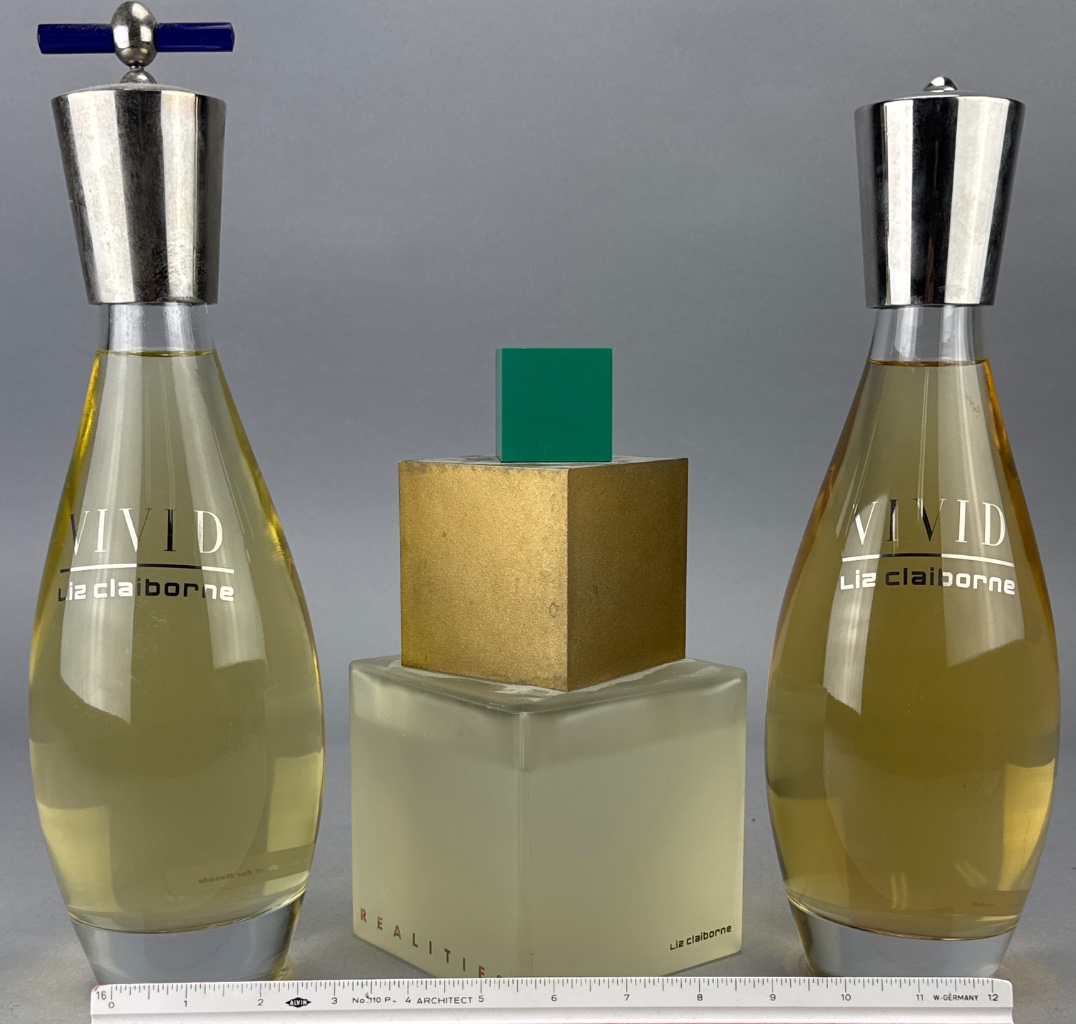 Liz Claiborne perfume bottle set featuring three glass bottles. Two bottles are labeled ‘VIVID Liz Claiborne’ with teardrop shapes and metallic caps, while the middle bottle is labeled ‘REALITIES’ with a square base and green cube-shaped cap. Taller bottles measure 12"H.