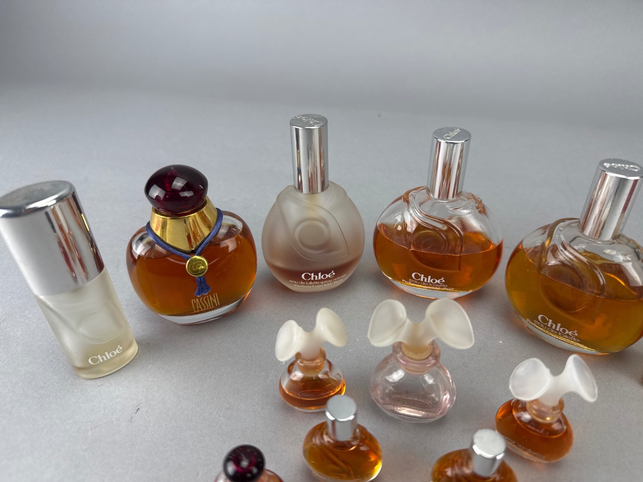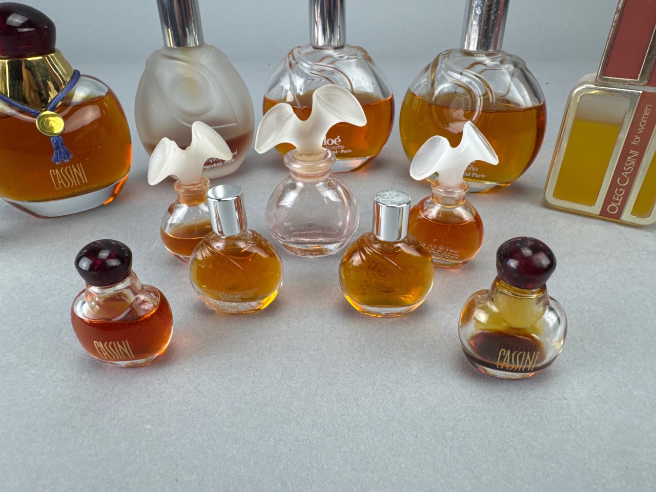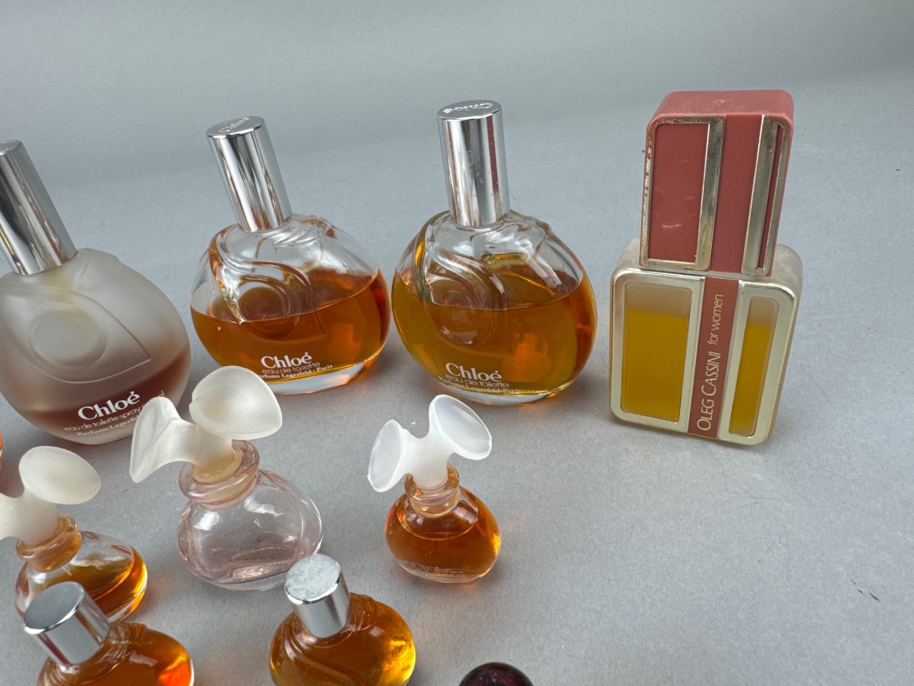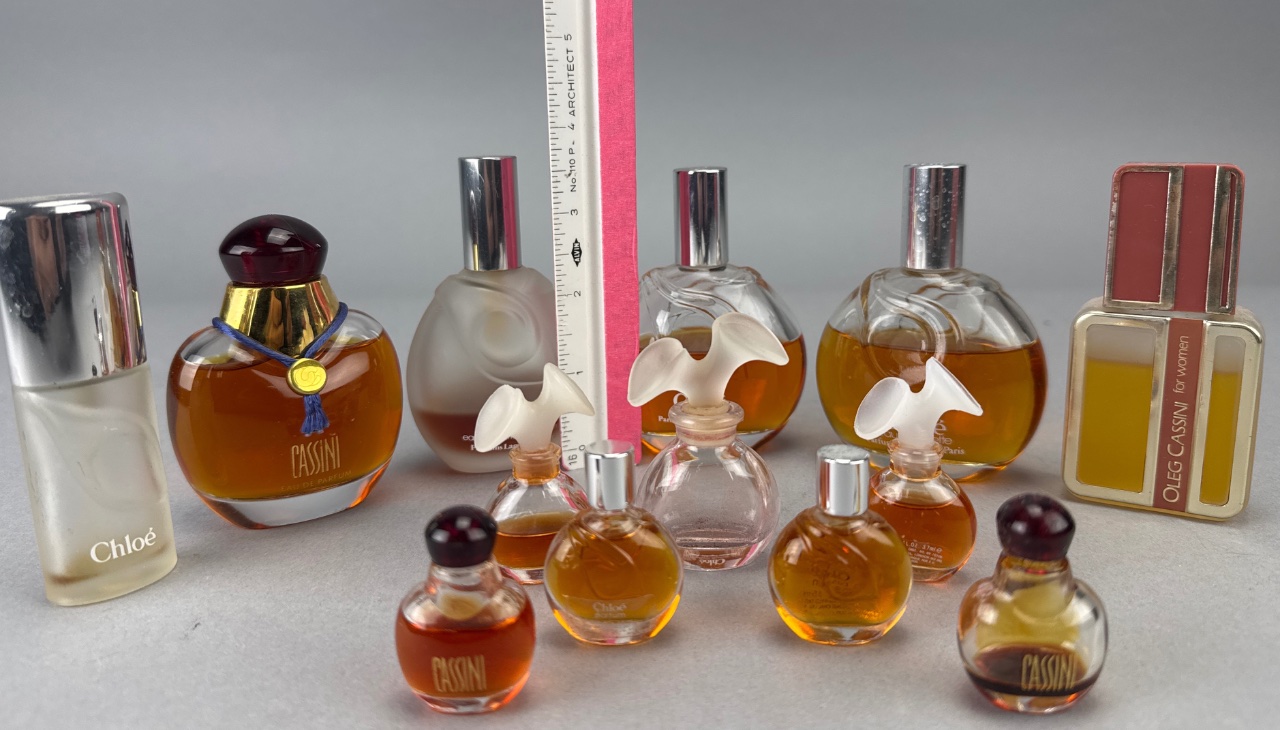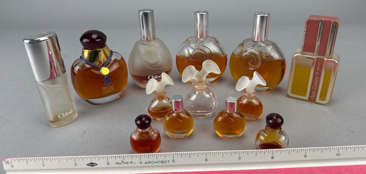 Assortment of glass perfume bottles, including examples labeled ‘Chloé’ and ‘Oleg Cassini’. Some bottles feature decorative caps, including a red and gold cap. Amber liquid visible in several bottles. Measure 1"-4"H. CONDITION: Fragrance contents have not been tested or evaluated. Due to age and storage conditions, scents may have degraded, altered, or dissipated. These items are being sold as-is, with primary value attributed to the bottle and display qualities rather than the fragrance itself. No guarantees are made regarding scent, usability, or condition of contents.