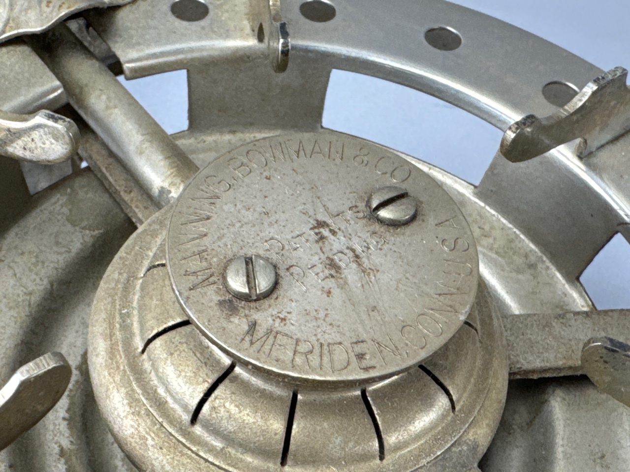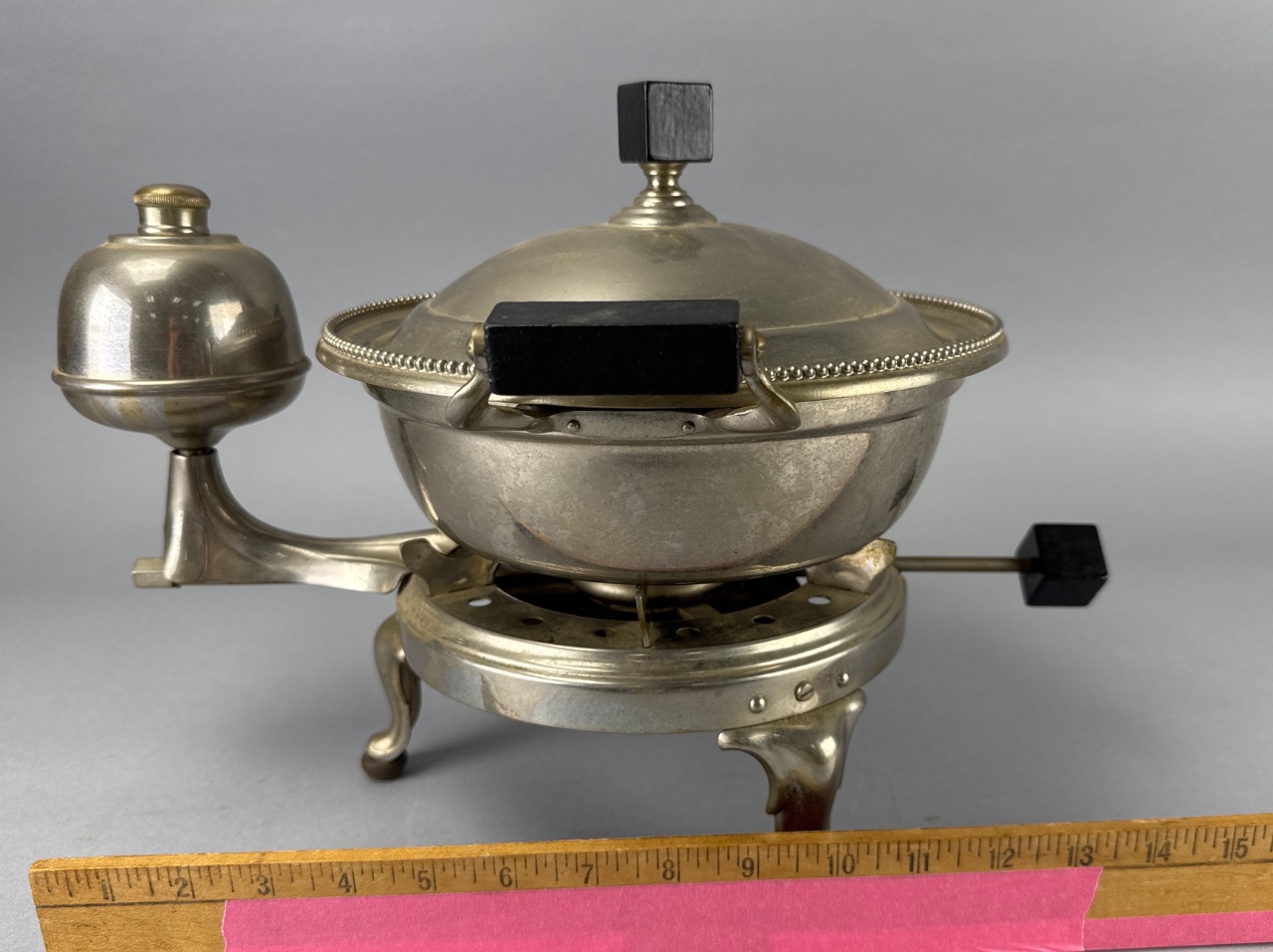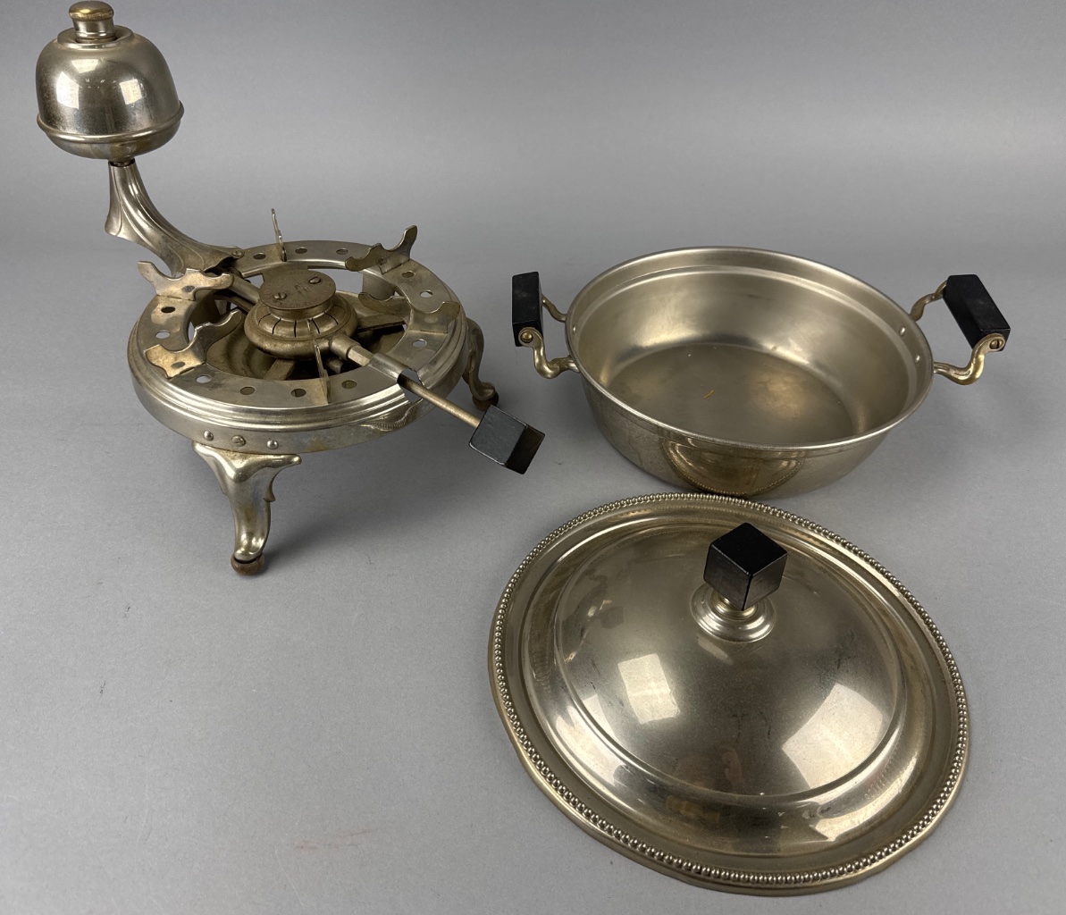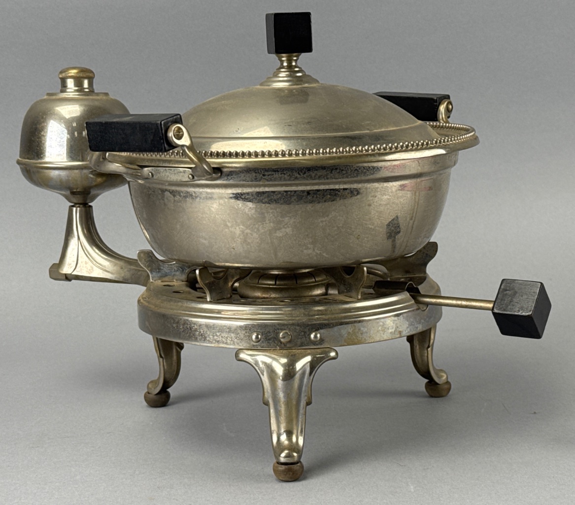 Manning Bowman & Co. metal chafing dish with burner. Features a round body with lid, four decorative legs with ball feet, and black wooden handles on the lid and pot. The burner mechanism includes a bell-shaped component and a circular opening for the heat source. Marked ‘MANNING BOWMAN & CO. MERIDEN CONN. USA’ on the burner. Measure 13″W. CONDITION: Surface wear and tarnishing visible on metal. Some scratches on the body and base. SHIPPING: In-House Shipping Available
