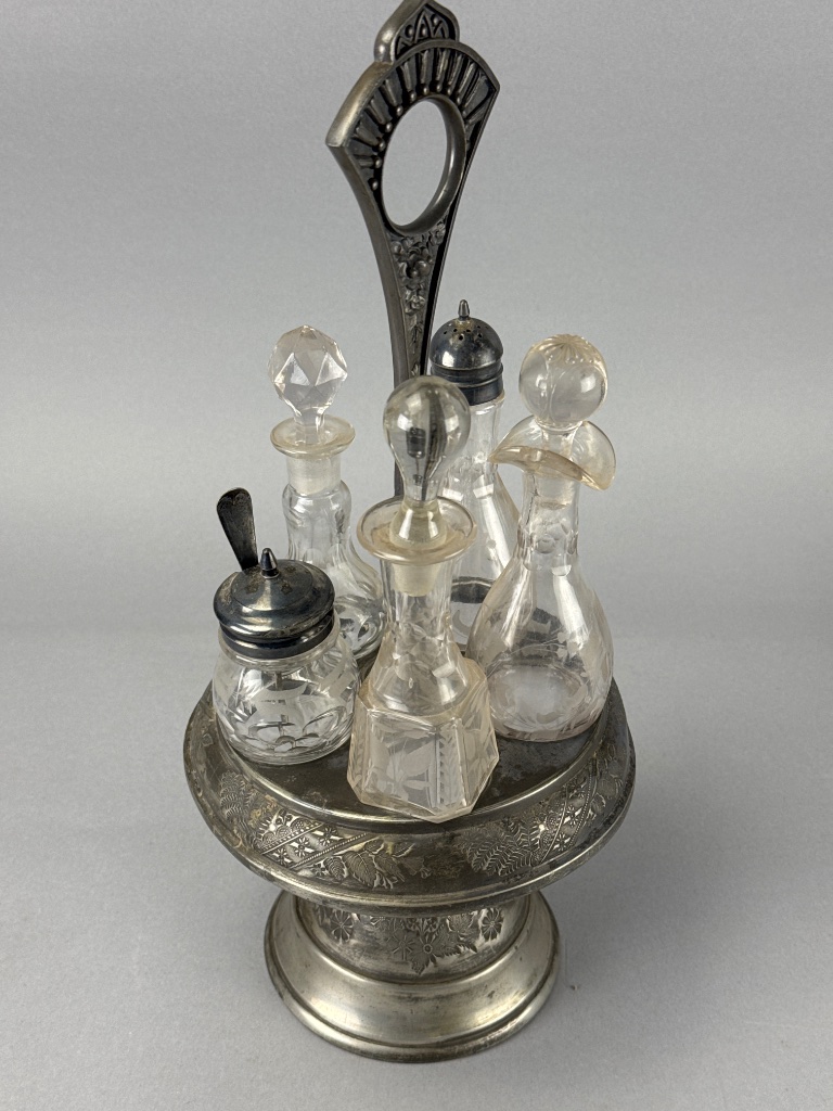 Victorian glass and metal condiment set by M. R. Co., featuring six glass bottles with stoppers arranged on a circular metal stand. The stand is decorated with floral engraving and includes a fan-shaped handle at the top. The bottles vary in shape and size, with some etched designs, one black metal lid, and one spherical clear glass stopper. Measures 16″H. CONDITION: Some surface wear on the metal stand. No visible chips or cracks on the glass bottles. SHIPPING: In-House Shipping Available