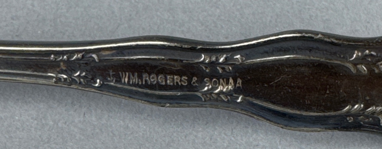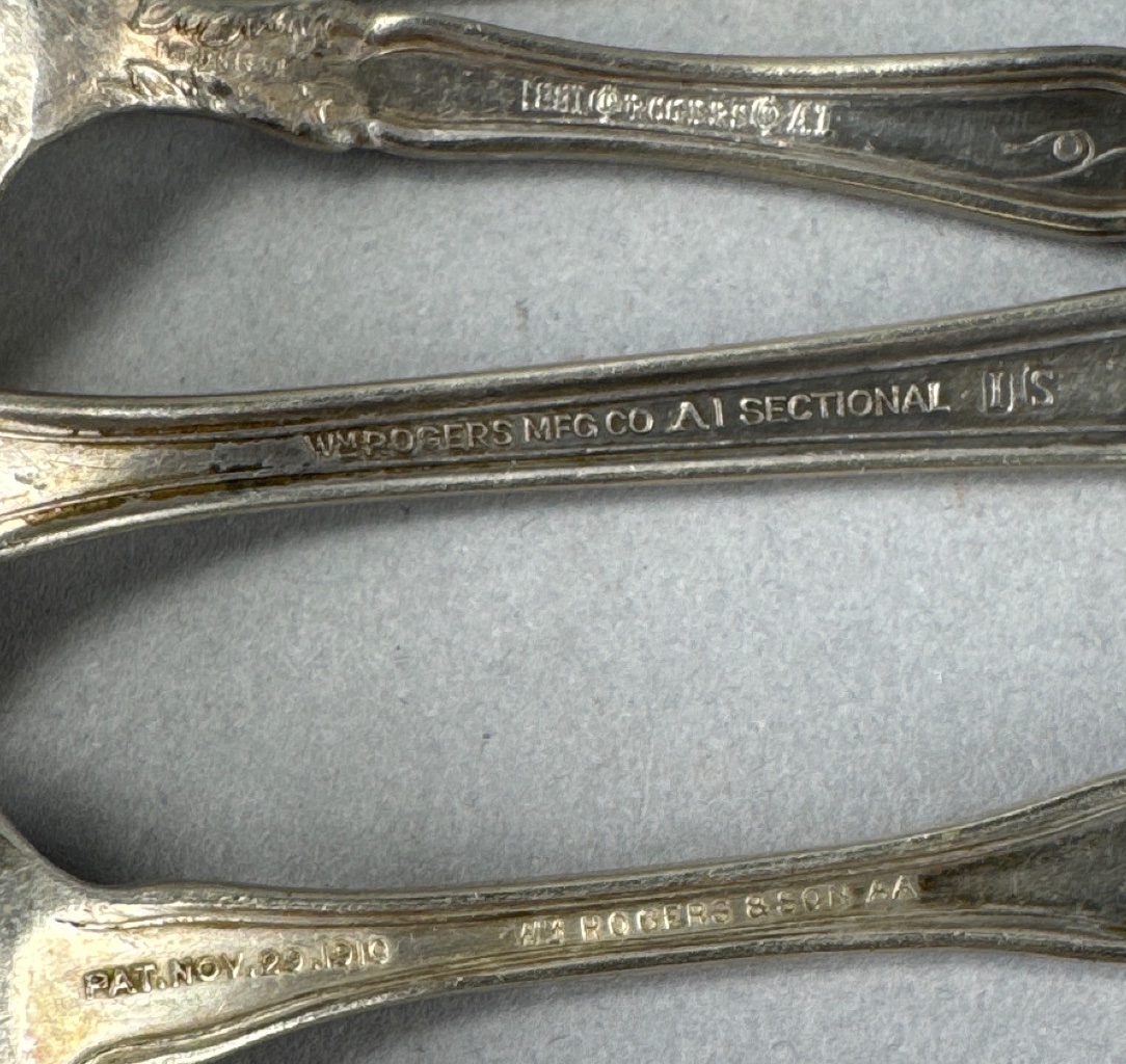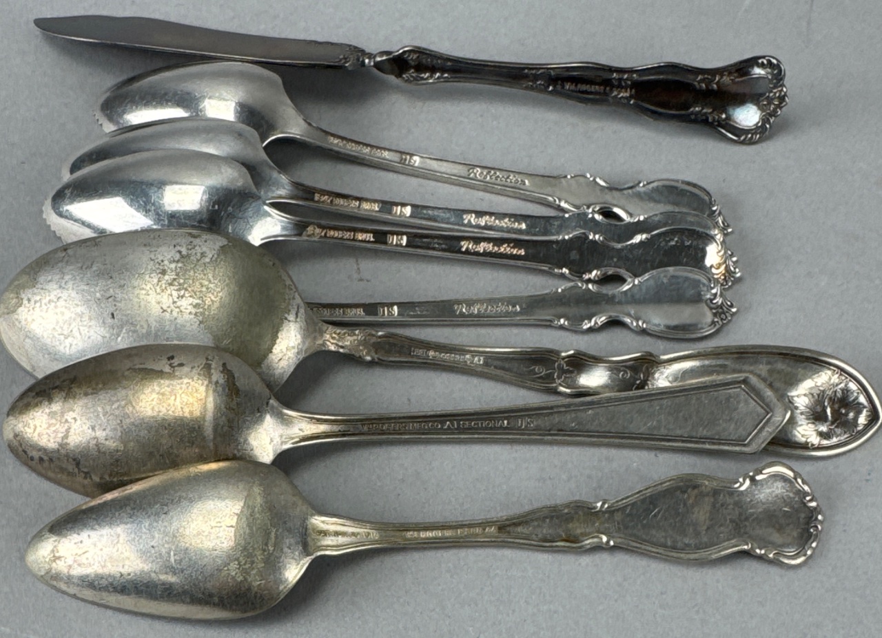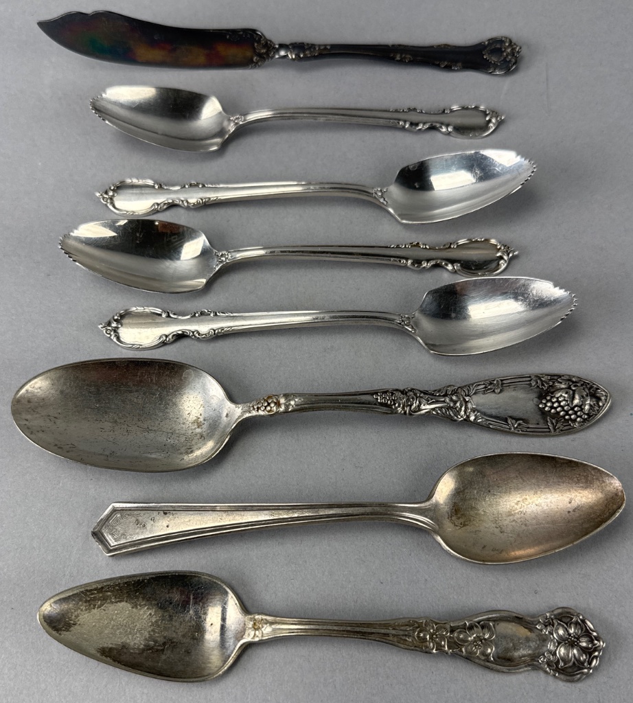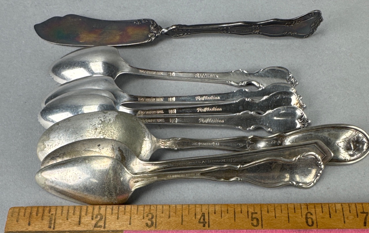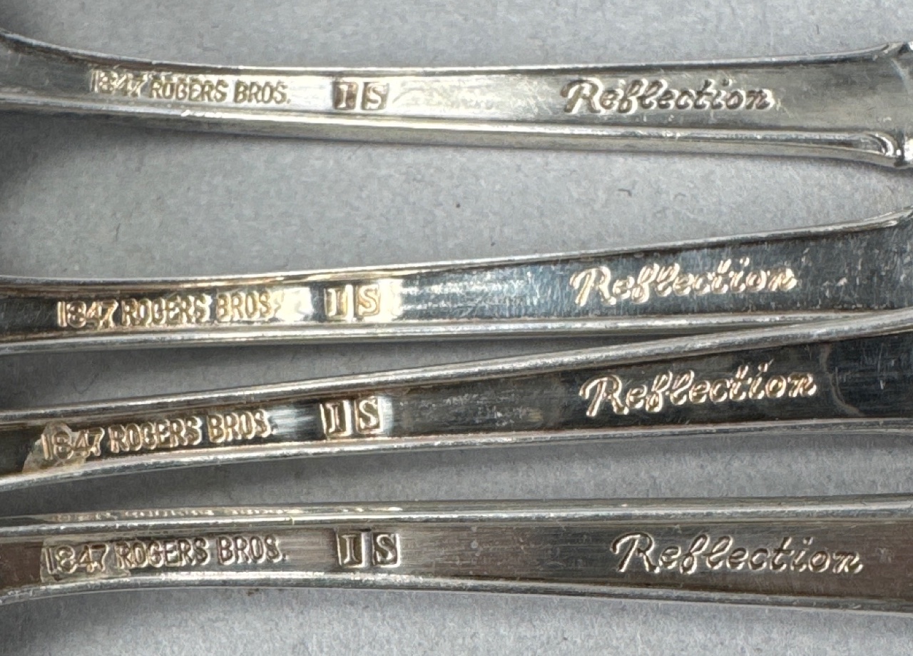 Set of eight silver-plated flatware pieces by Rogers Bros. in the Reflection pattern, produced between 1959 and 1991. Includes a butter knife, five spoons with varying designs, a serving spoon with a grape motif, and a spoon with a hexagonal handle. Marked ‘1847 Rogers Bros. Reflection’ and ‘Wm Rogers & Son A1 Sectional’ on several pieces. Measure 5″-7″L. CONDITION: Surface scratching and tarnishing visible on several pieces. Some pieces show signs of wear and discoloration. SHIPPING: In-House Shipping Available