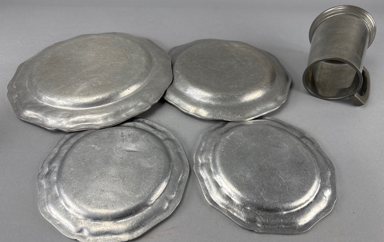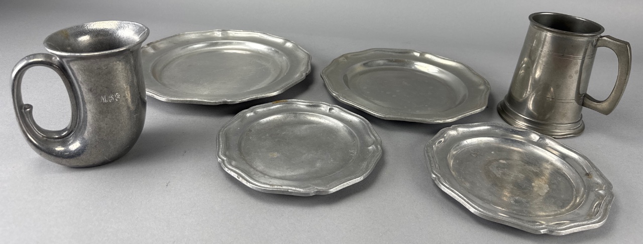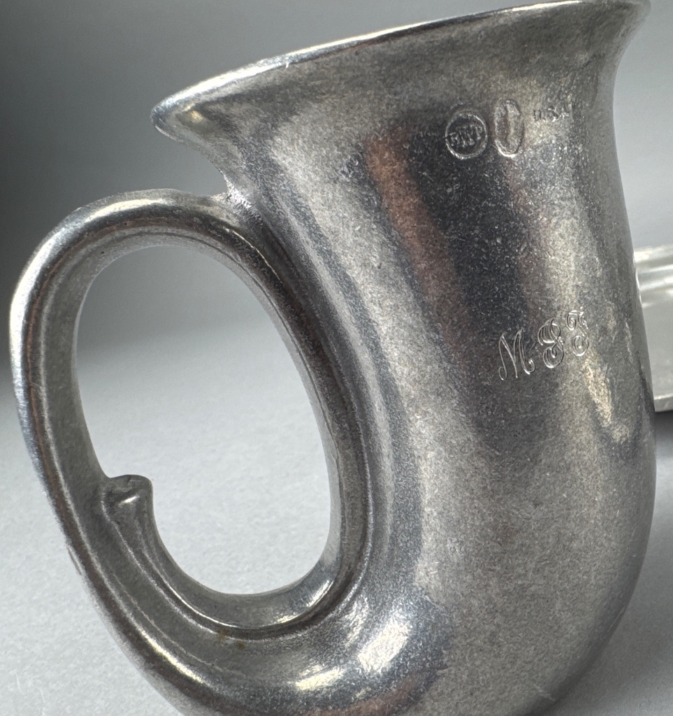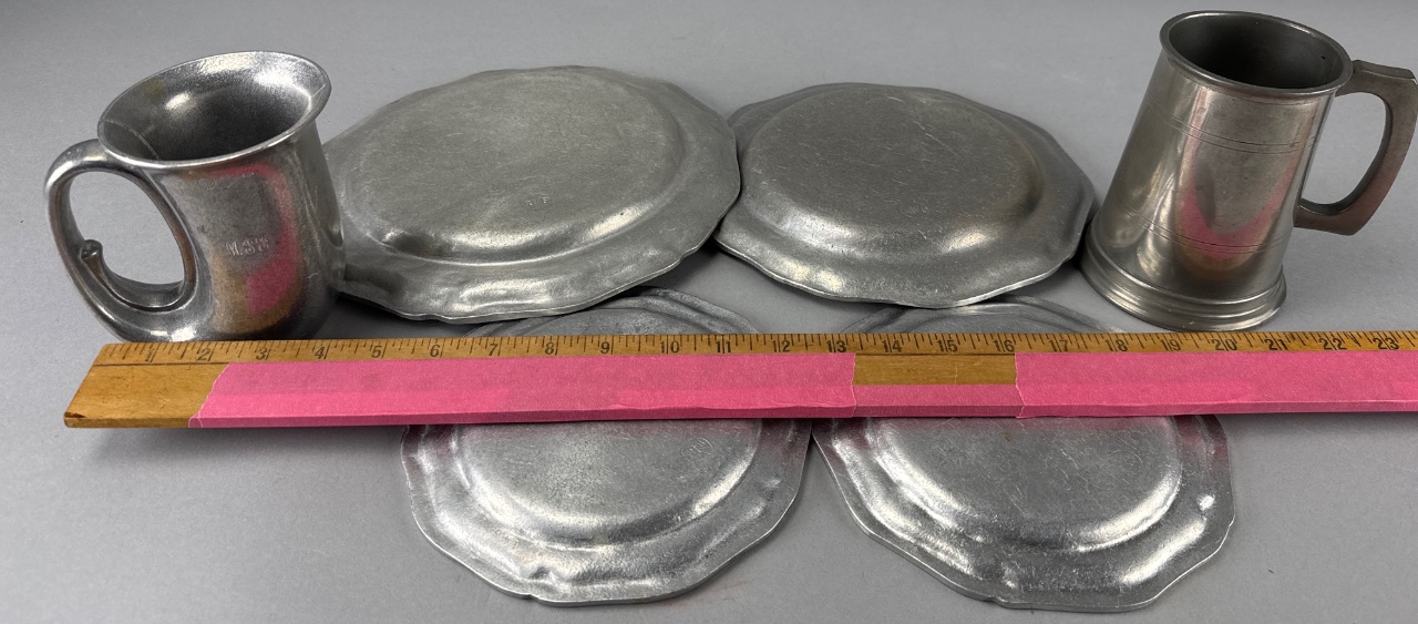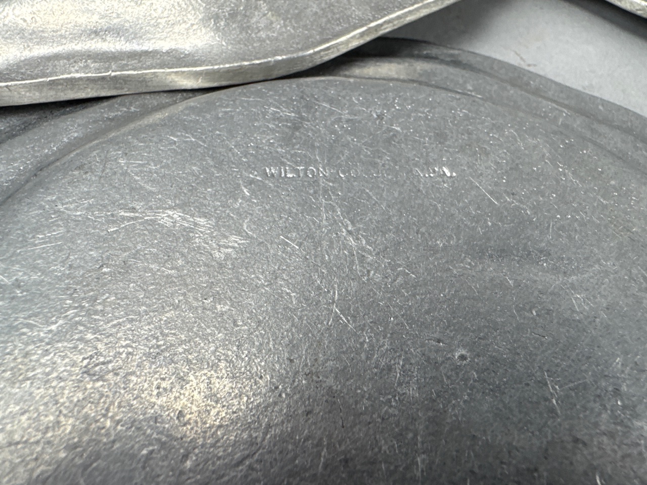 Metal pitcher and plate set, including one pitcher with a handle and spout and four plates with scalloped edges. The pitcher bears visible text reading ‘M. 83,’ while one plate is marked ‘WILTON CO. USA’ and another reads ‘R.F.’ The pitcher has a shiny, reflective surface, and the plates have a matte finish. Plates measure 7″D. CONDITION: Surface scratches visible on all items. Minor tarnishing observed on the pitcher. SHIPPING: In-House Shipping Available
