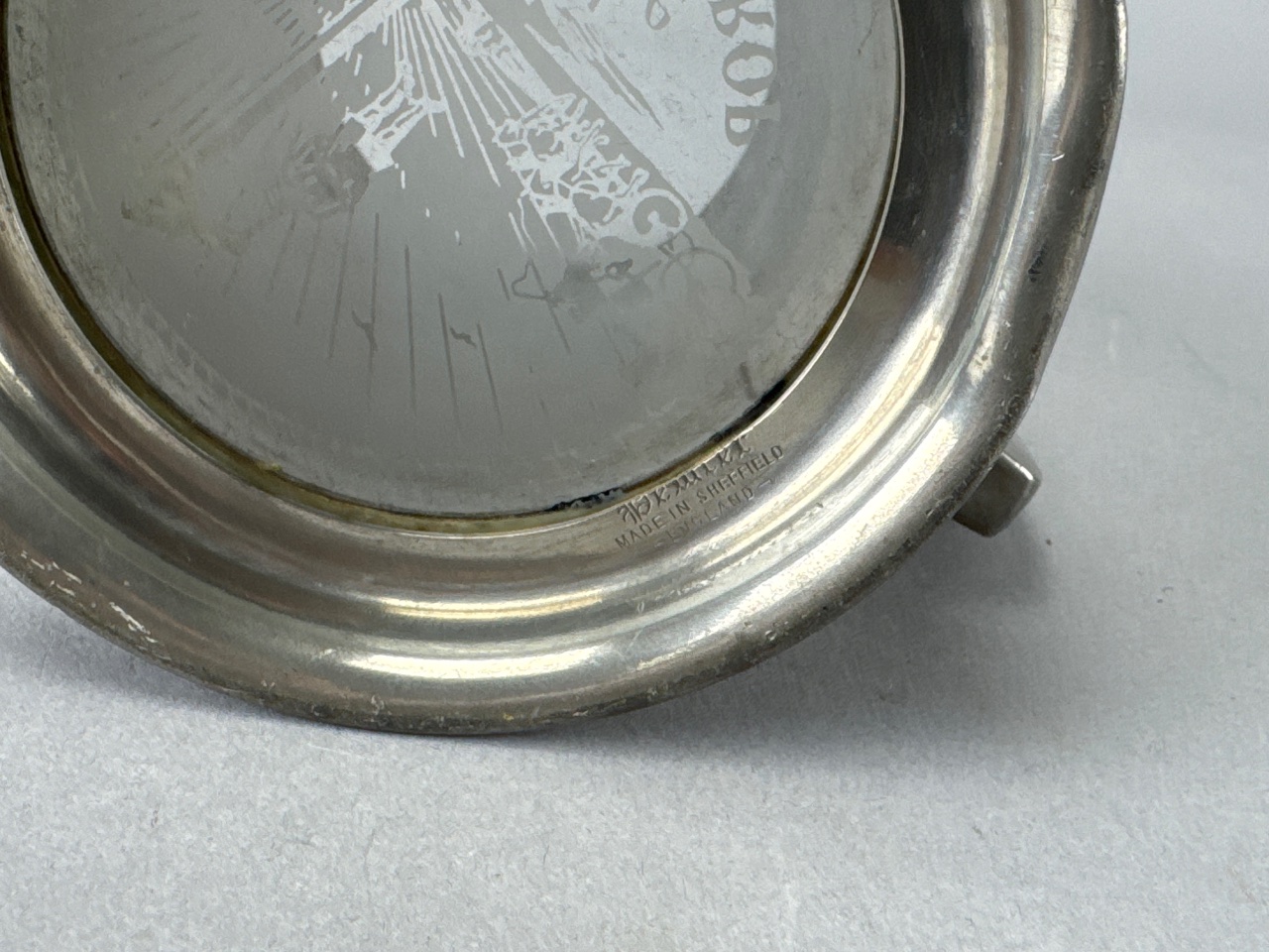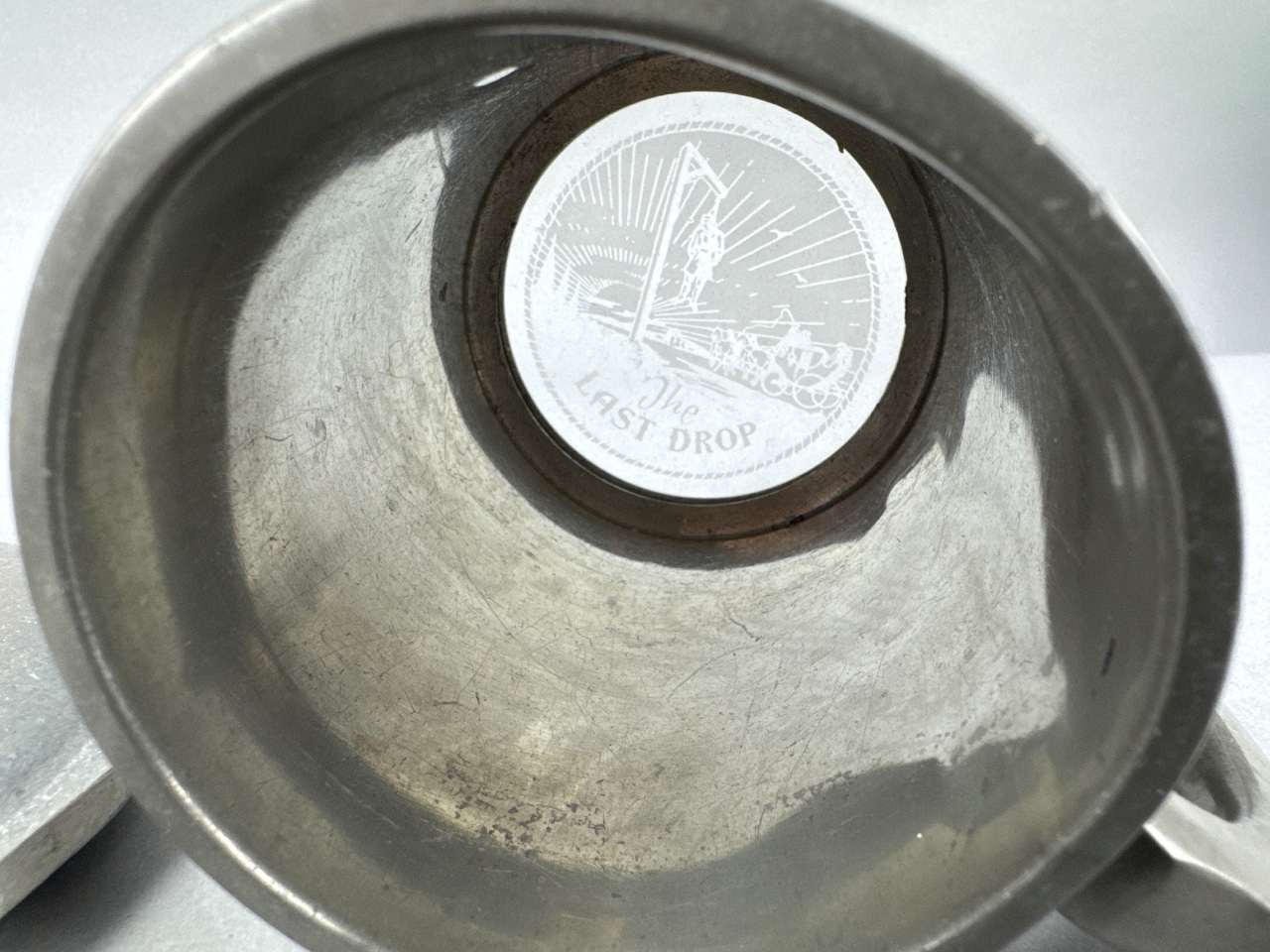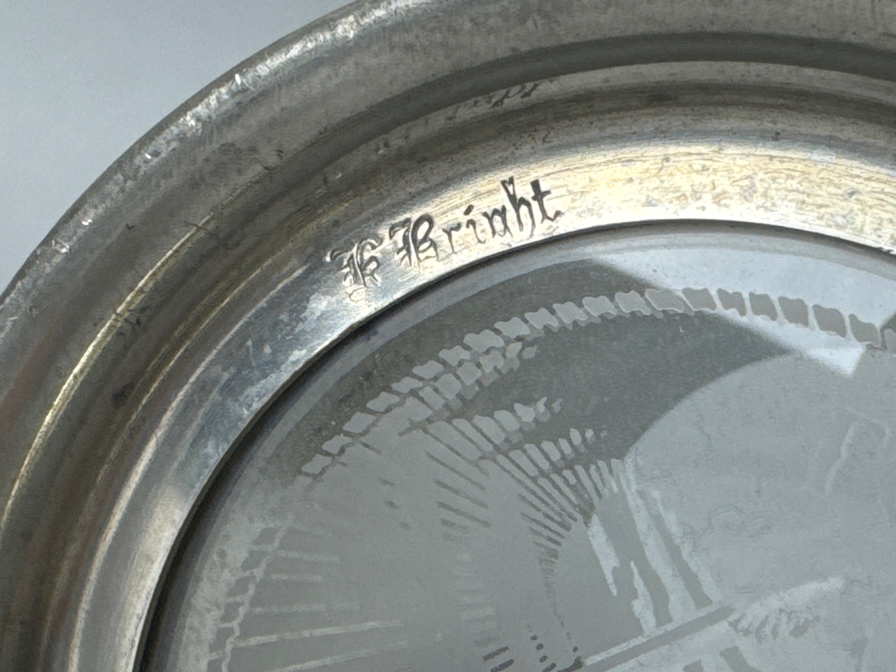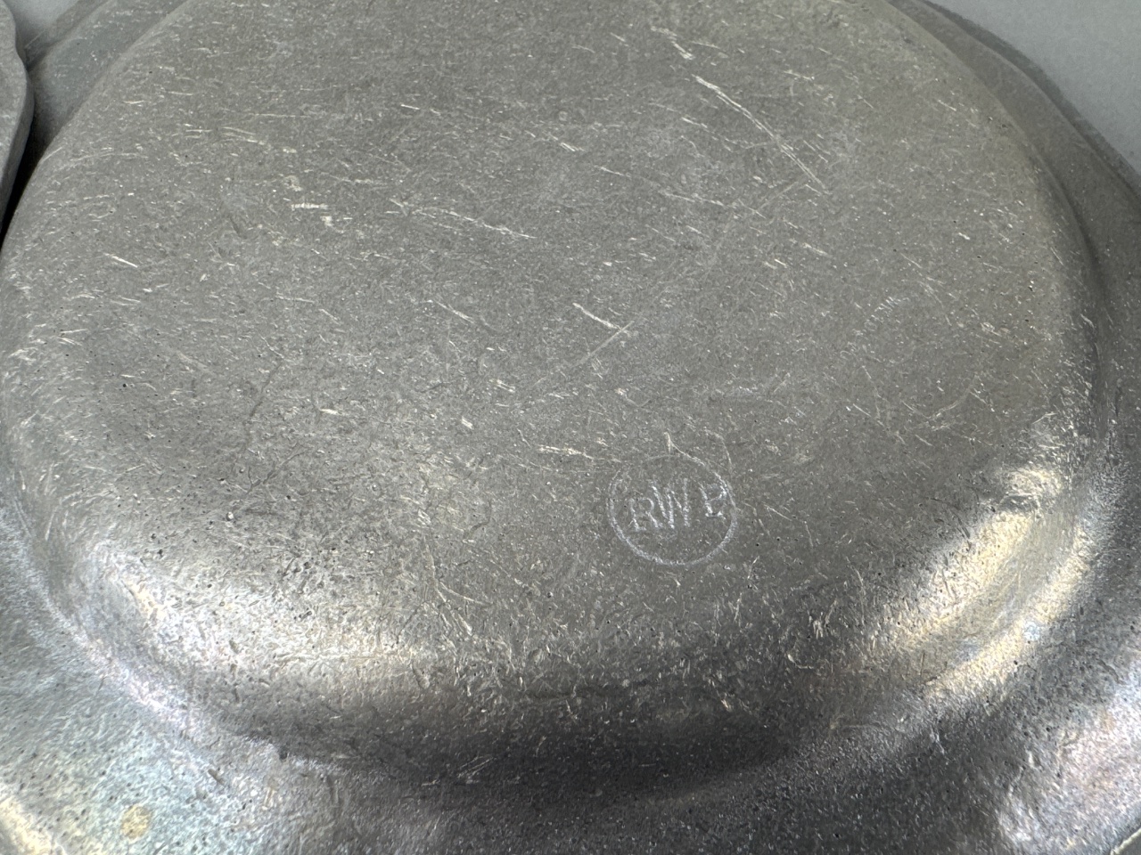 Metal pitcher and plate set, including one pitcher with a handle and spout and four plates with scalloped edges. The pitcher bears visible text reading ‘M. 83,’ while one plate is marked ‘WILTON CO. USA’ and another reads ‘R.F.’ The pitcher has a shiny, reflective surface, and the plates have a matte finish. Plates measure 7″D. CONDITION: Surface scratches visible on all items. Minor tarnishing observed on the pitcher. SHIPPING: In-House Shipping Available