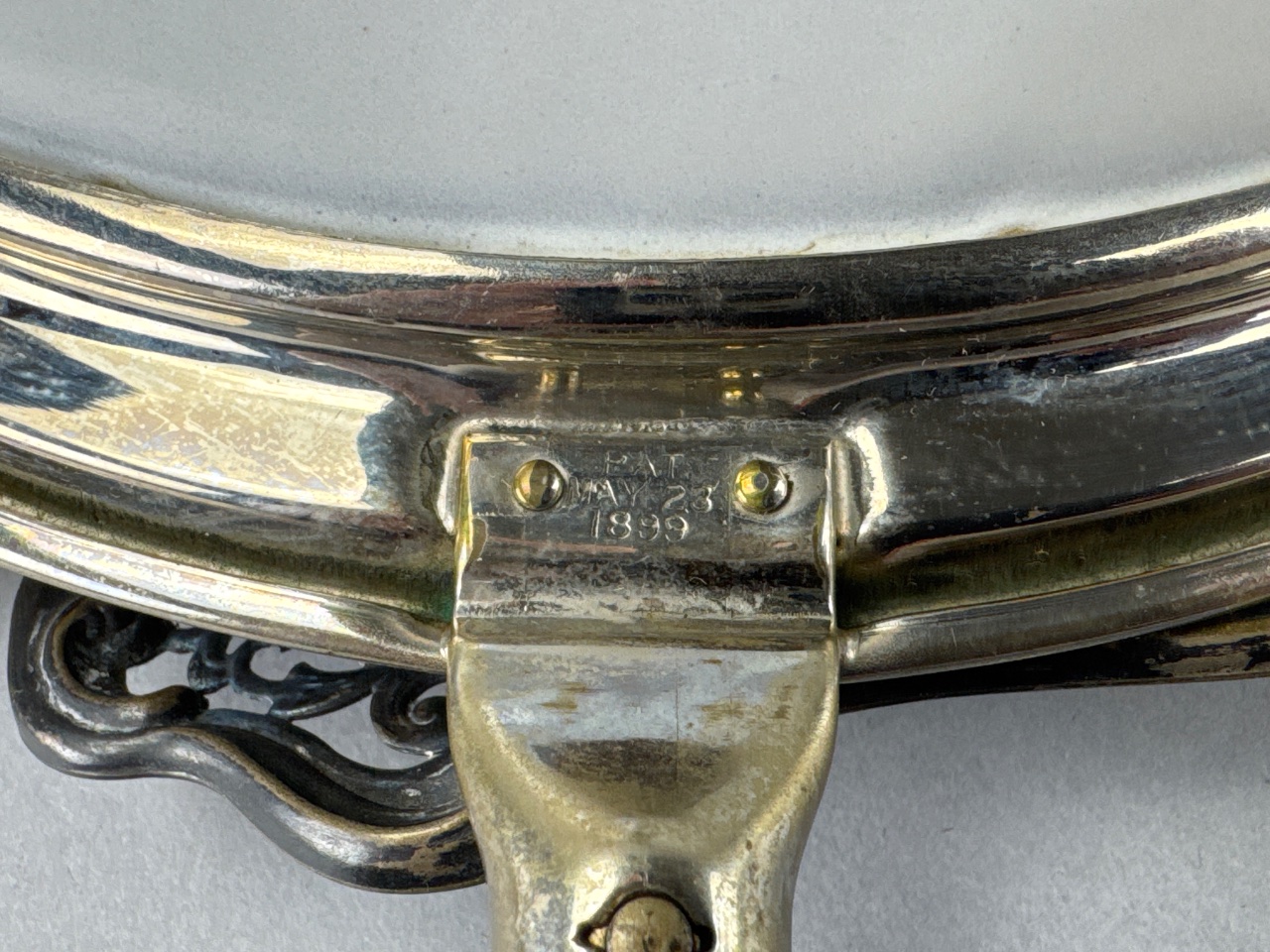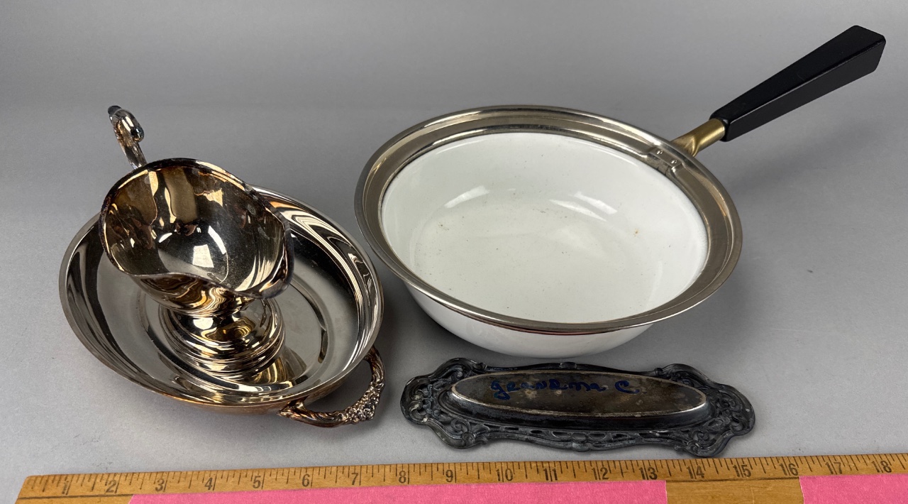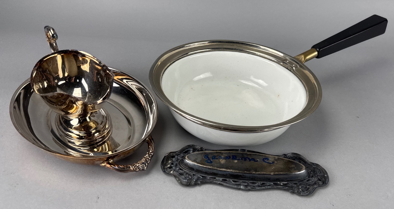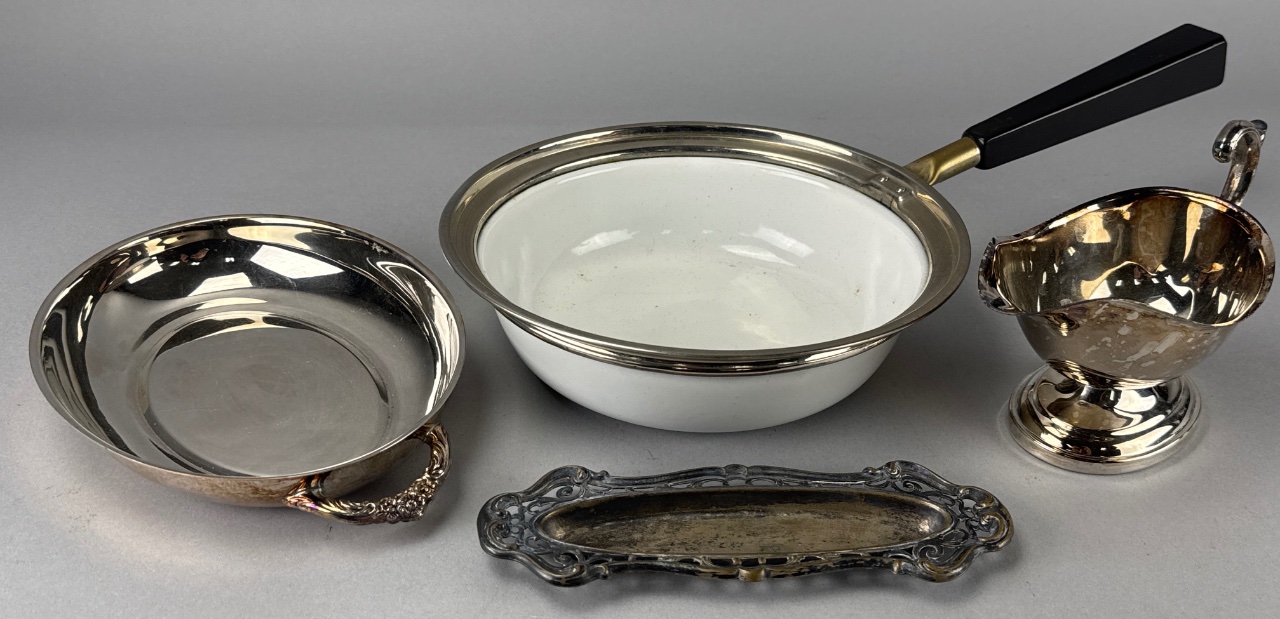 Grouping of four metal items including an oval bowl with white interior and silver rim marked ‘M. 23 1899’, a small silver creamer, an oval silver tray with decorative handle, and a rectangular silver serving dish engraved ‘jeanlena C’. All items are constructed of metal. Pan measures 8″D. CONDITION: Some tarnishing visible on silver surfaces. Minor scratches observed on the serving tray. SHIPPING: In-House Shipping Available