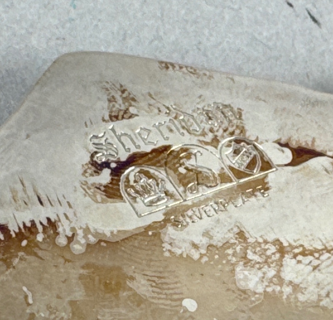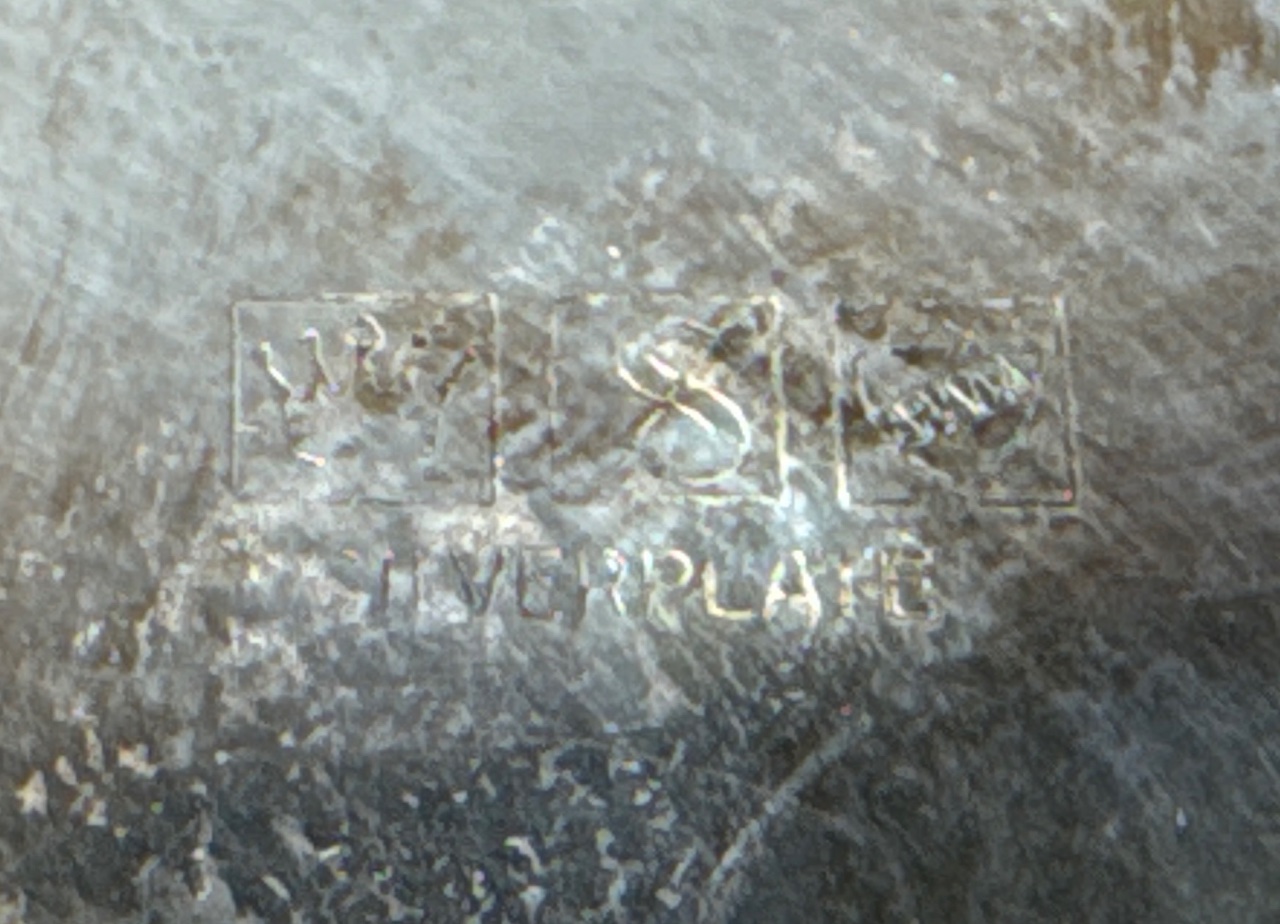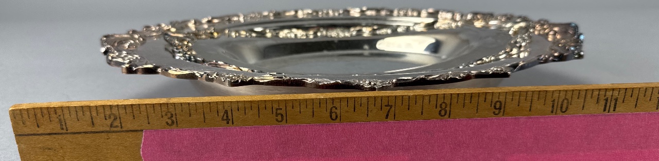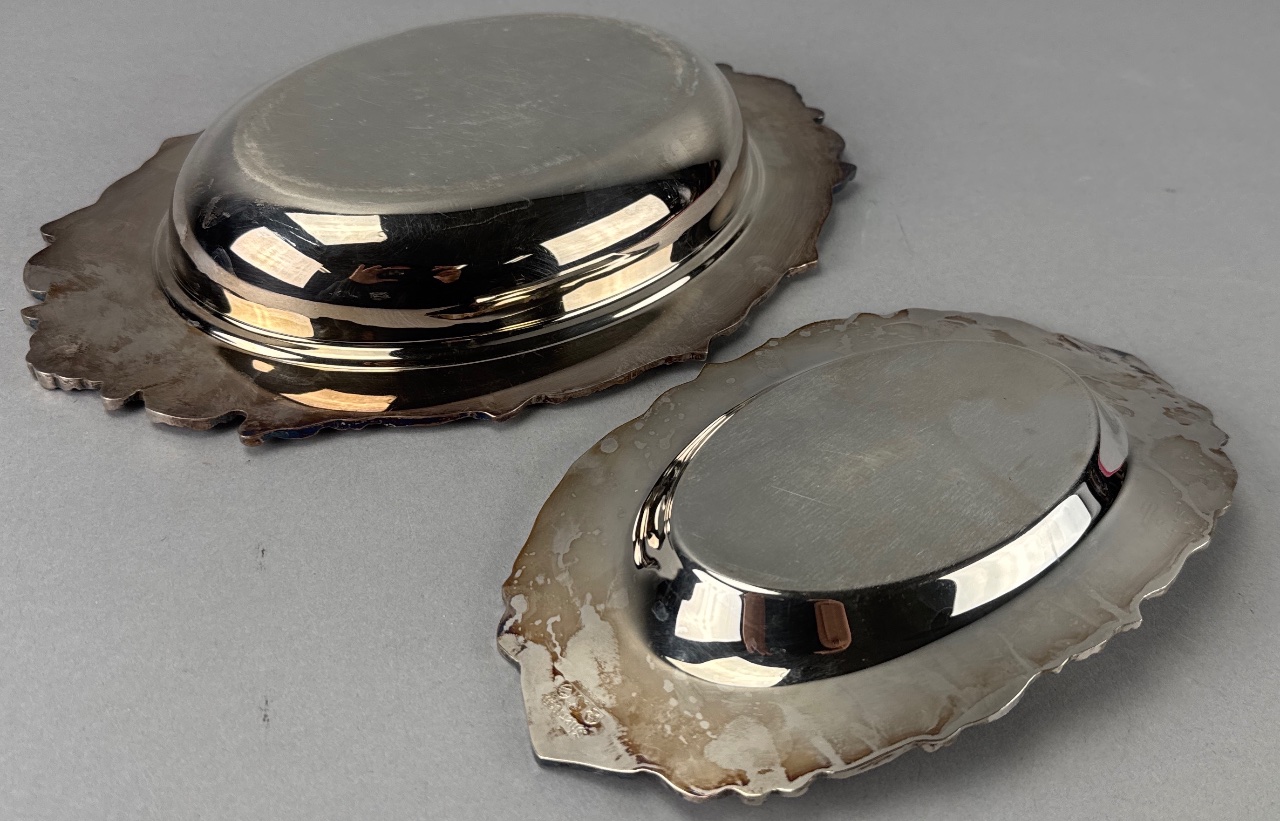 Pair of silver-plated serving dishes, including one marked ‘Sheridan Silverplate’ and another marked ‘W.S. Silverplate’. Both feature ornate scalloped edges and a shiny, reflective surface. The larger dish has a more pronounced decorative edge compared to the smaller dish. Measure 8″W. CONDITION: Surface scratches visible on both dishes. Minor tarnishing observed on the edges. SHIPPING: In-House Shipping Available
