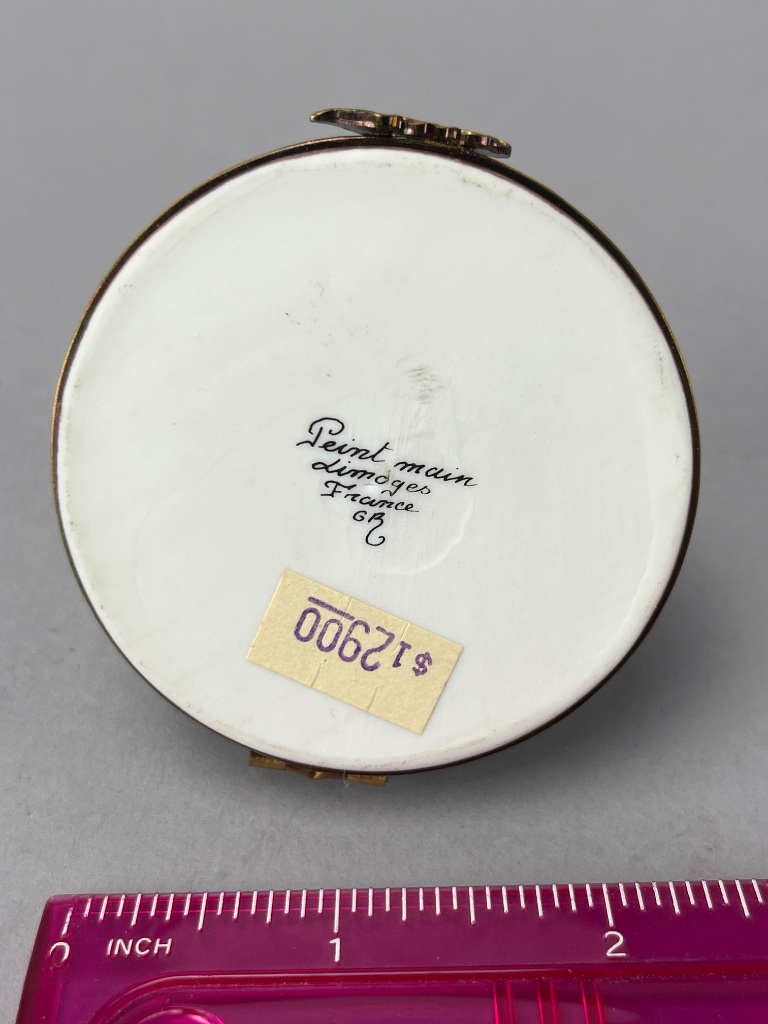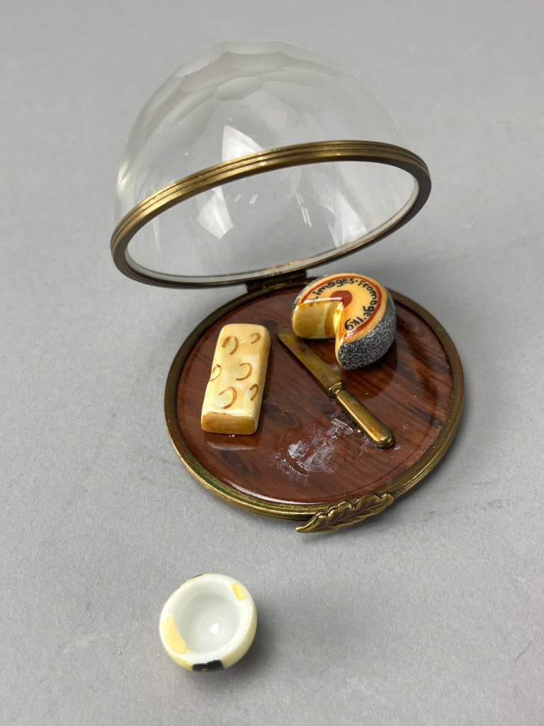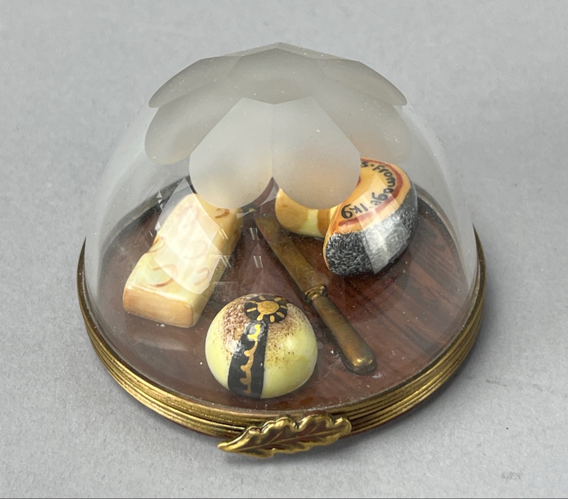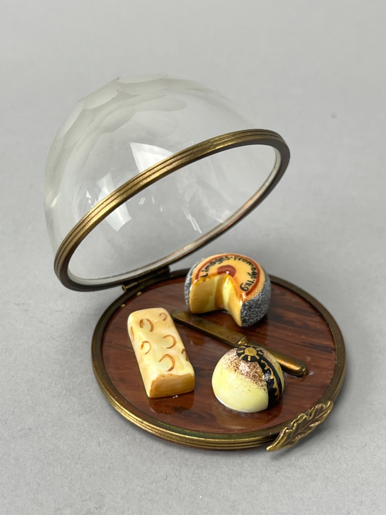 Miniature cheese display under glass dome featuring three ceramic cheese pieces (round, wedge, cylindrical) and a metal knife, set on a polished wooden base. The base bears a mark reading ‘Peint main Limoges France.’ Measures 2″ wide. CONDITION: One cheese piece is detached and requires re-gluing. SHIPPING: In-House Shipping Available