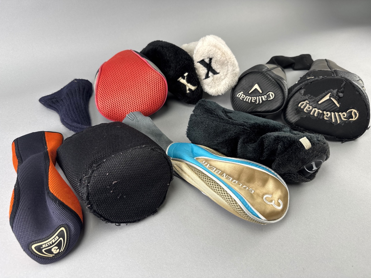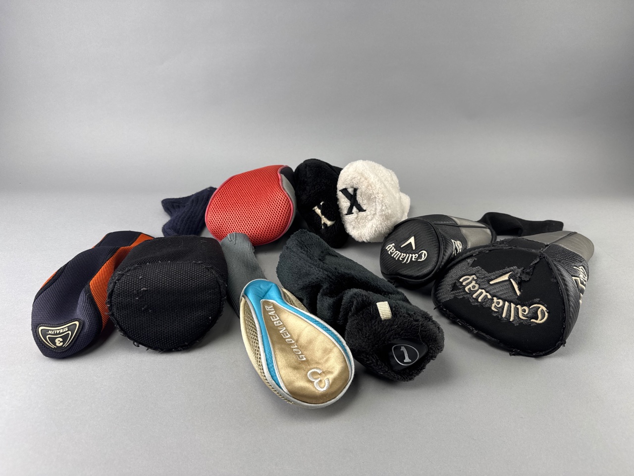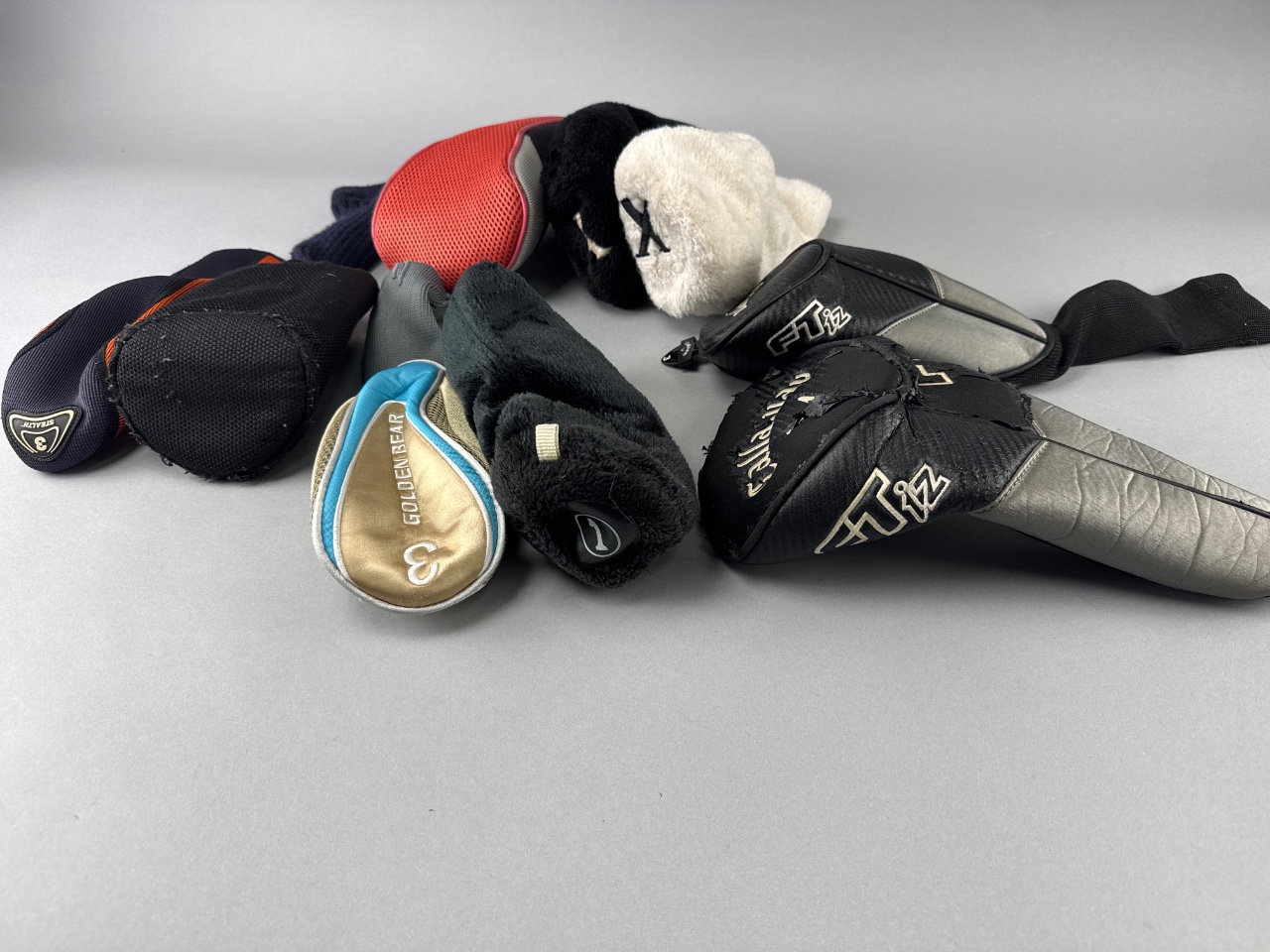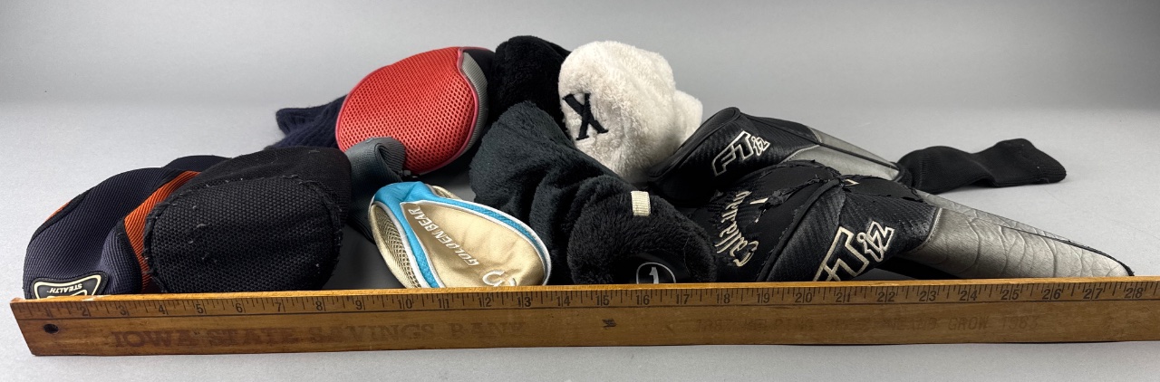 Grouping of assorted golf club headcovers, including one marked ‘Callaway’ and another marked ‘Golden Bear’. The headcovers are made of fabric and synthetic materials in various colors and textures, including a red mesh example and several soft fabric designs in black and white. CONDITION: Some headcovers show signs of wear, including fraying, scuffing, and one with a tear. SHIPPING: In-House Shipping Available