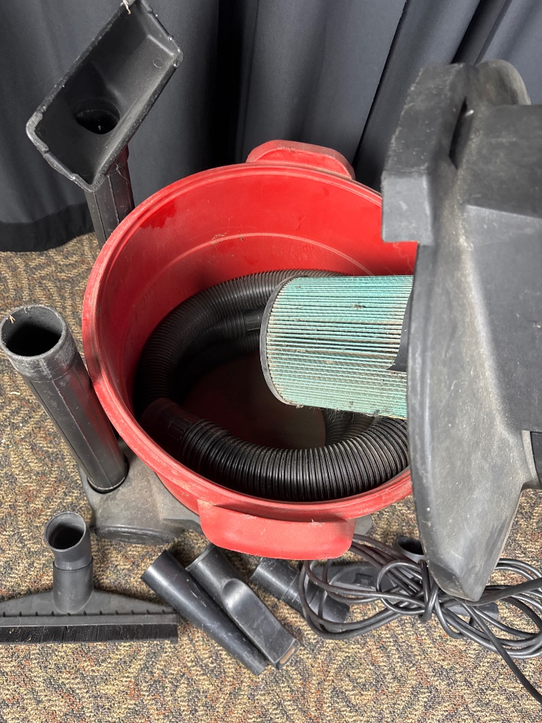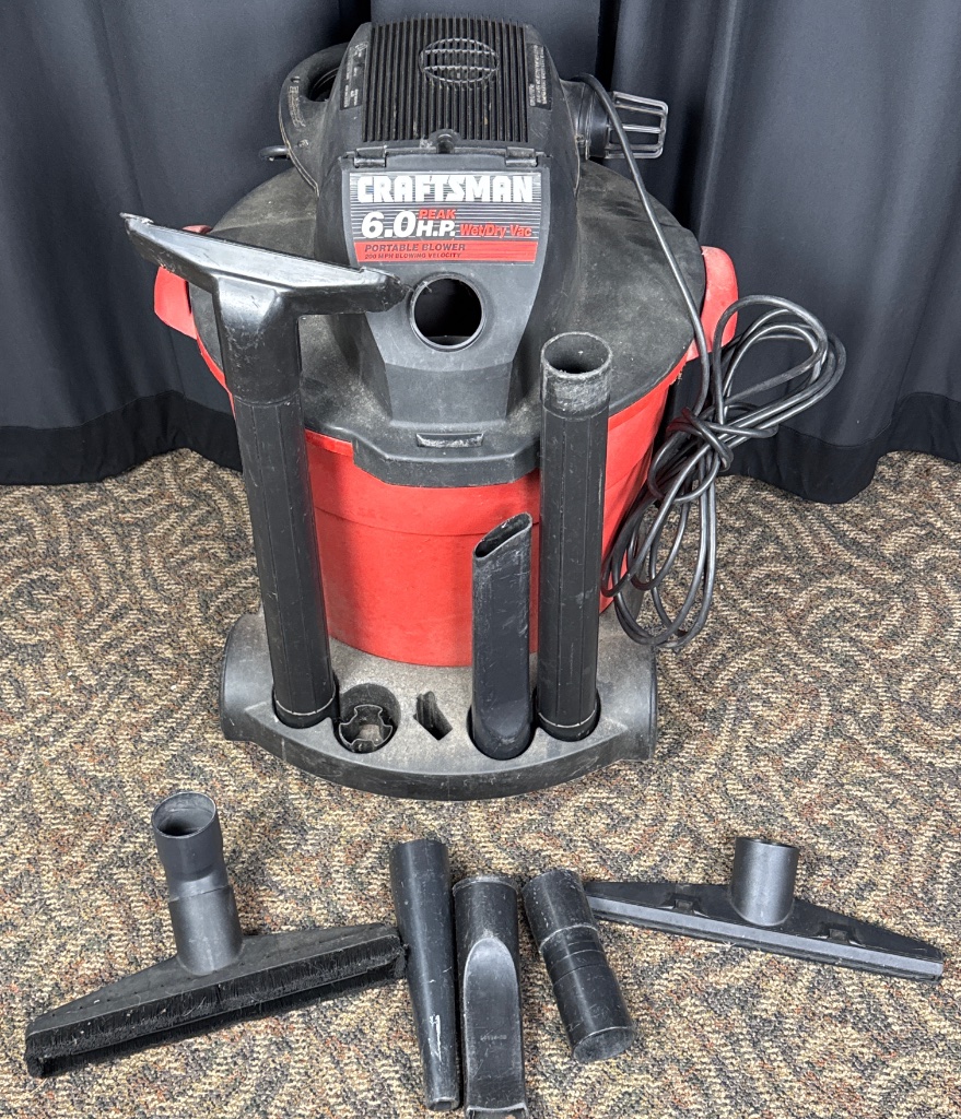 Craftsman 16 gallon wet/dry vacuum with a red plastic body and black top. Marked ‘CRAFTSMAN 16 GALLON 6.0 H.P.’ on the body and top. Includes multiple vacuum attachments such as a wide nozzle and extension tubes. Power cord is coiled around the vacuum, and a filter is visible inside the body. CONDITION: Some surface wear and scuffing on the vacuum body. Attachments show signs of use but no major damage visible. SHIPPING: In-House Shipping Available
