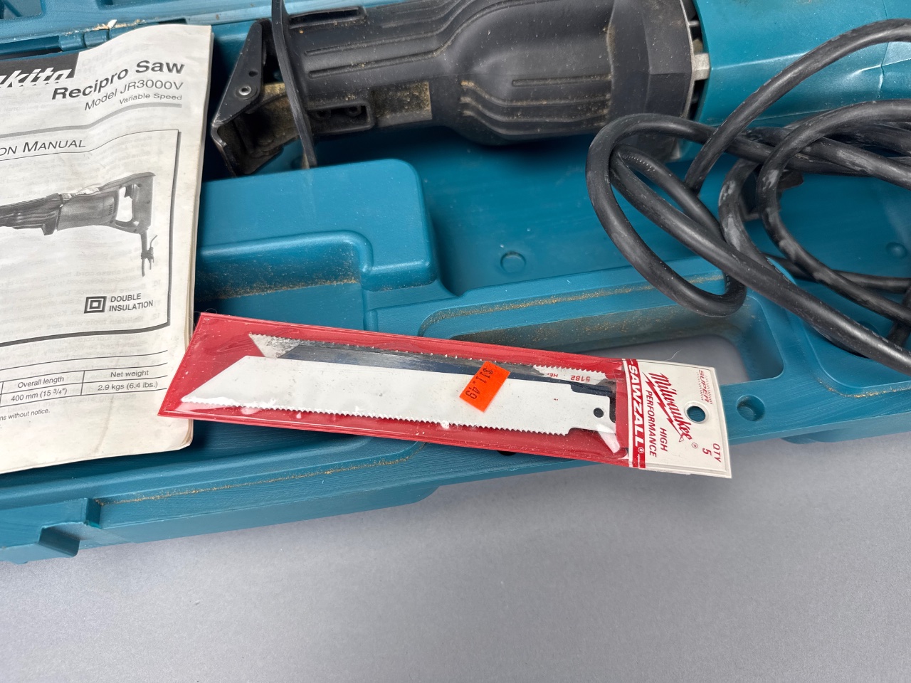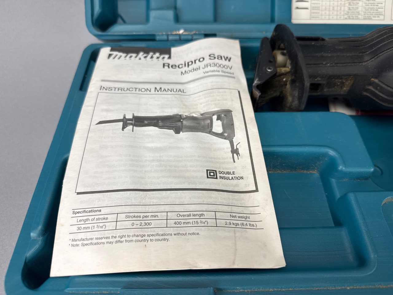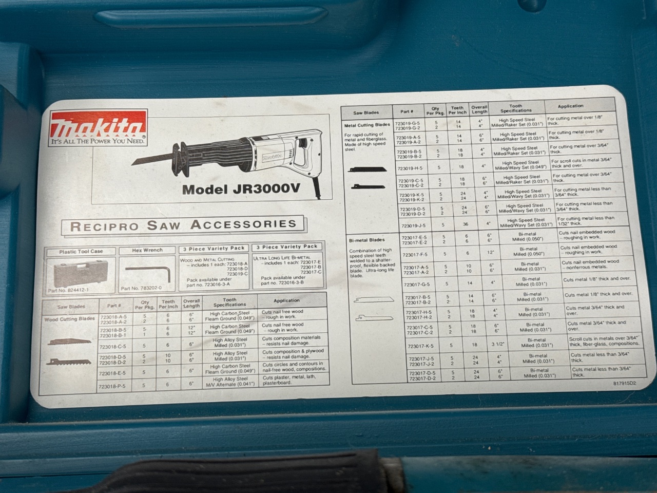 Makita JR3000V reciprocating saw with blue plastic carrying case, instruction manual, and accessories. The case features molded compartments and an accessory chart for saw blades printed inside the lid. An additional saw blade package is included. CONDITION: Some dust accumulation inside the case and minor wear on the case exterior. SHIPPING: In-House Shipping Available