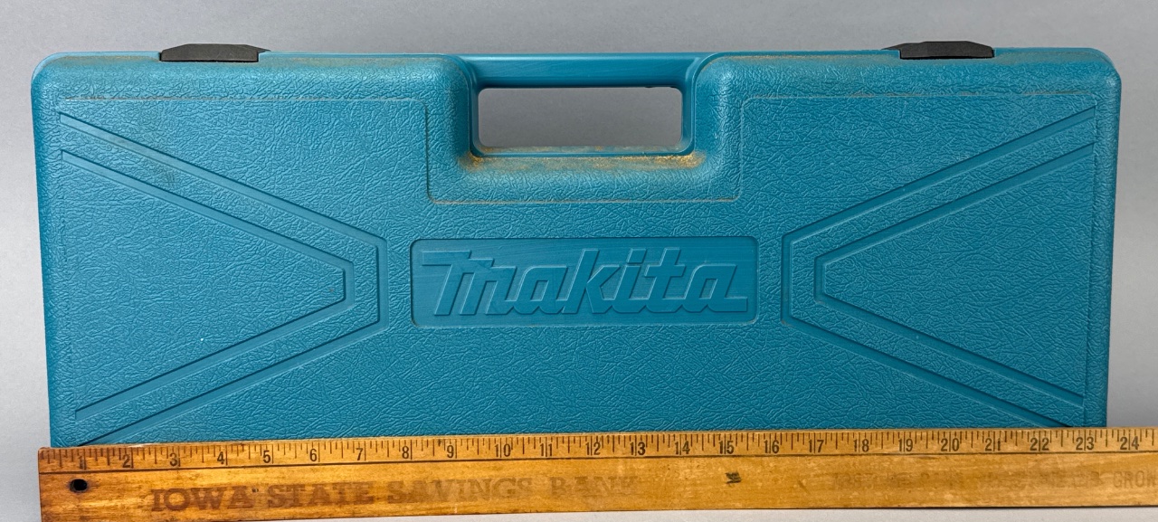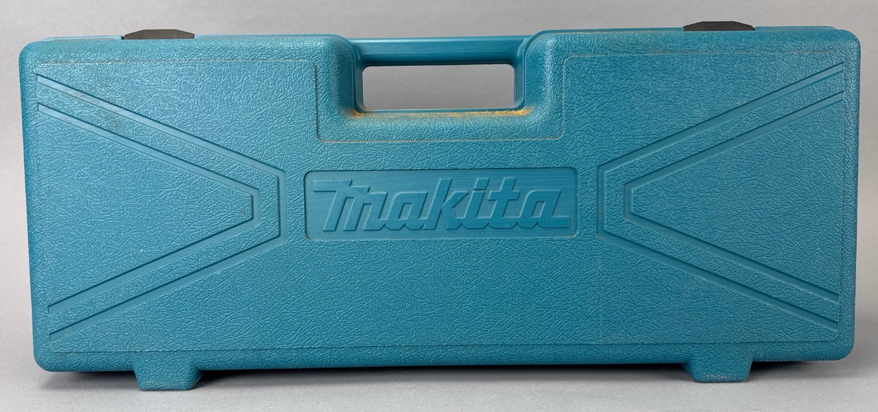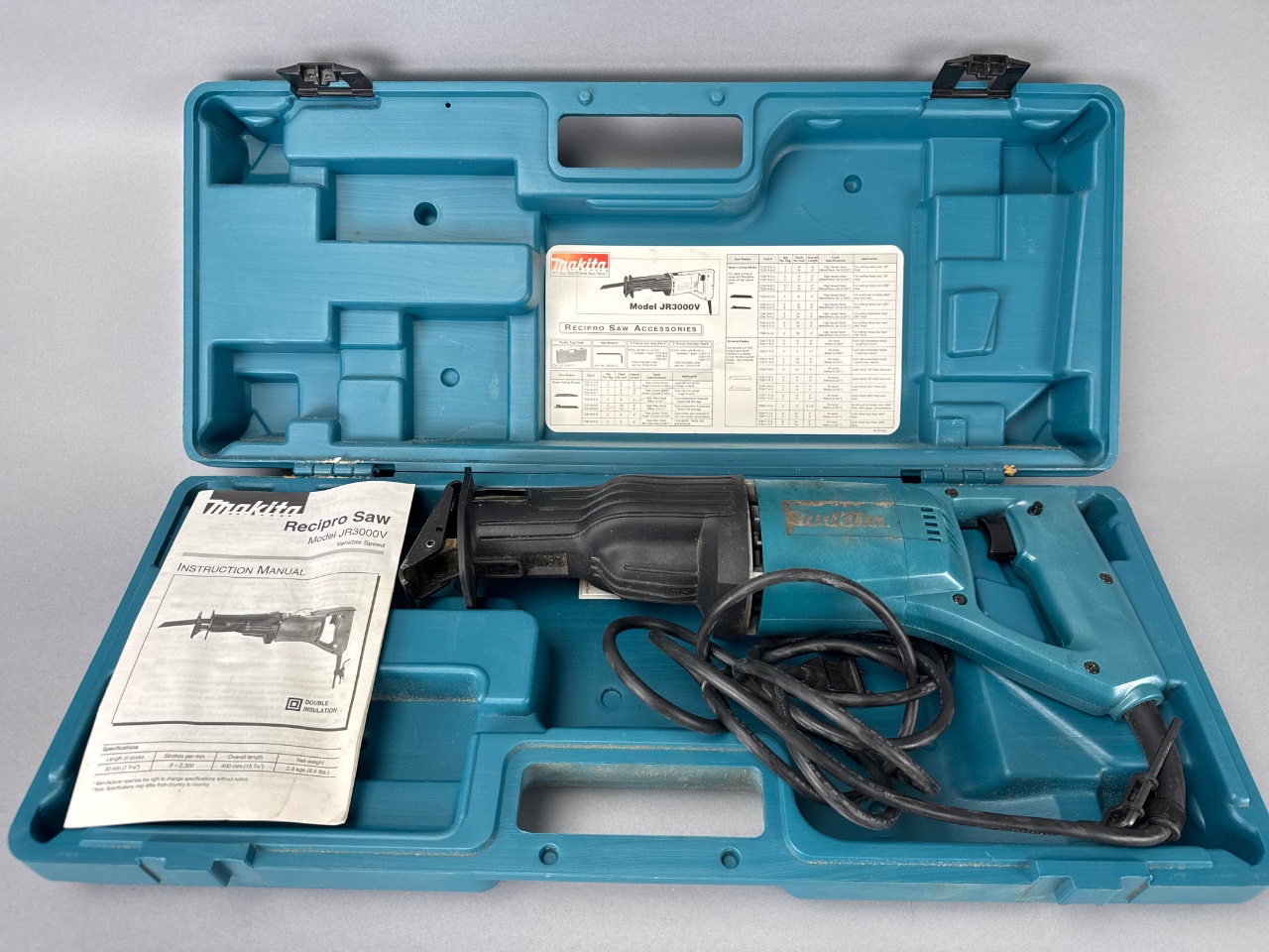 Makita JR3000V reciprocating saw with blue plastic carrying case, instruction manual, and accessories. The case features molded compartments and an accessory chart for saw blades printed inside the lid. An additional saw blade package is included. CONDITION: Some dust accumulation inside the case and minor wear on the case exterior. SHIPPING: In-House Shipping Available