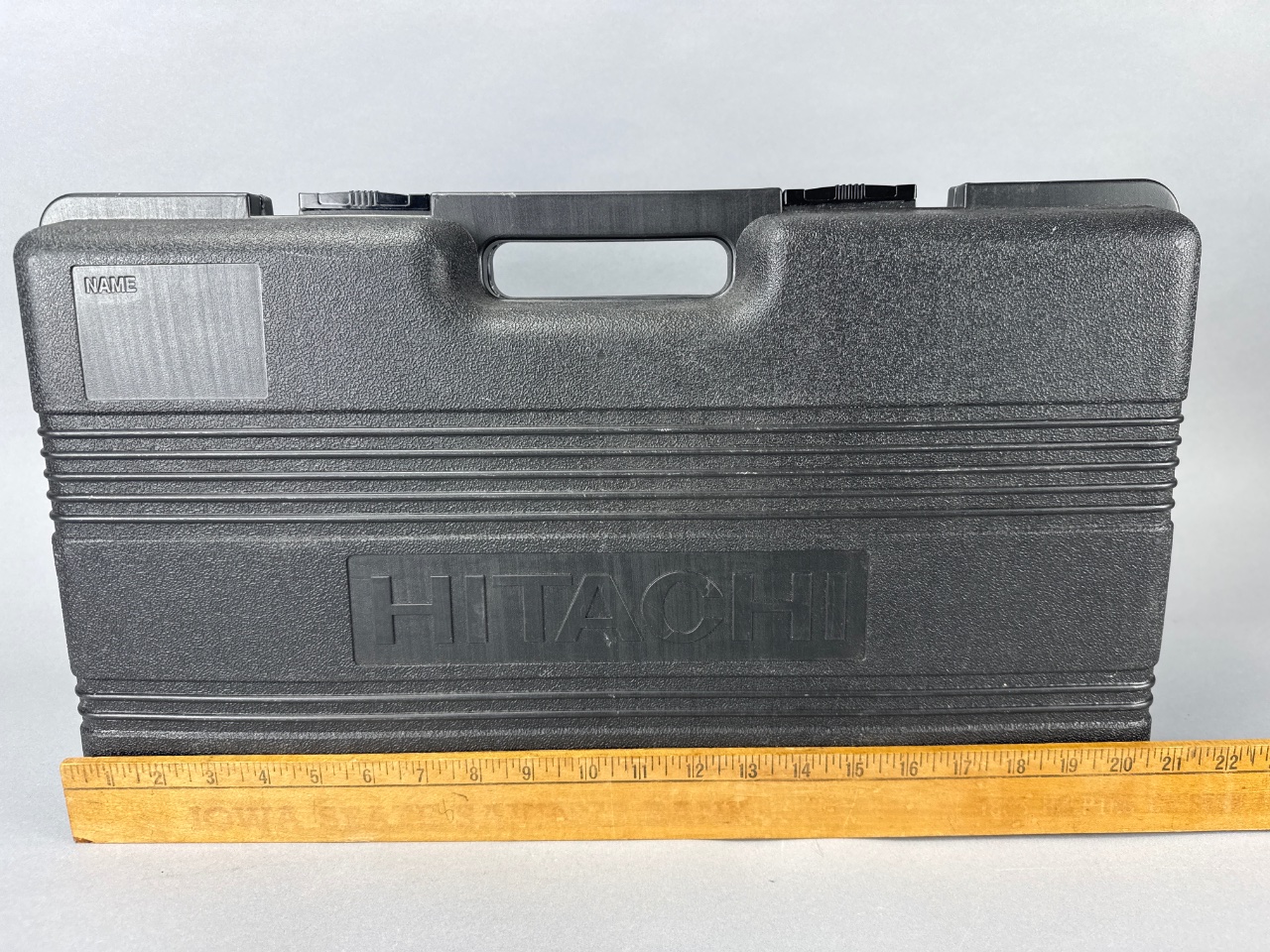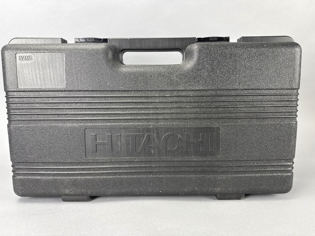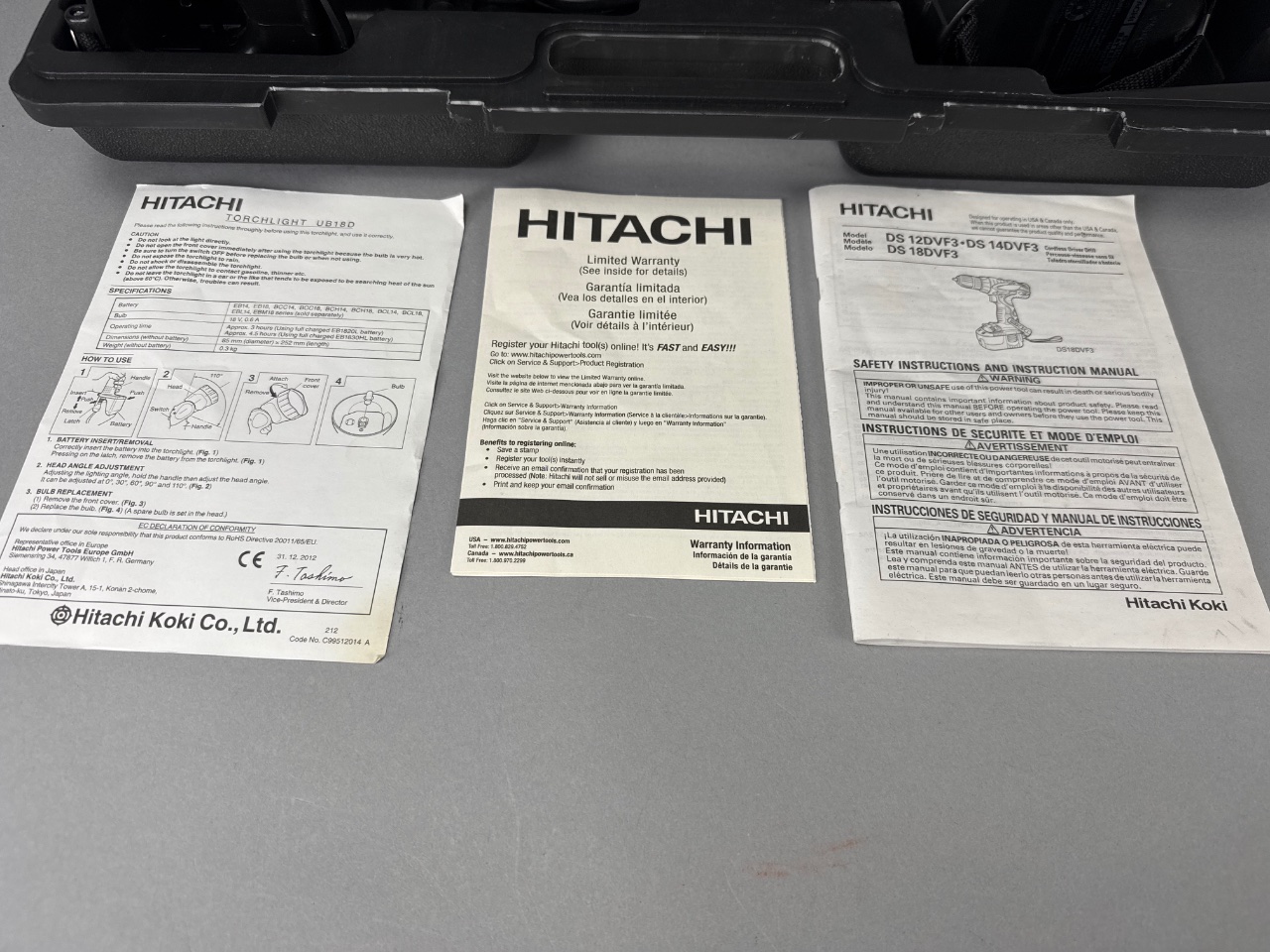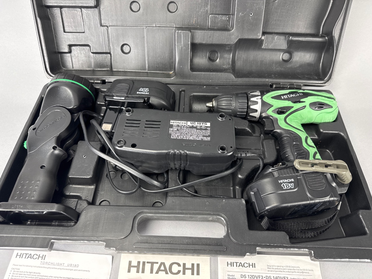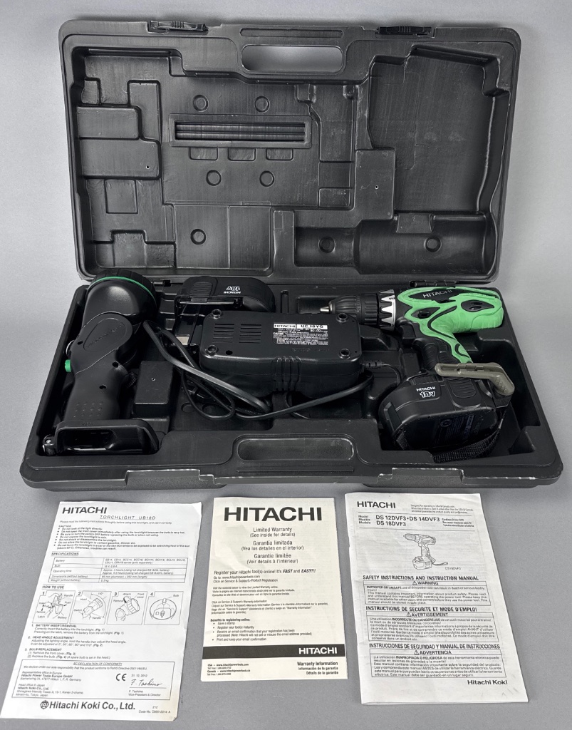 Hitachi cordless drill and flashlight set with charger. The set includes a cordless drill with a green and black handle, a flashlight with green accents, a battery pack labeled ’18V,’ a black plastic carrying case with molded compartments, and two instruction manuals labeled ‘HITACHI TORCHLIGHT U18D’ and ‘HITACHI DS 12DVF3-DS 14DVF3.’ A charger unit is also included. CONDITION: No visible damage or wear observed on the tools. The carrying case shows minor scuffing. SHIPPING: In-House Shipping Available