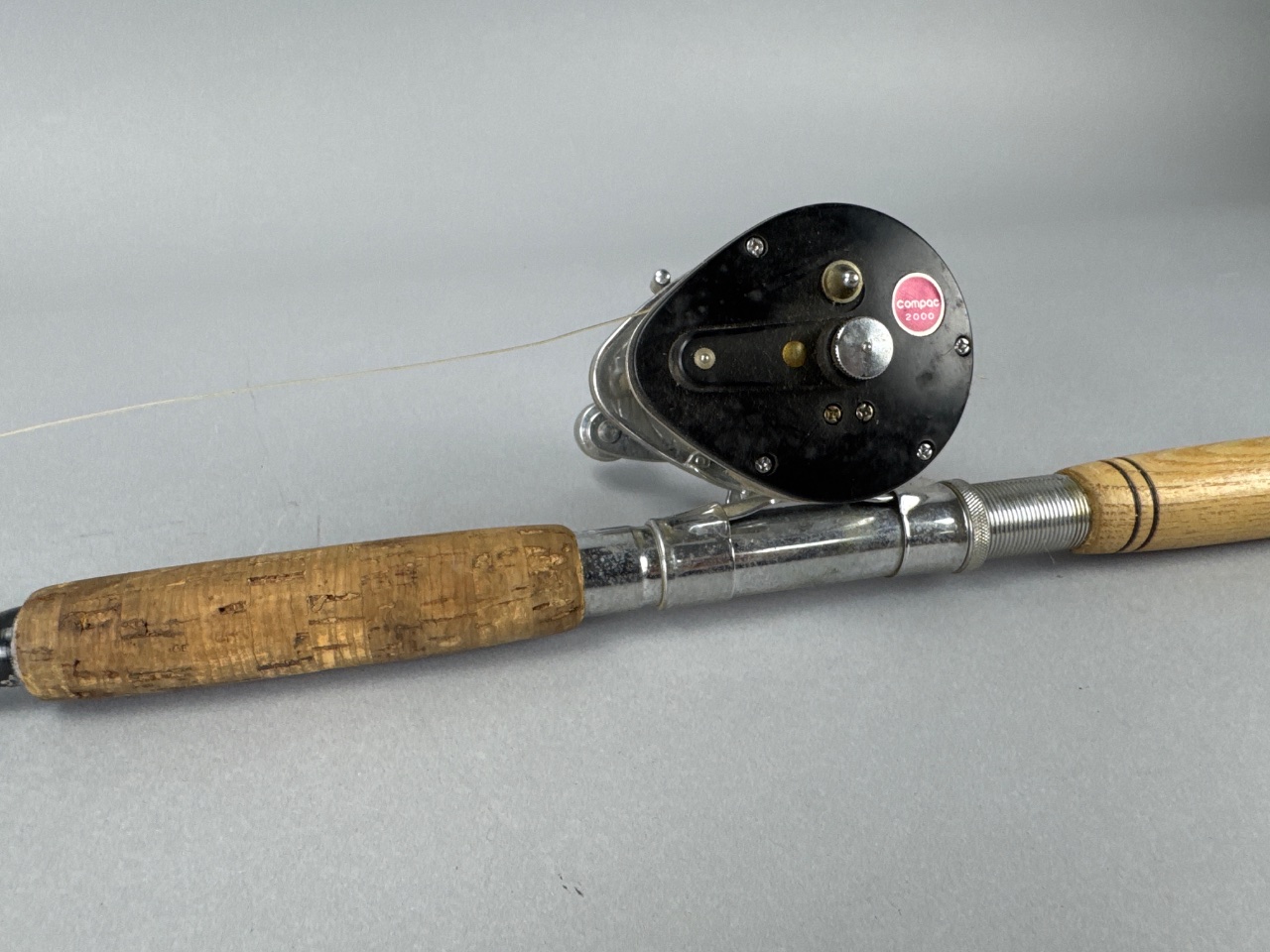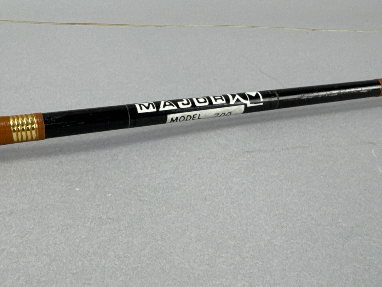 Vintage fishing rod with reel marked ‘MAJOR MODEL 200’. The rod features a cork handle and fiberglass construction, with a black reel that includes a red button and visible line. Likely mid-20th century manufacture by Major Fishing Tackle. CONDITION: Some wear visible on the cork handle and minor scratches on the rod surface. SHIPPING: In-House Shipping Available
