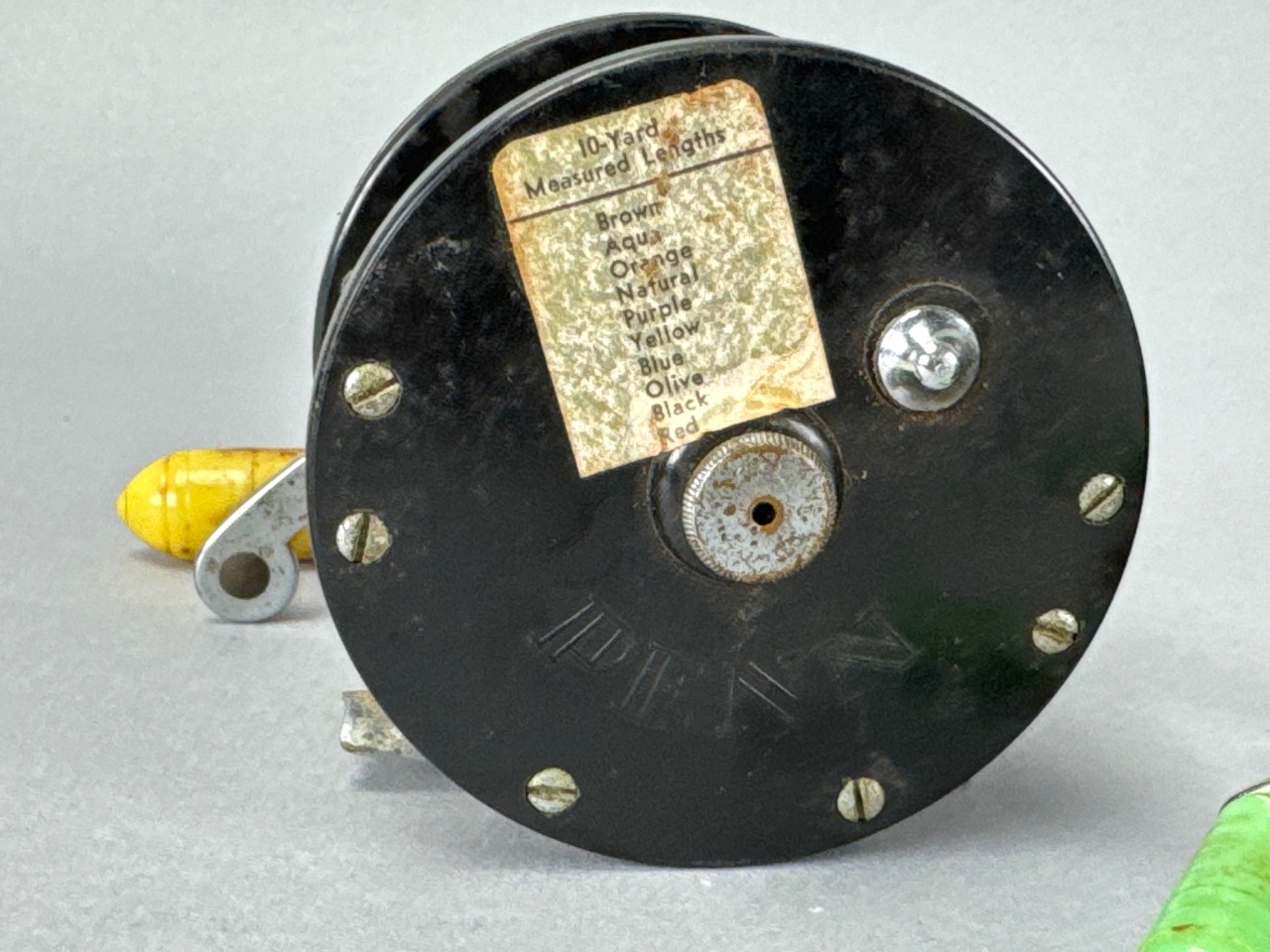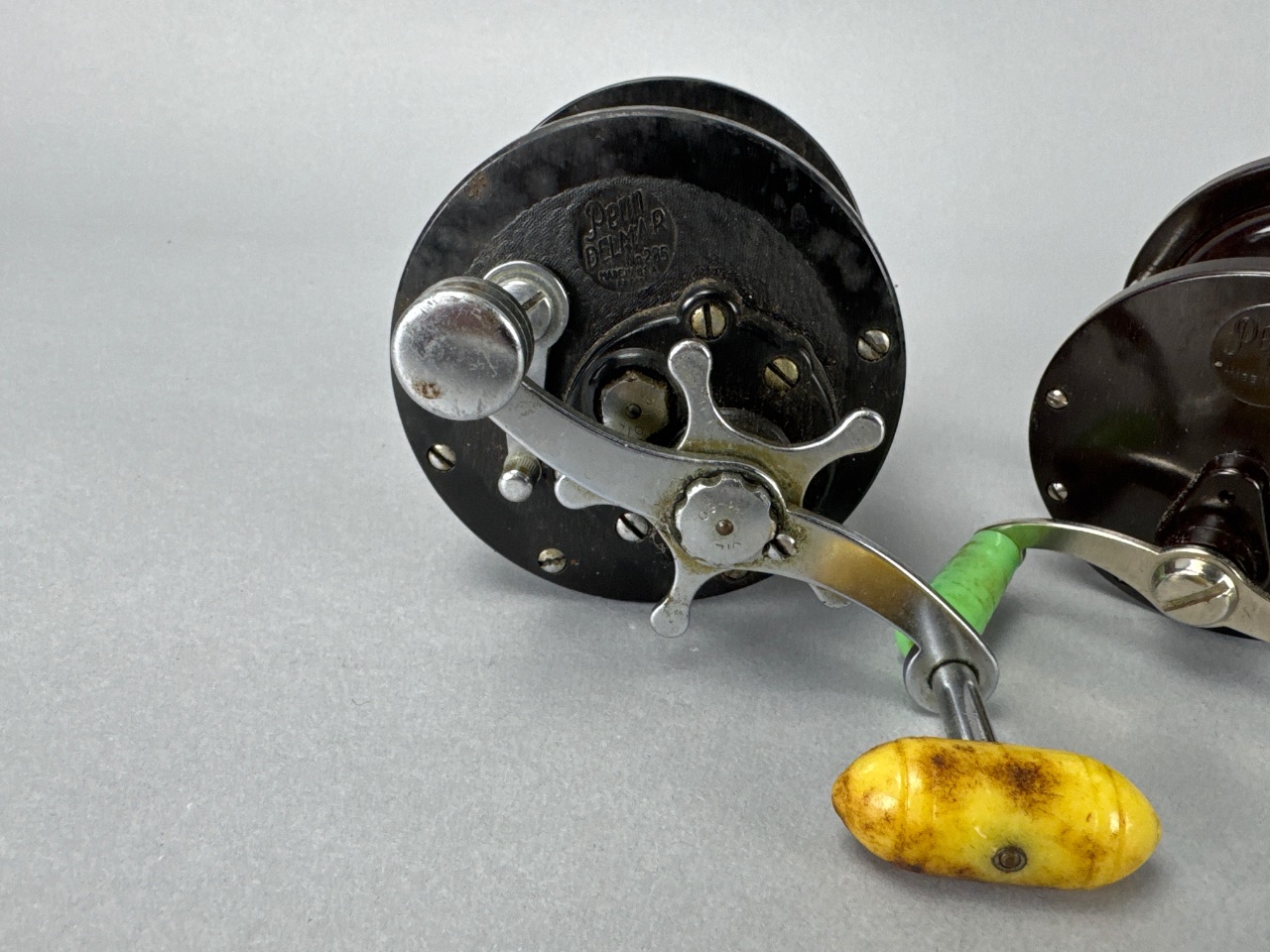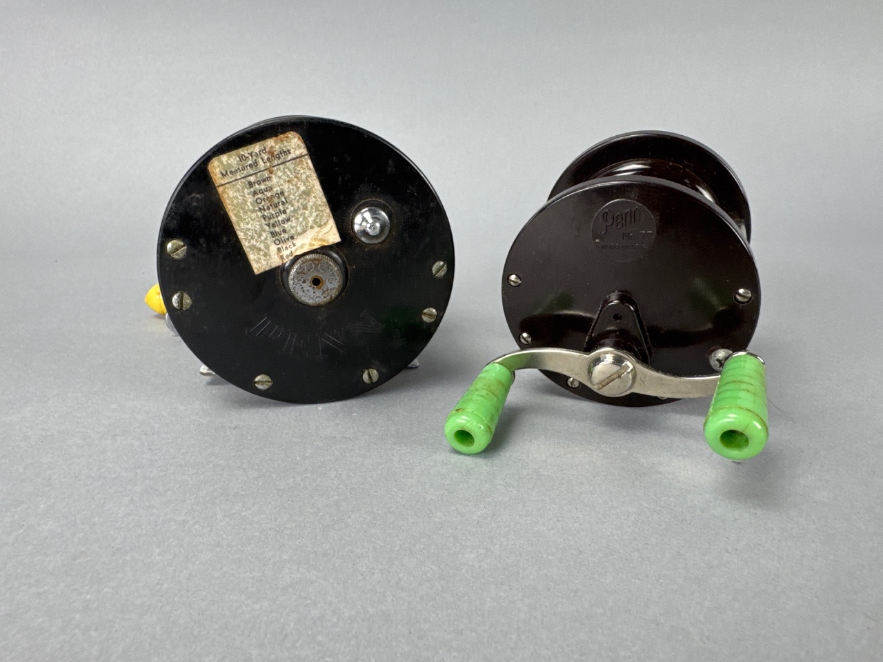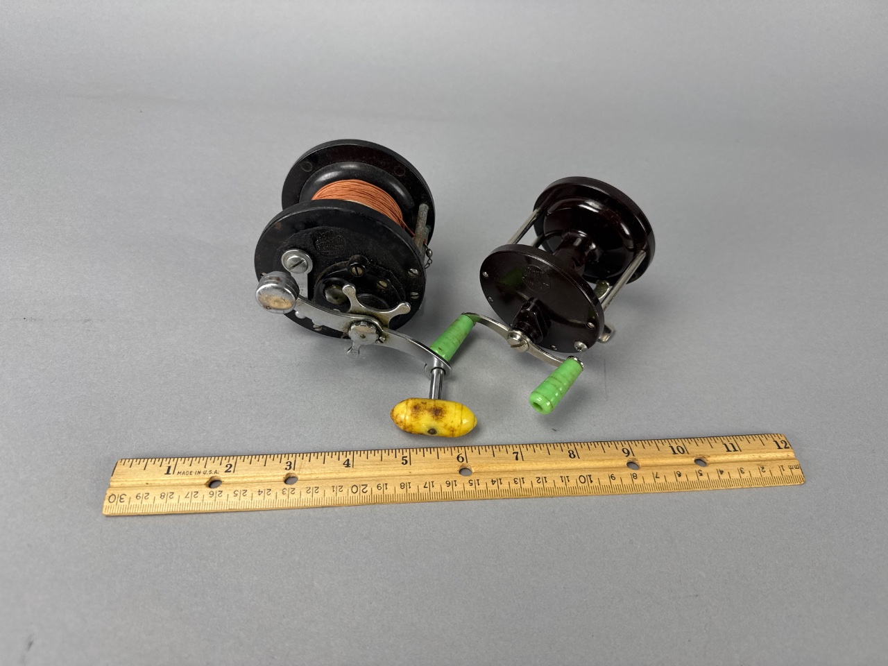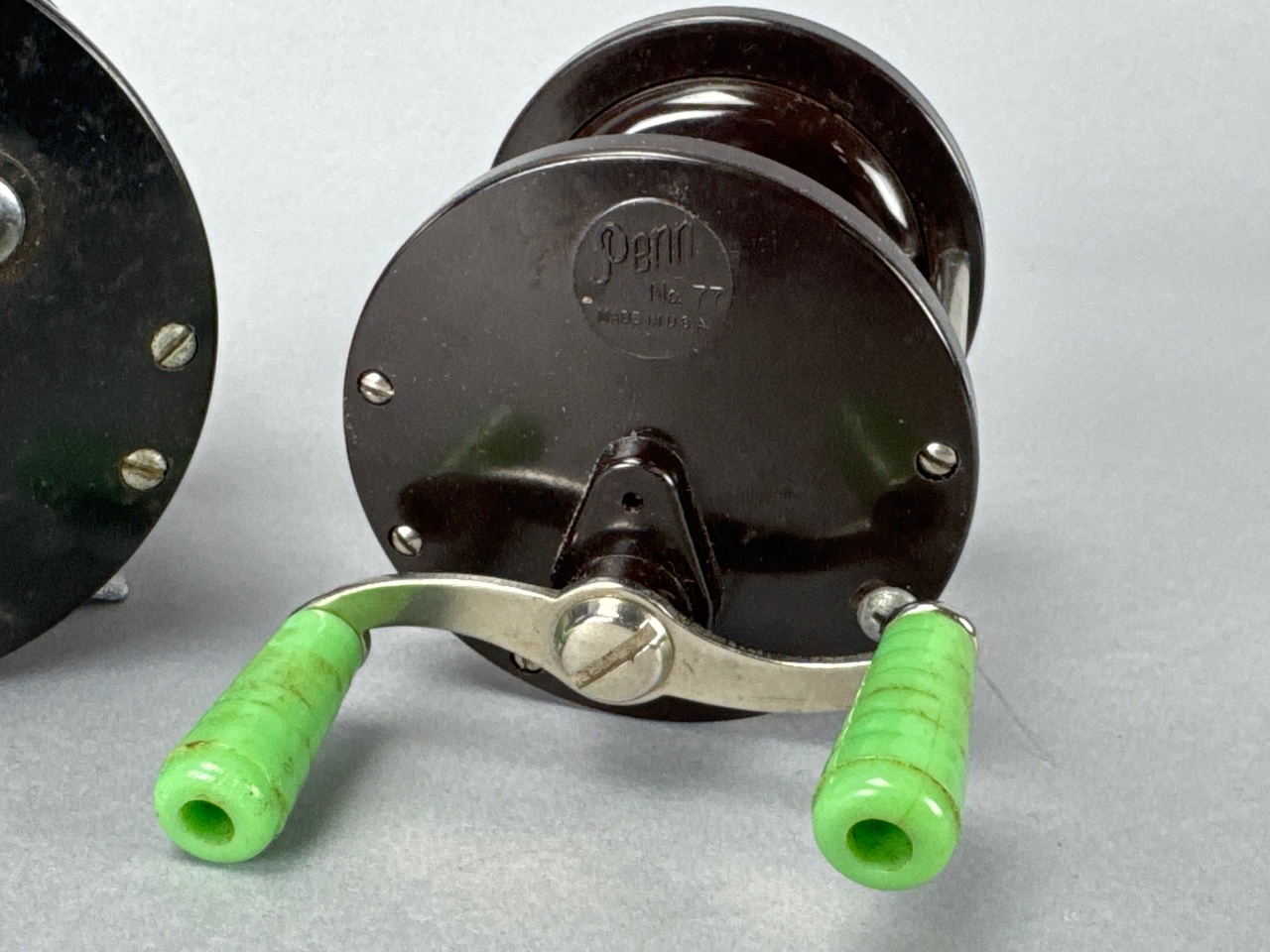 Penn No. 77 fishing reel with black metal body and crank handle. The reel bears a directly readable mark stating ‘Penn No. 77 Made in USA.’ A second reel with a measuring label listing color options is also included in the lot. CONDITION: The label on one reel shows wear and discoloration. Green handles exhibit signs of wear. SHIPPING: In-House Shipping Available