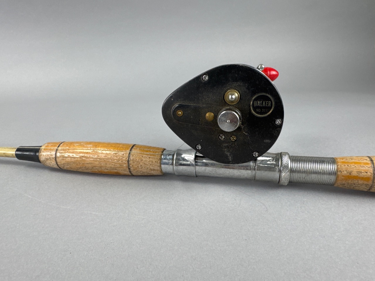 Johnnie Walker fishing rod with reel, model Walker No. 311. The rod features a wooden handle, red and white markings along its length, and several attached guides. The reel is marked ‘WALKER NO. 311’ and the rod is marked ‘Made in U.S.A.’ Constructed of wood and metal, the line is visible extending from the reel. CONDITION: Some wear visible on the rod surface and minor scratches on the reel. SHIPPING: In-House Shipping Available