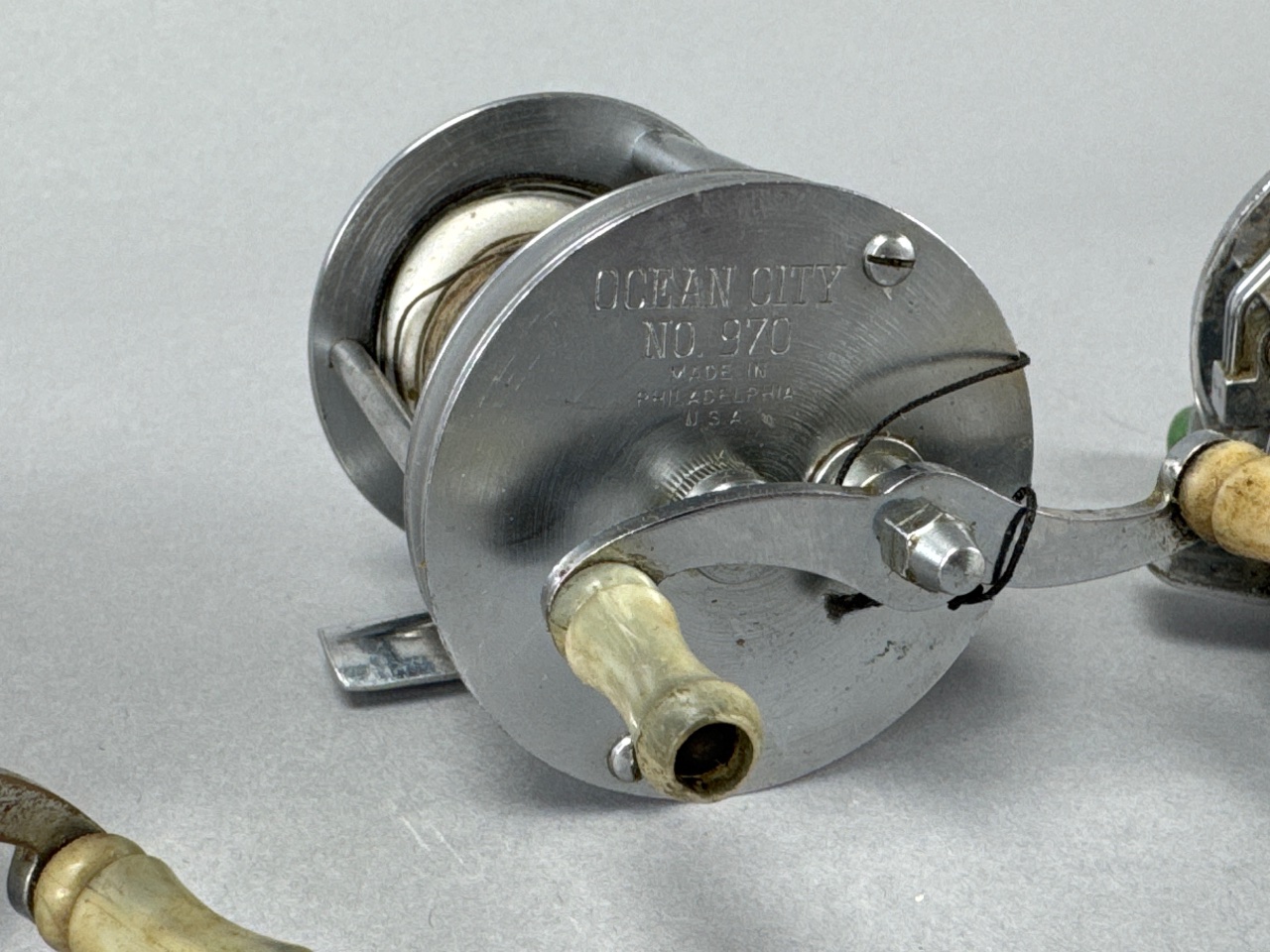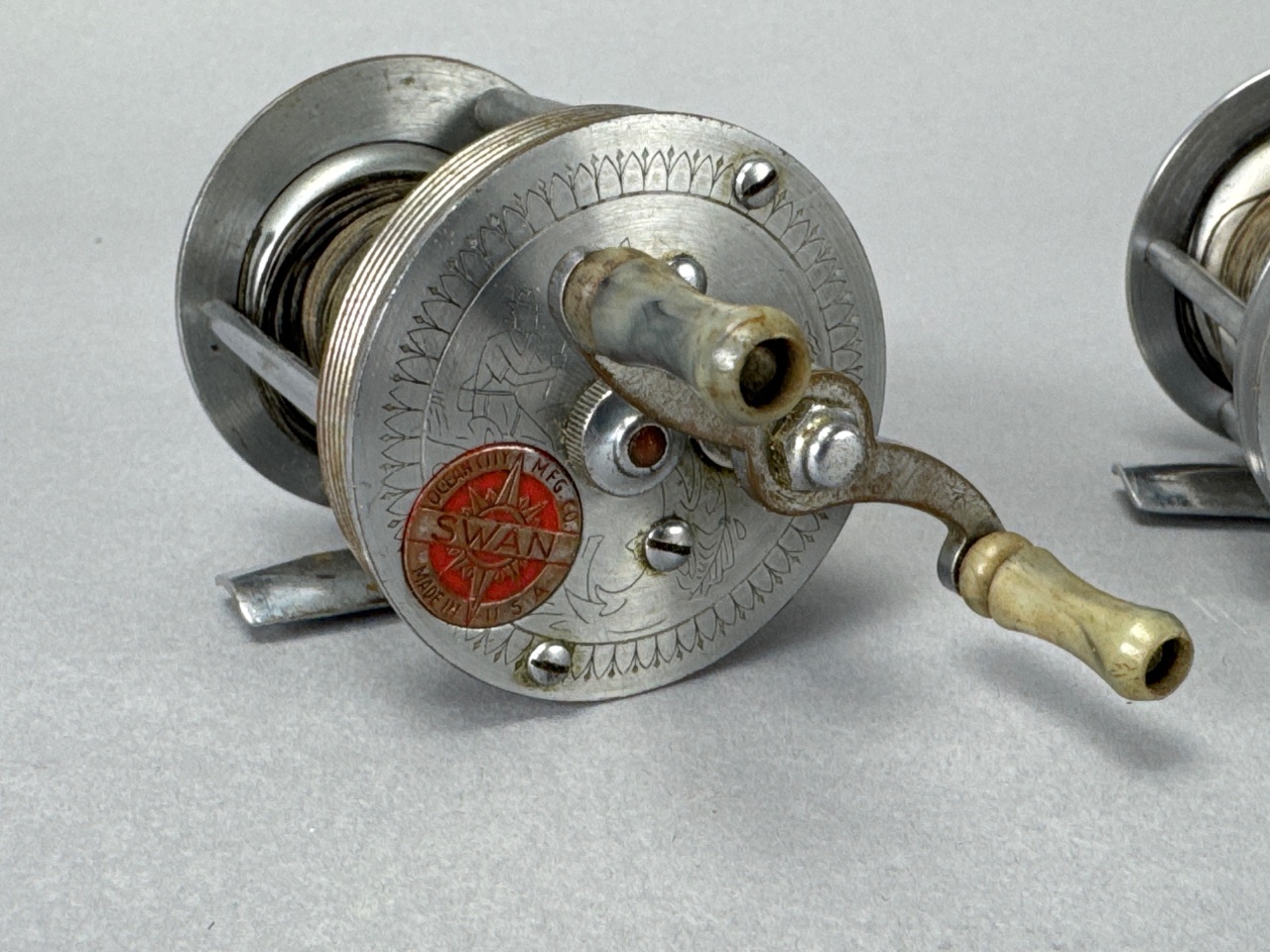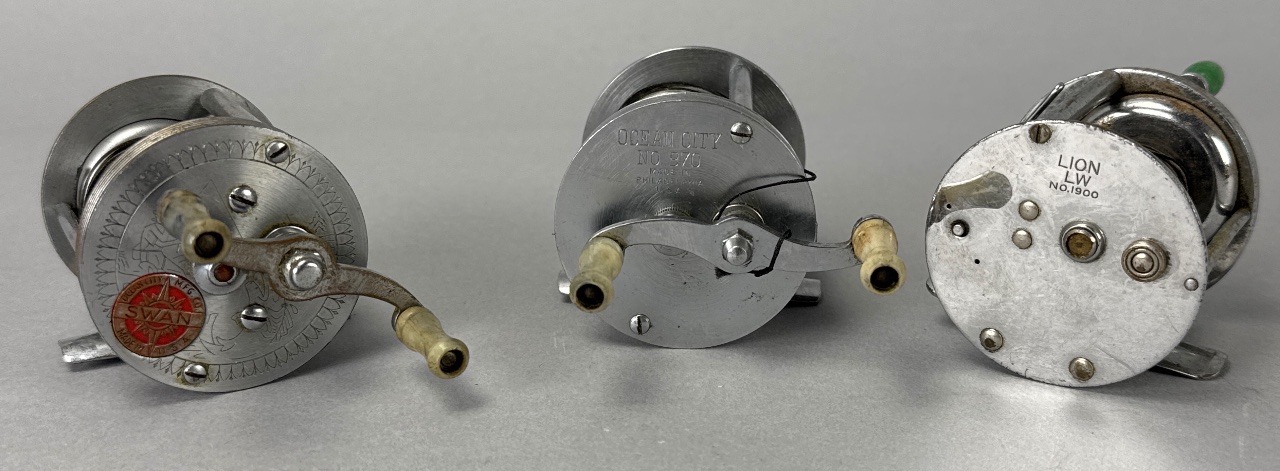 Group of three vintage fishing reels, each marked with distinct branding: ‘SWAN’ with red label, ‘OCEAN CITY NO. 970 MADE IN PHILADELPHIA USA’, and ‘LION LW NO. 1900’. All reels feature metallic finishes, handles, and spools for fishing line. CONDITION: Surface wear and scratches visible on all reels. Some corrosion present on metal parts. SHIPPING: In-House Shipping Available