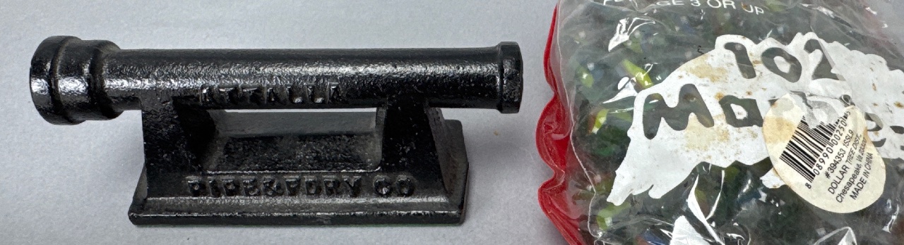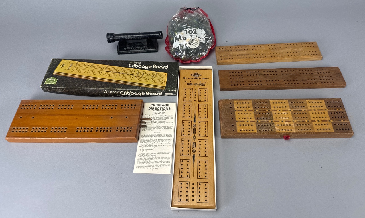 Set of five wooden cribbage boards by Milton Bradley Company, model 1503. Includes cribbage directions sheet and a bag of 102 marbles. Boards feature varying designs and colors, with cast iron decorative elements marked ‘Attalla Pipe and Foundry Co.’ CONDITION: Boards show signs of use, including minor surface wear and scuffs. This game has not been evaluated to confirm inclusion of all game pieces and accessories. SHIPPING: In-House Shipping Available