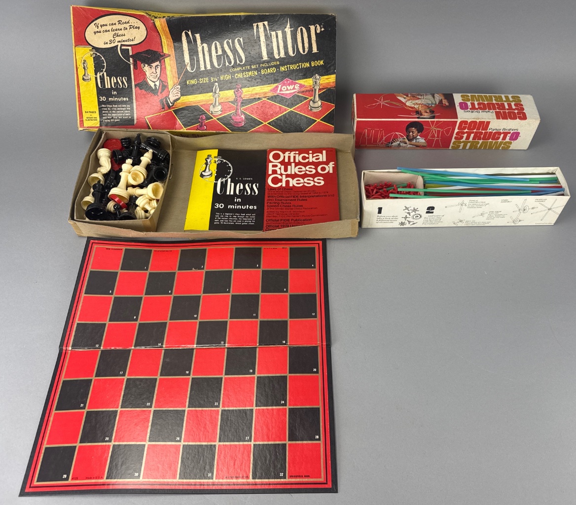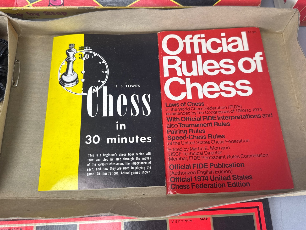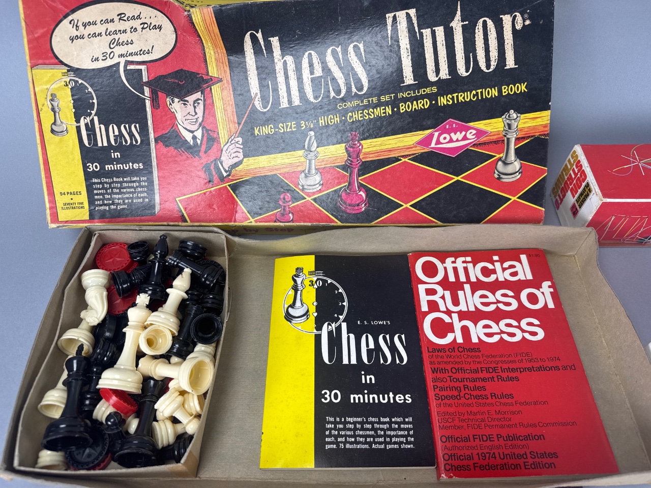 E. S. Lowe’s Chess Tutor is a chess game set designed to teach players the fundamentals of chess. The set includes chess pieces, a chess board with red and black squares, the ‘Official Rules of Chess’ book, and the ‘Chess in 30 Minutes’ instruction book. Box is open and contents are visible. Board measures 16″ wide. CONDITION: Box shows wear and tear. Chess board has a crease down the center. This game has not been evaluated to confirm inclusion of all game pieces and accessories. SHIPPING: In-House Shipping Available