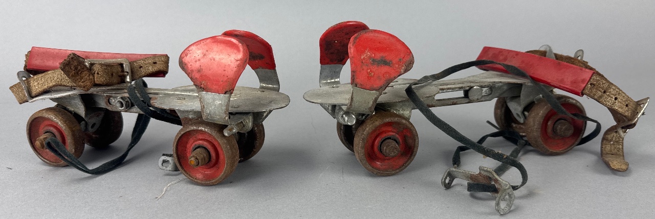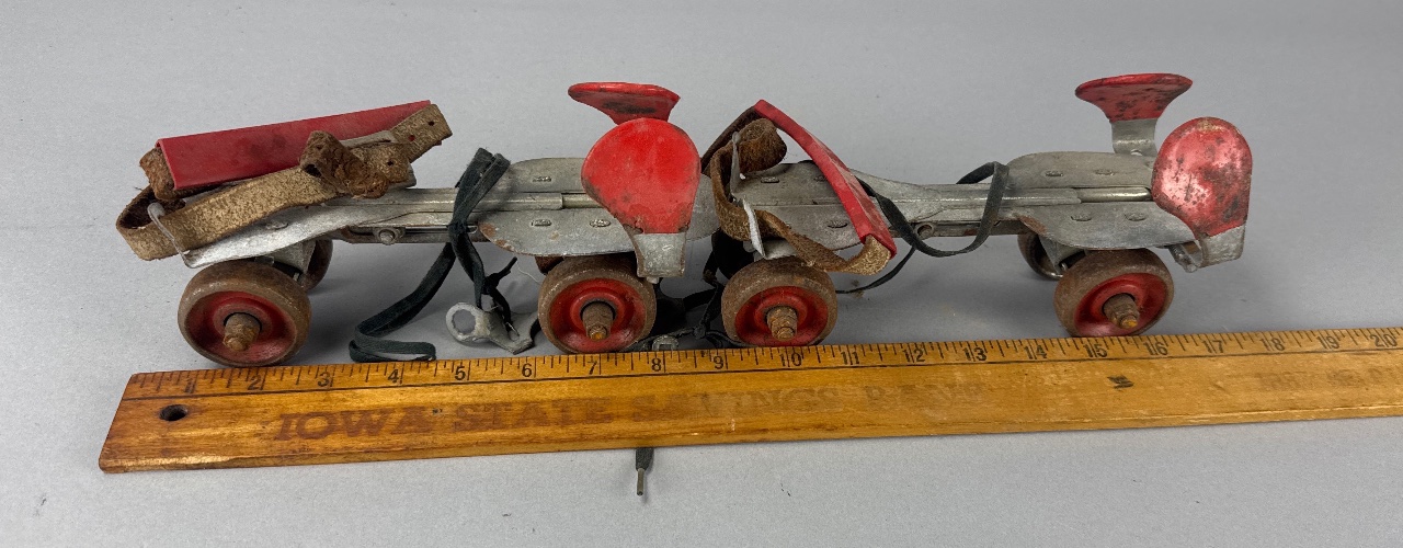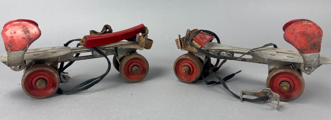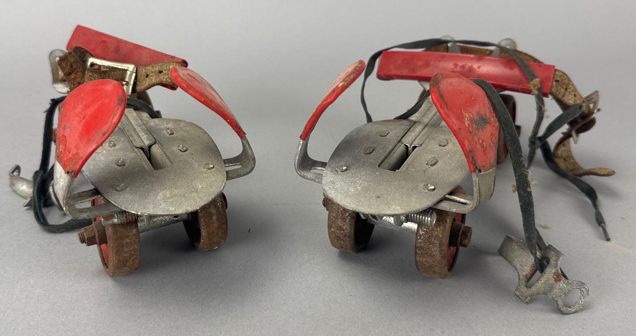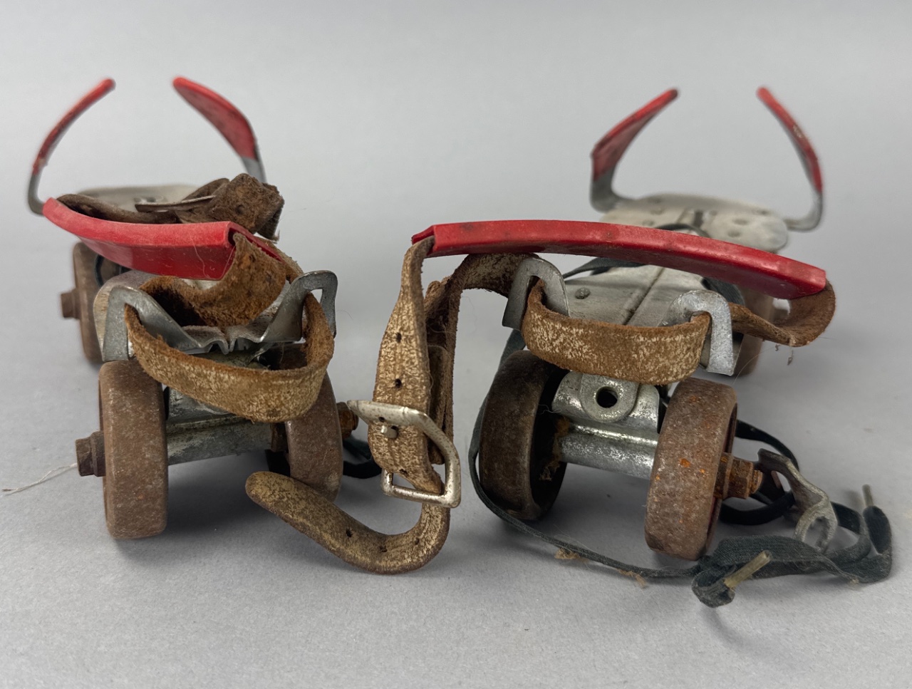 Pair of adjustable roller skates featuring metal frames with visible rust, red plastic toe stops and heel supports, black leather straps for securing feet, and four metal wheels per skate with rubber tires. Likely mid-20th century design, commonly associated with vintage children’s toys. CONDITION: Visible rust on metal components, wear on leather straps, and scratches on red plastic parts. SHIPPING: In-House Shipping Available