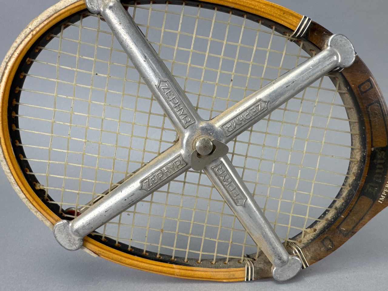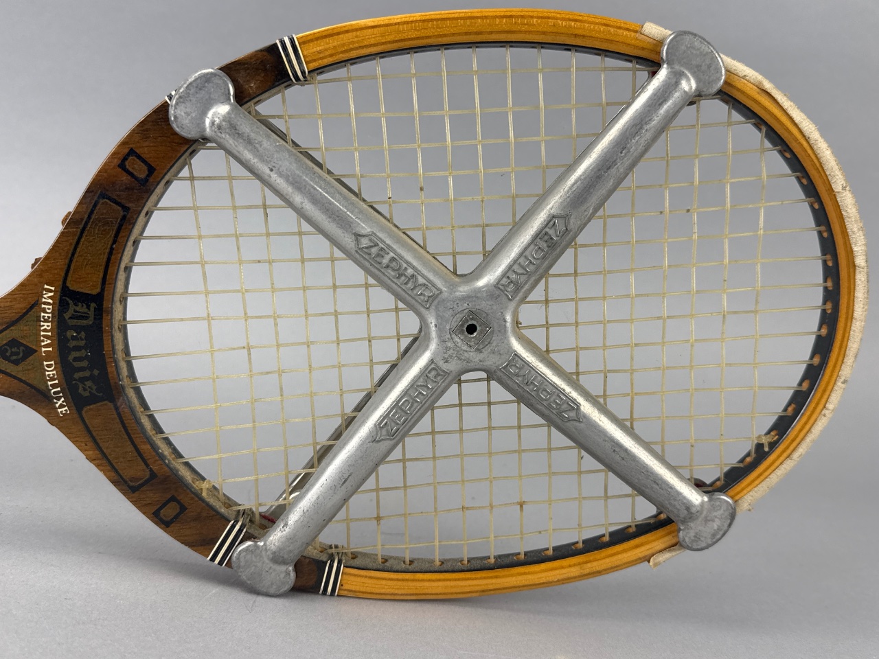 Davis Imperial Deluxe wooden tennis racket featuring a metal frame, rubber grip with textured surface, and decorative crest emblem on the handle. The racket head includes a crossbar structure, and visible text reads ‘Davis IMPERIAL DELUXE’ and ‘ZEPHYR’. Likely produced during the 1960s-1970s, this model is noted for its high-quality wood construction and aesthetic appeal. Measures about 26″ long. CONDITION: Some wear on the grip and minor scratches on the frame. Stringing appears intact but aged. SHIPPING: In-House Shipping Available