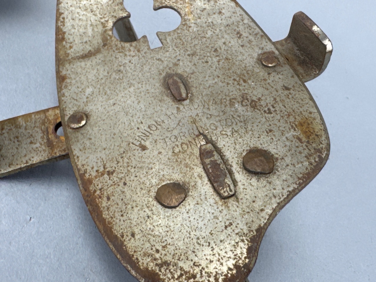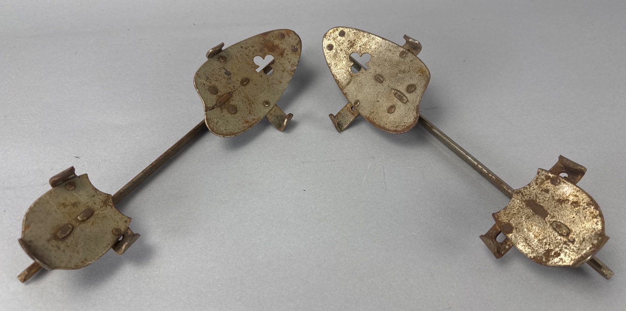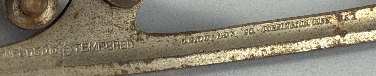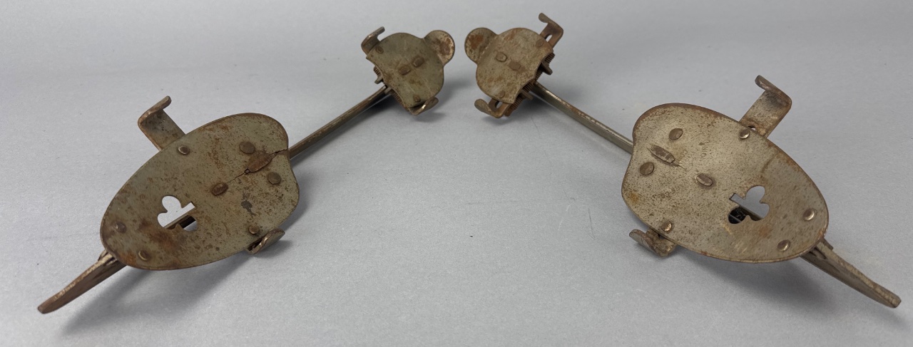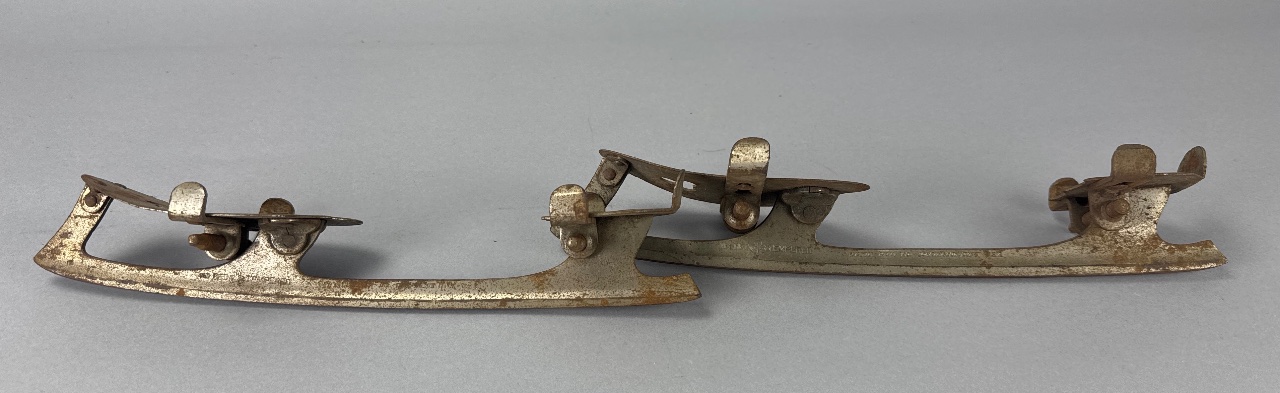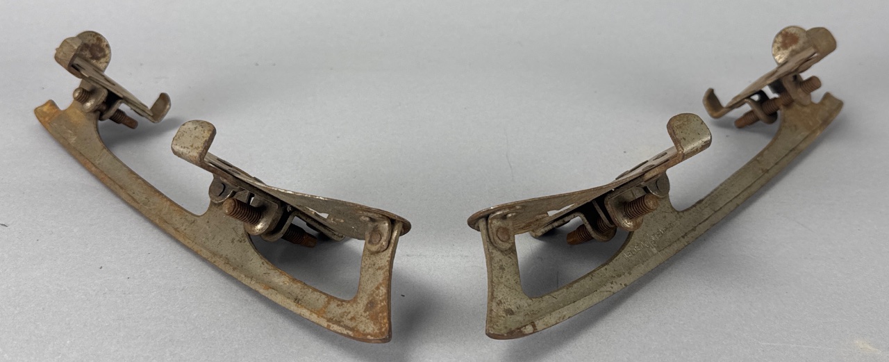 Pair of vintage metal ice skate blades with adjustable clamps, marked ‘UNION HARDWARE CO. HARTINGTON, CONN. U.S.A.’ and ‘WELDED TEMPERED’. Constructed of metal with visible rust and wear on the surfaces. Each blade features a curved shape and flat base, with adjustable clamps for attachment. Each skate measures about 12″ long. CONDITION: Surface rust and discoloration present on all blades. Some mechanical parts appear functional but show signs of wear. SHIPPING: In-House Shipping Available
