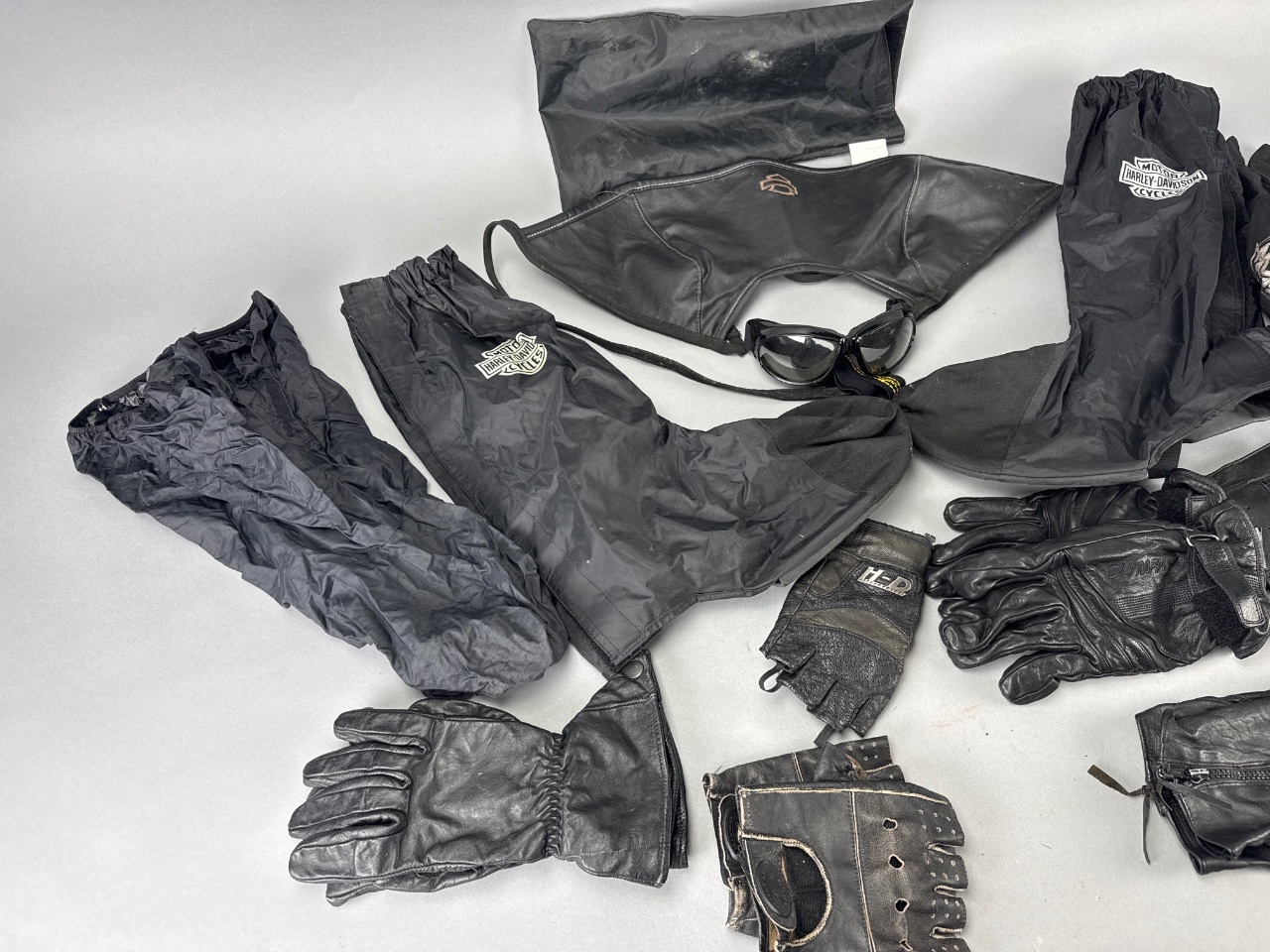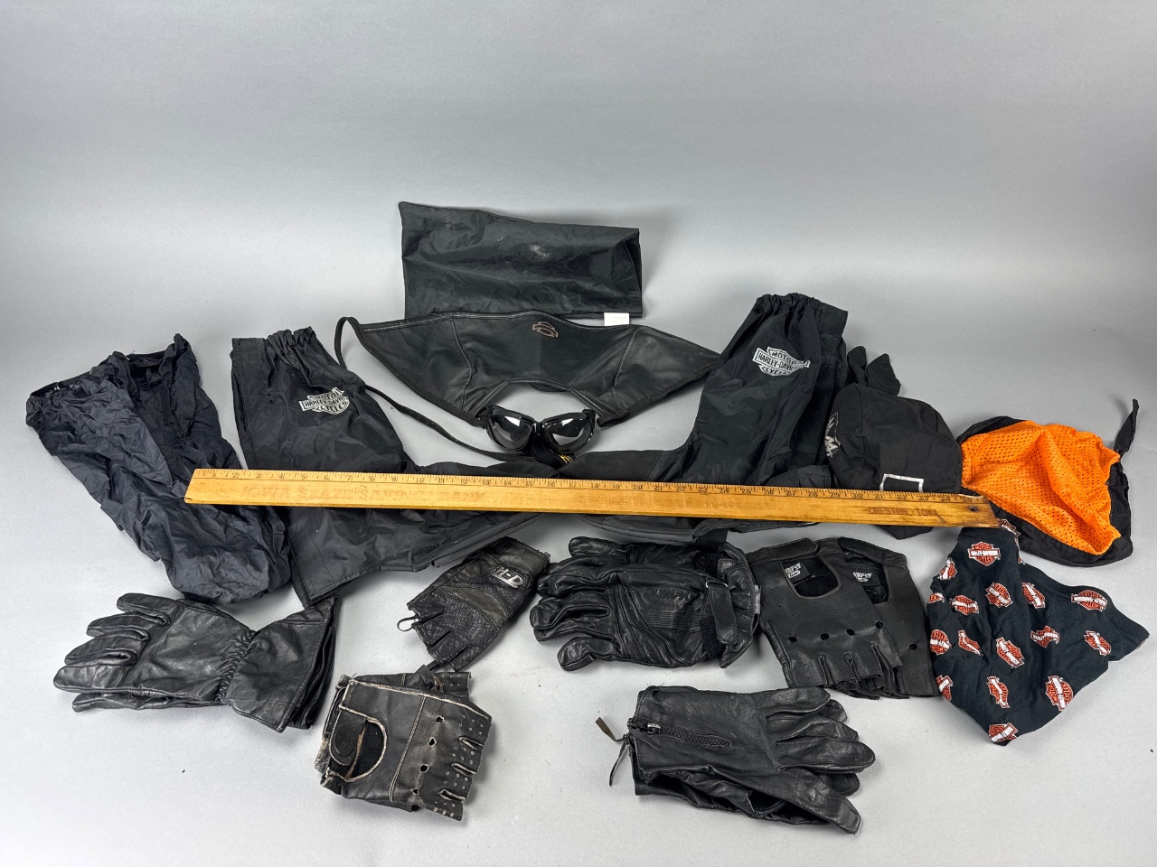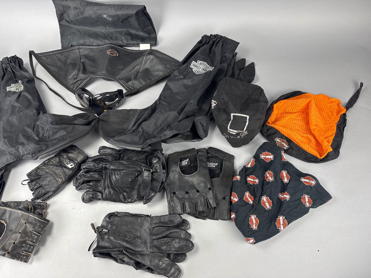 Assorted Harley-Davidson motorcycle gear including black leather gloves, black waterproof pants with Harley-Davidson logo, black mesh cap with ‘On Your Side’ text, and an orange mesh item, possibly a face mask or bandana. Harley-Davidson branding is visible on multiple pieces. CONDITION: Some items show signs of wear, including slight scuffing on gloves. SHIPPING: In-House Shipping Available