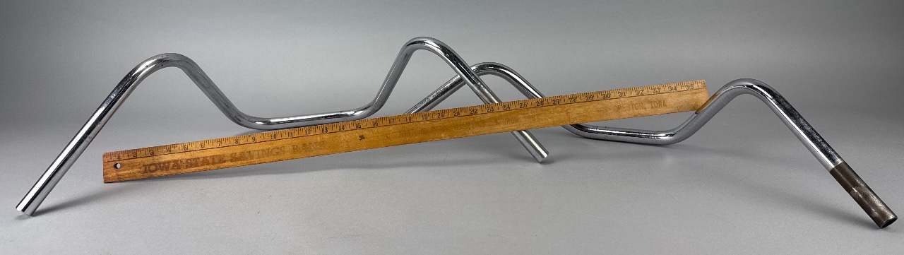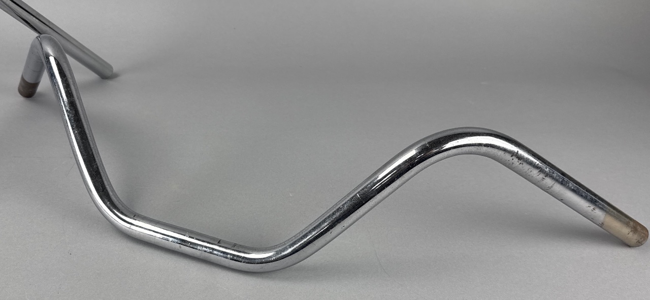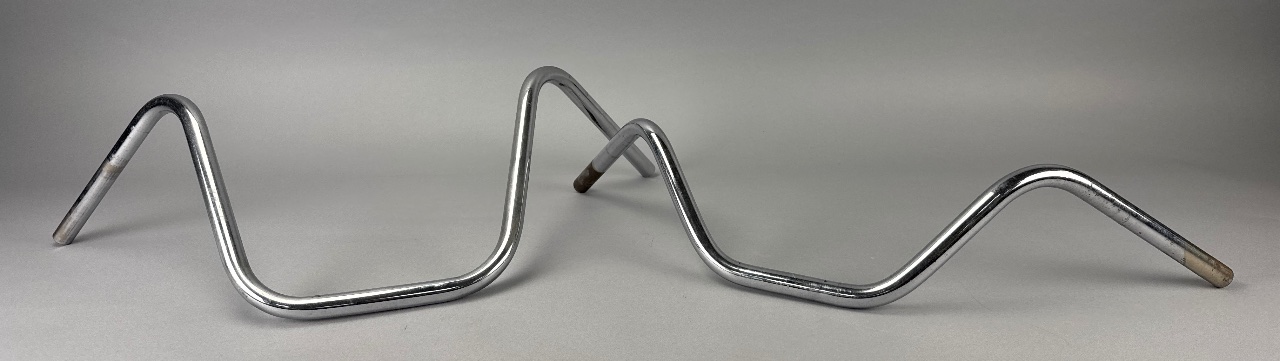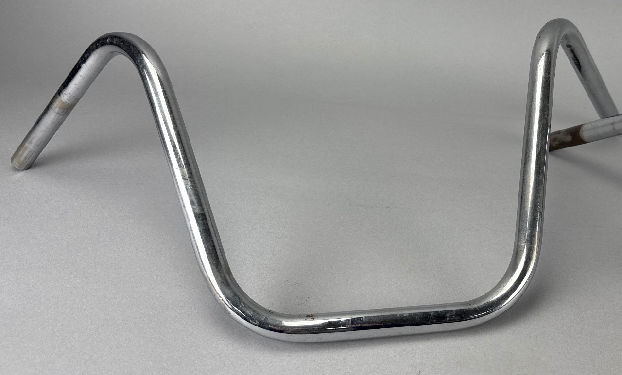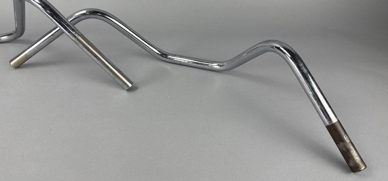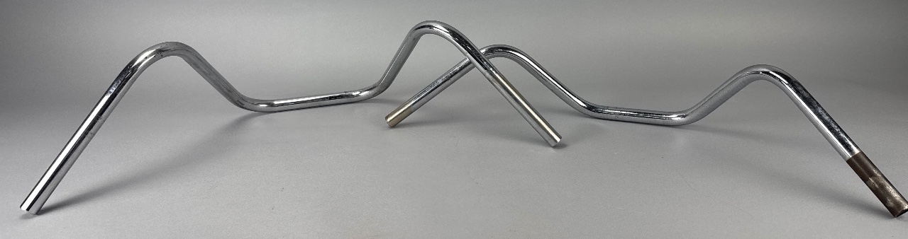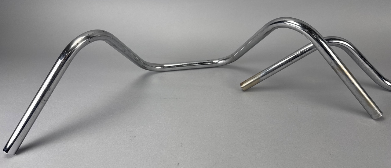 Pair of chrome motorcycle handlebar parts with a zigzag shape. Each part features two mounting ends, with slight color variation between the ends. The chrome surface shows minor wear and scratches. CONDITION: Minor scratches and wear on the chrome surface. Ends of the parts show slight color variation, with one end darker than the other. SHIPPING: In-House Shipping Available