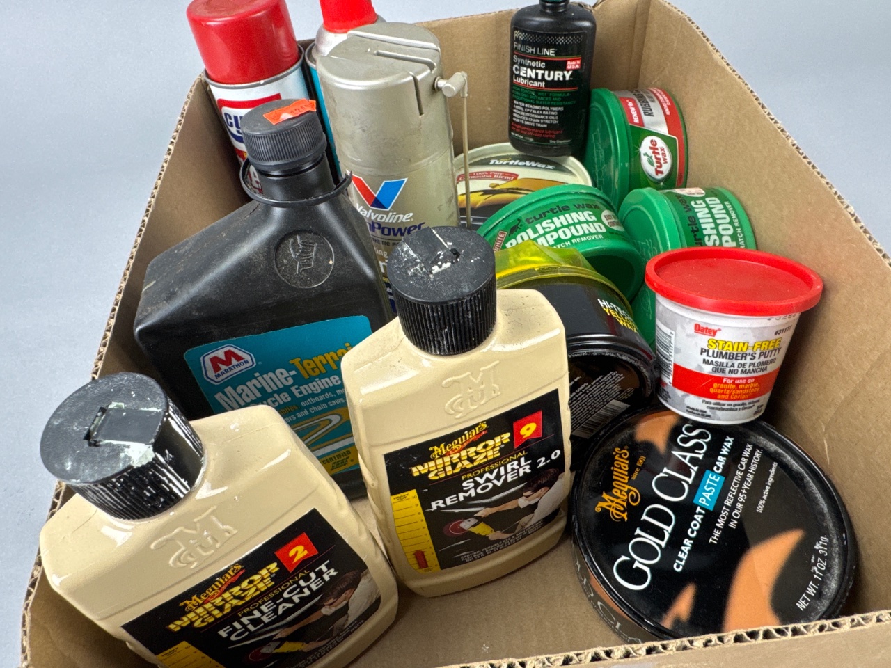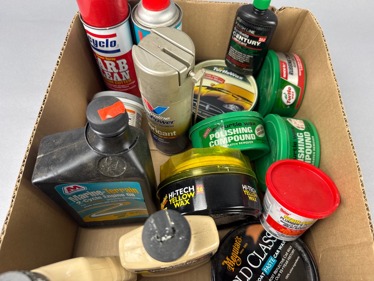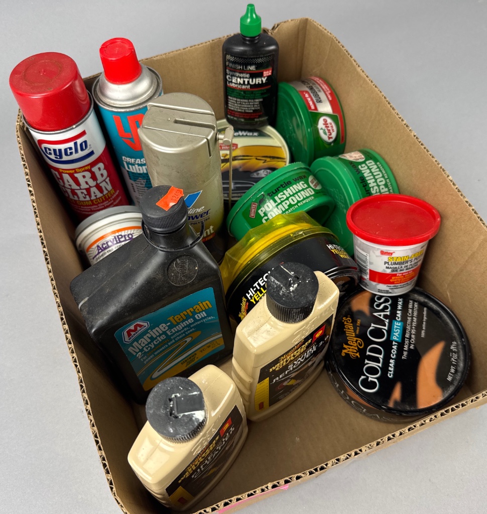 Assortment of automotive cleaning and maintenance products housed in a rectangular cardboard box. Visible brands include Turtle Wax, Meguiar’s Gold Class, Marine-Terrain 2 Cycle Engine Oil, Finish Line Synthetic Century Lubricant, Cyclo Carb Clean, Hi-Tech Yellow Wax, and Stain-Free Plumber’s Putty. The lot contains multiple containers of polishing compounds, waxes, specialty lubricants, and a plumbing supply item. CONDITION: Some containers show signs of wear and dust accumulation. Labels on certain containers are partially obscured or damaged. SHIPPING: In-House Shipping Available
