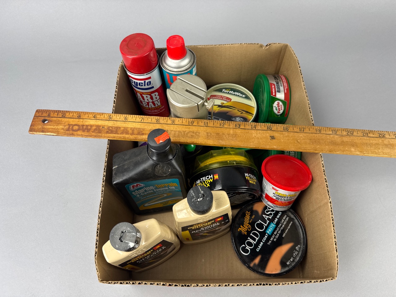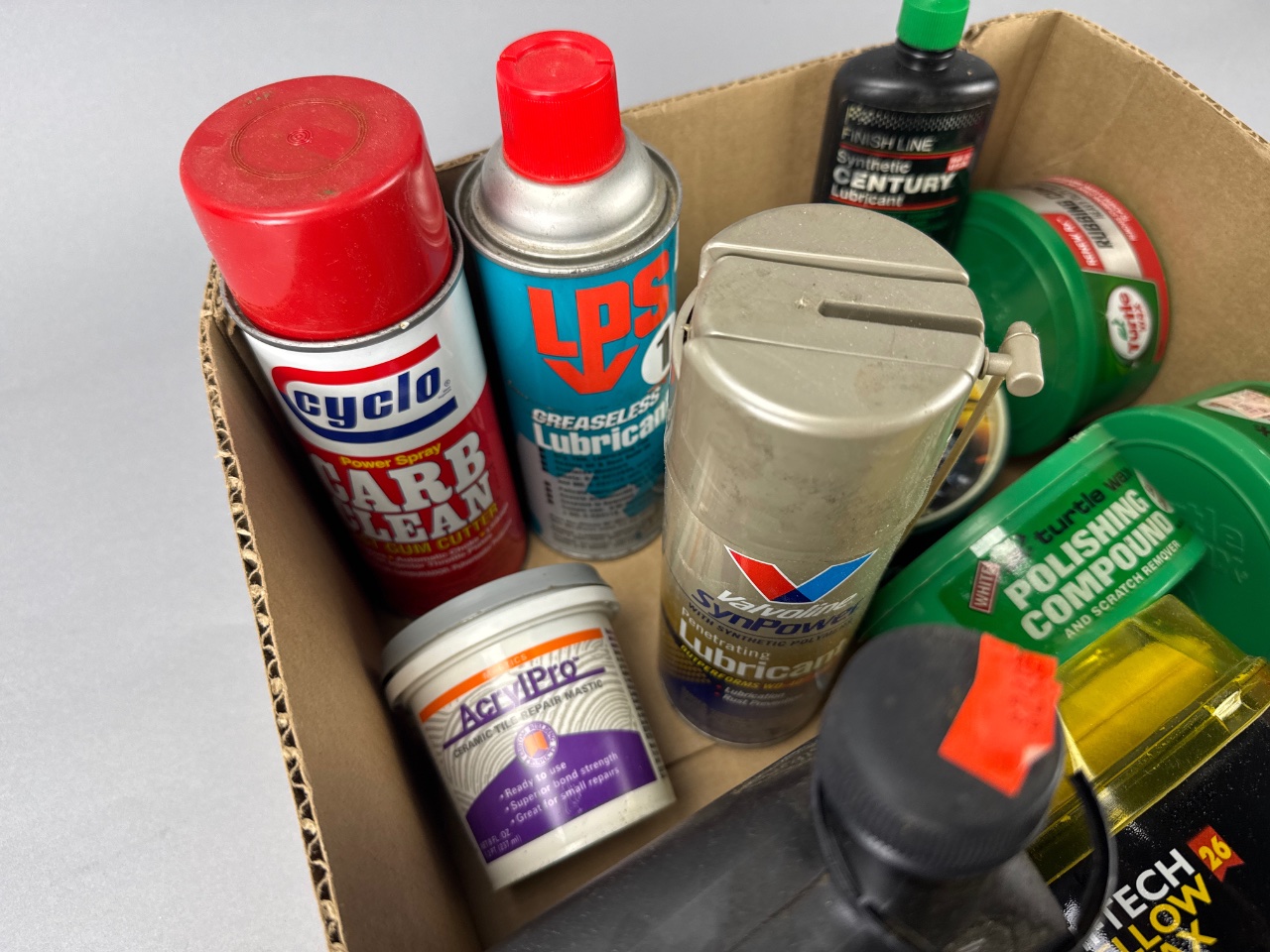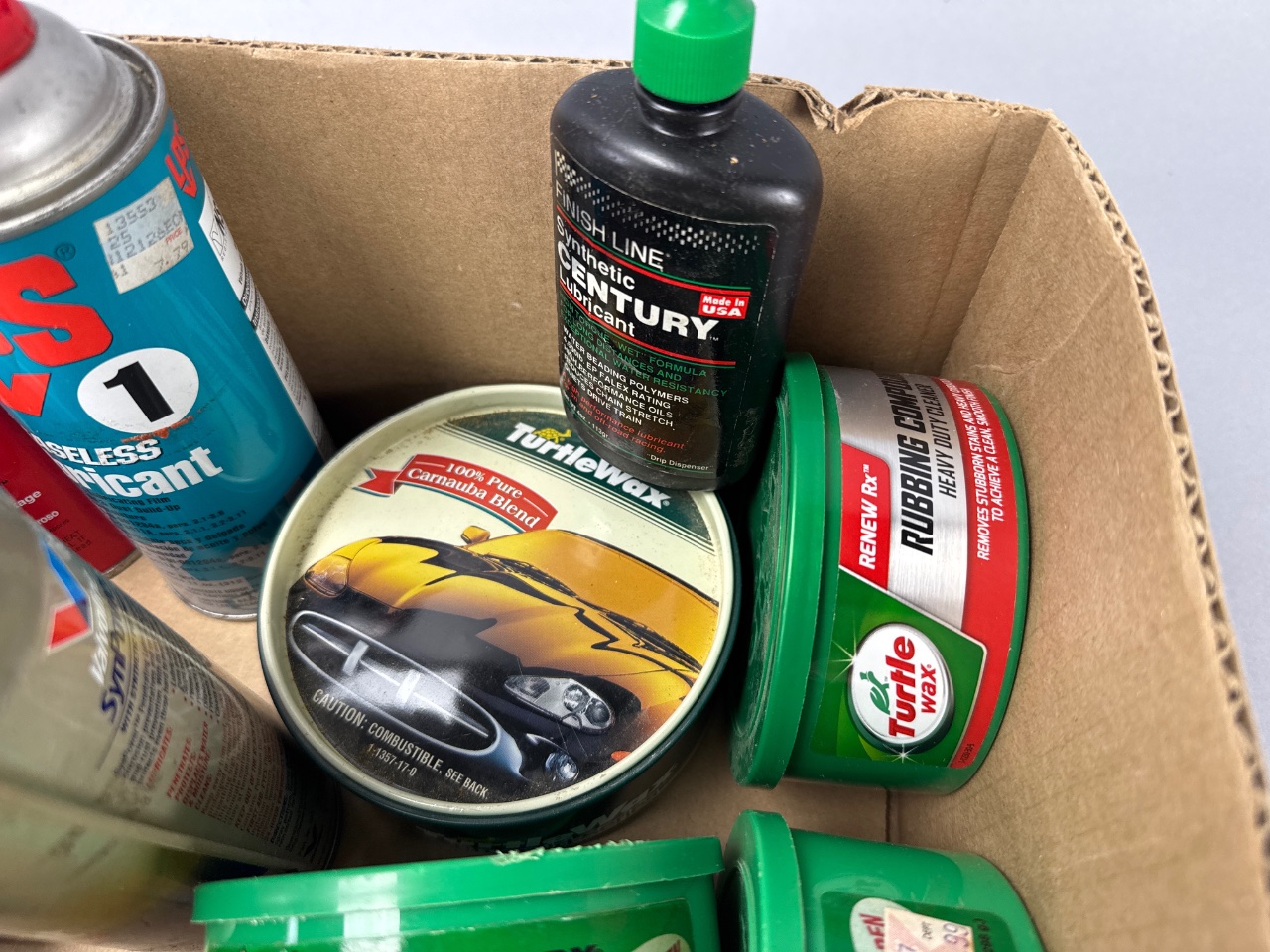 Assortment of automotive cleaning and maintenance products housed in a rectangular cardboard box. Visible brands include Turtle Wax, Meguiar’s Gold Class, Marine-Terrain 2 Cycle Engine Oil, Finish Line Synthetic Century Lubricant, Cyclo Carb Clean, Hi-Tech Yellow Wax, and Stain-Free Plumber’s Putty. The lot contains multiple containers of polishing compounds, waxes, specialty lubricants, and a plumbing supply item. CONDITION: Some containers show signs of wear and dust accumulation. Labels on certain containers are partially obscured or damaged. SHIPPING: In-House Shipping Available