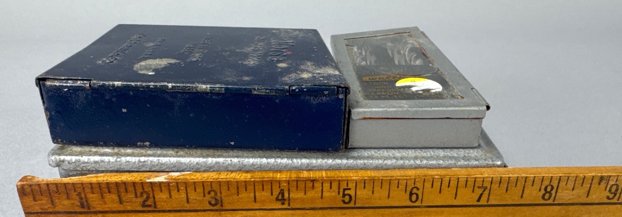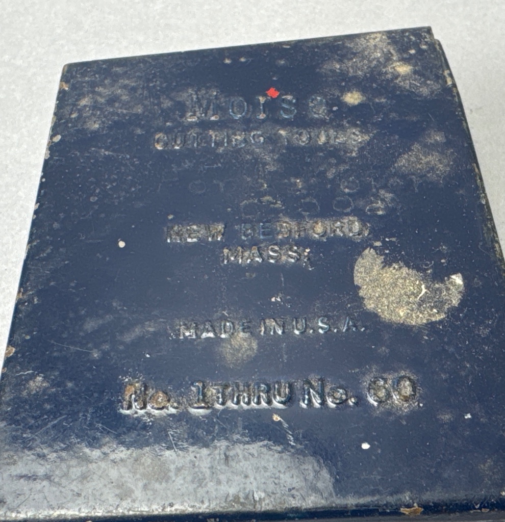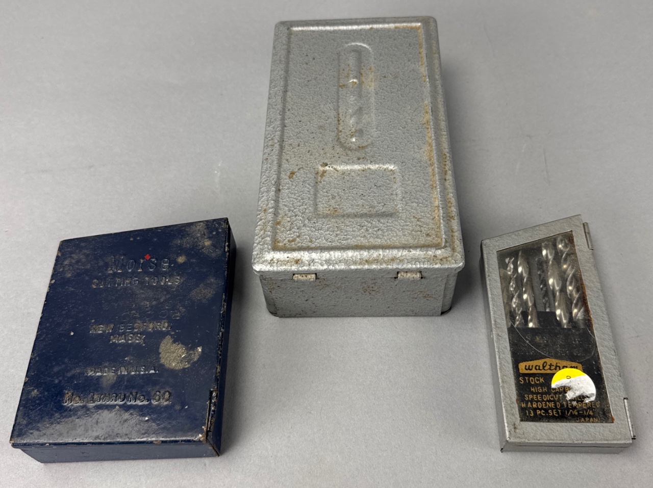 Three metal boxes containing drill bits by Morse Cutting Tools. The boxes are marked with text including ‘Morse Cutting Tools, New Bedford, Mass., Made in U.S.A.’, ‘High Carbon Speedcut Drill Hardened & Tempered’, and ’13 pc. set 1/16 – 1/4′. Drill bits of various sizes are visible, with one box containing gold-colored drill bits. CONDITION: Surface wear and dirt are present on the boxes, with some showing signs of rust. SHIPPING: In-House Shipping Available