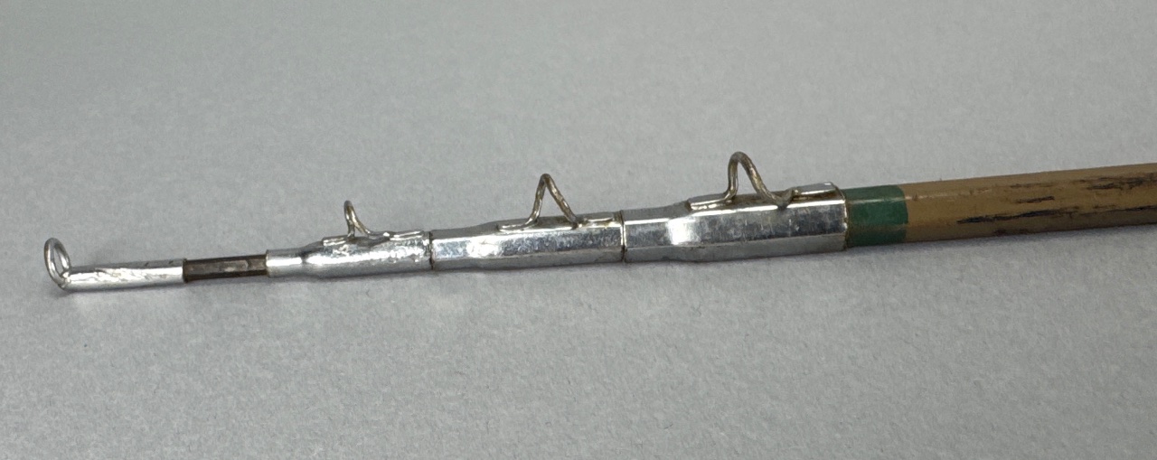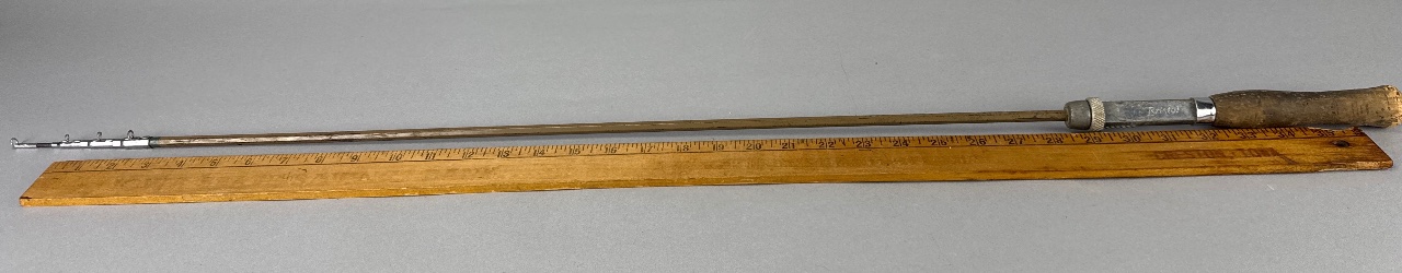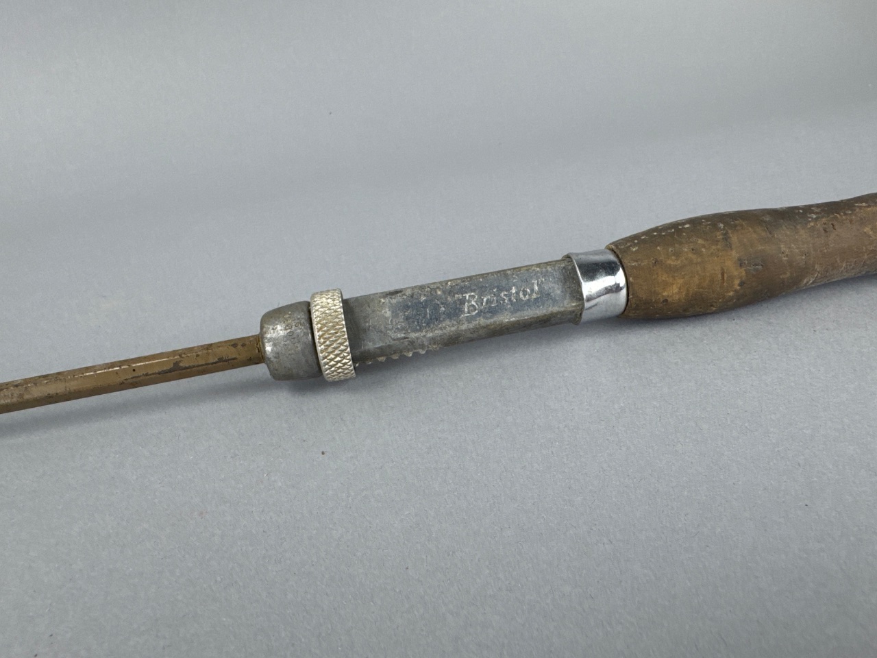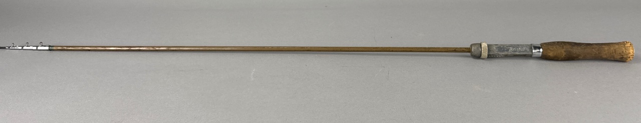 Bristol extendable fishing rod featuring a wooden handle and metal construction. The handle includes a knurled grip, and the rod is equipped with three guides near the tip. The maker’s name, ‘Bristol,’ is directly readable on the handle. CONDITION: The wooden handle shows some wear, and the metal parts exhibit signs of oxidation. SHIPPING: In-House Shipping Available