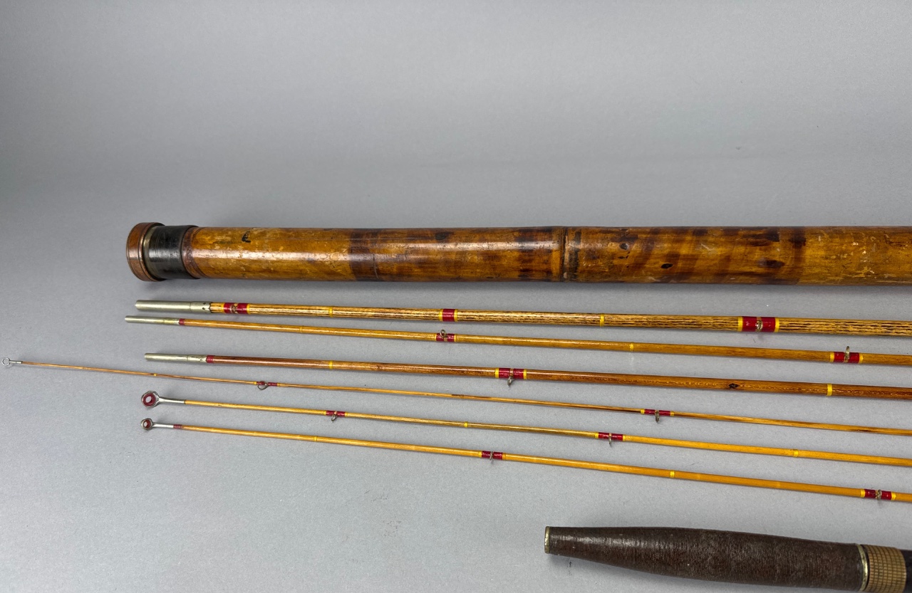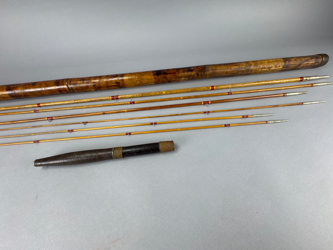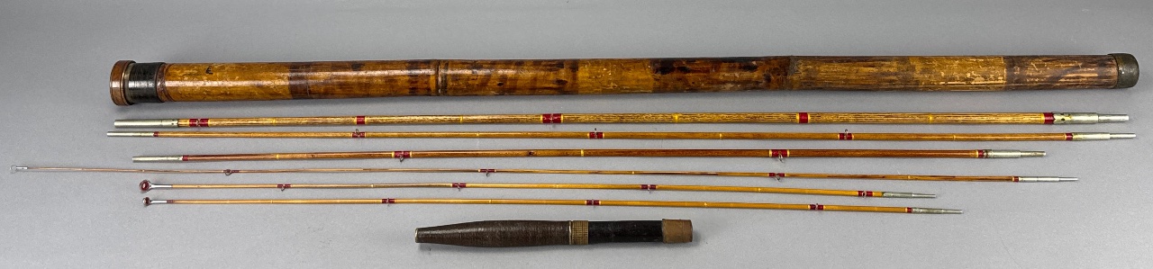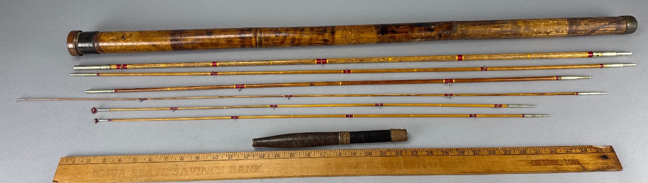 Set of segmented fishing rods with metal tips and red and yellow decorative wraps, housed in a cylindrical wooden carrying case with a metal end cap and wooden handle. CONDITION: SHIPPING: In-House Shipping Available