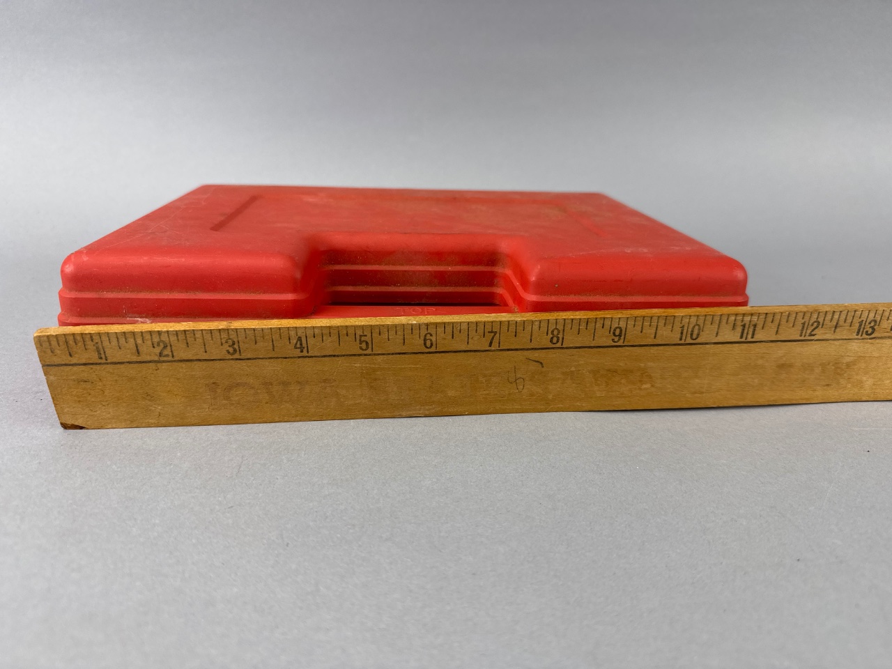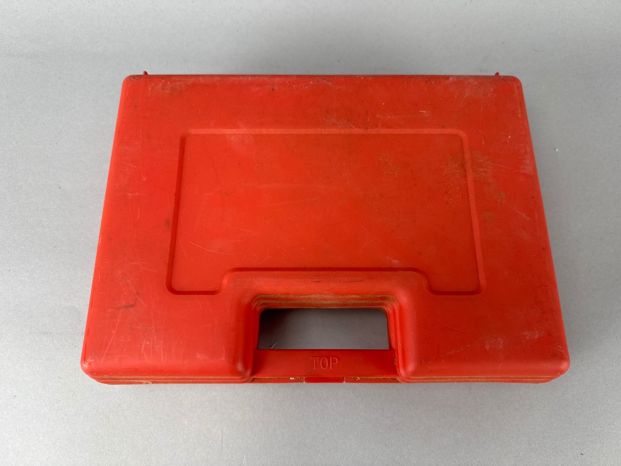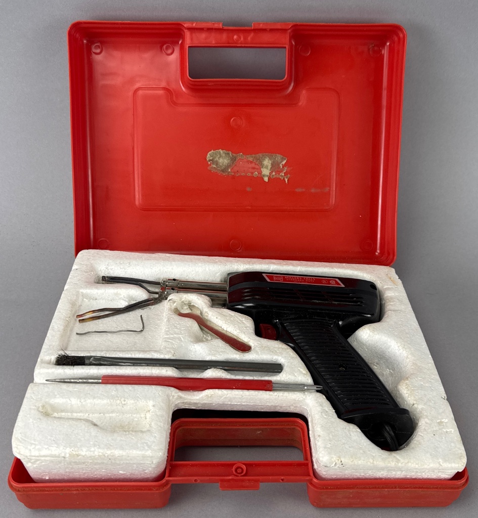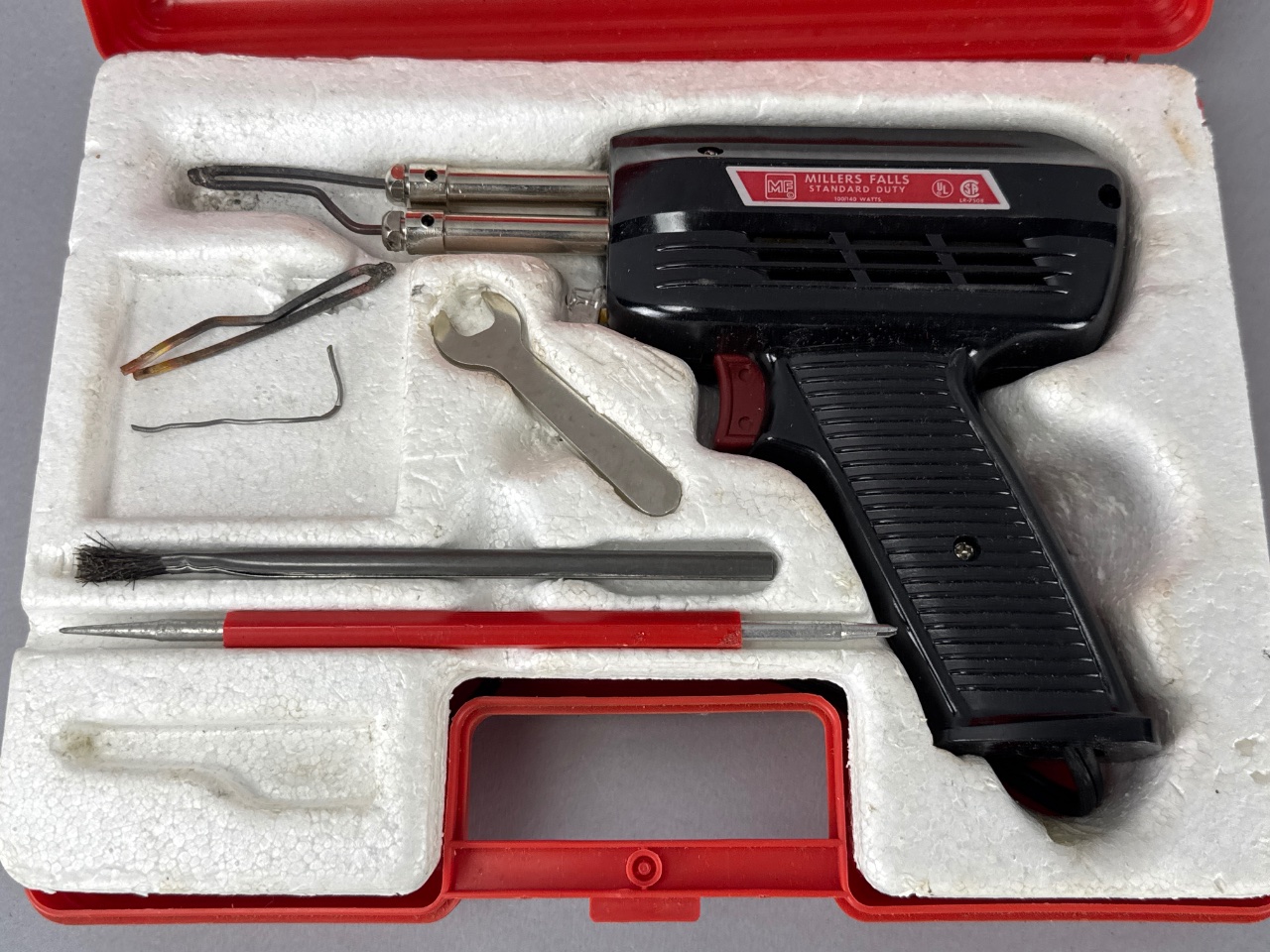 Millers Falls pneumatic tool kit housed in a red plastic carrying case with foam padding. The kit includes a black and silver pneumatic tool with a trigger and two metal nozzles, as well as metal tools including a wrench, brush, and pick. The tool bears the mark ‘MILLERS FALLS STANDARD DUTY,’ confirming the maker. Case measures about 11″ wide. CONDITION: Surface scratches and wear on the carrying case. Foam padding shows signs of aging and discoloration. SHIPPING: In-House Shipping Available