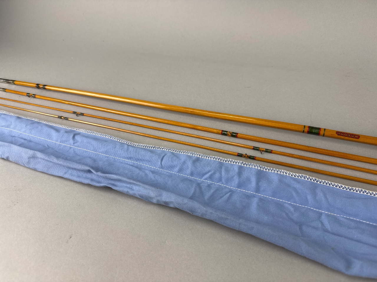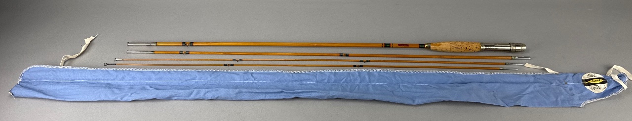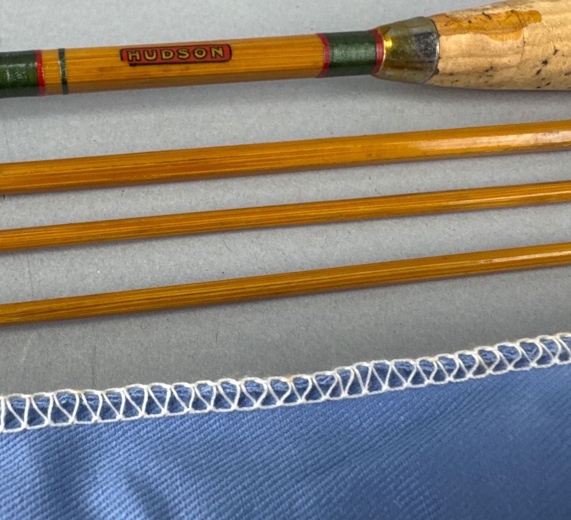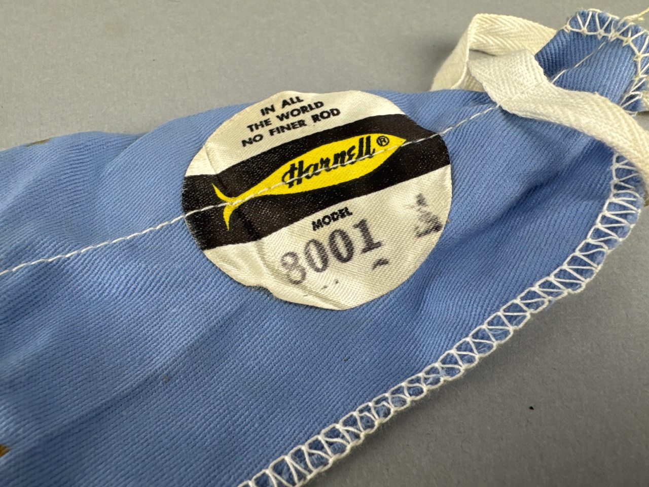 Harnell Model 8001 four-piece fishing rod with cork handle and metal reel seat. The rod features visible text reading ‘HUDSON’ and includes a blue fabric rod case with white stitching. The case bears a tag marked ‘Harnell Model 8001.’ Metal tips are present on the rod sections. CONDITION: Some wear to the cork handle. No visible damage to the rod sections. SHIPPING: In-House Shipping Available