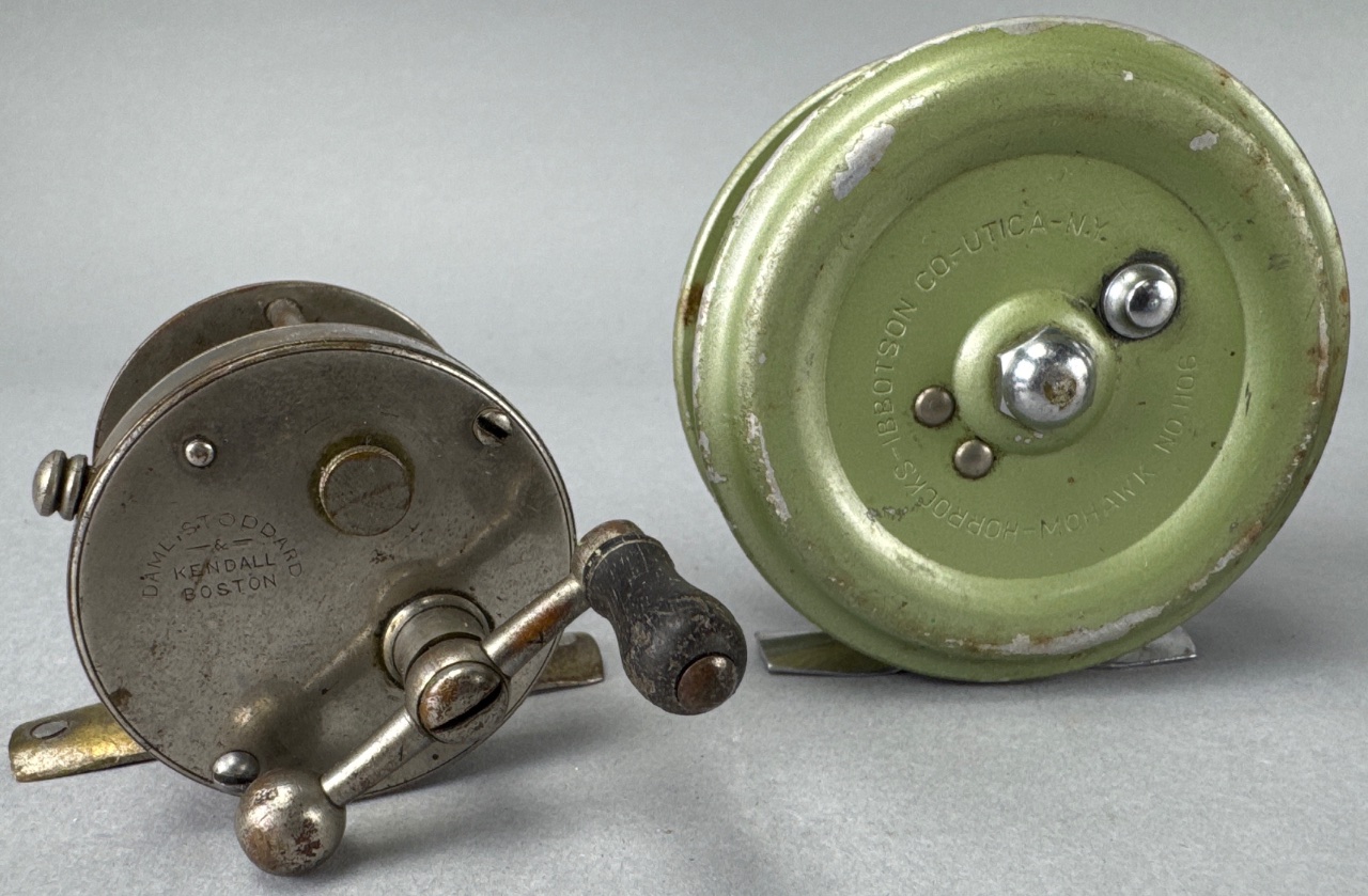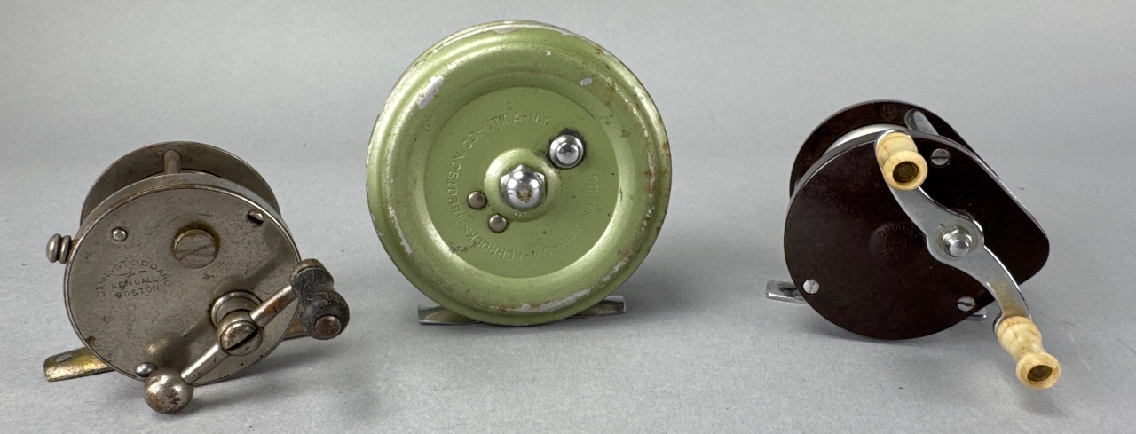 Group of three collectible fishing reels, including one marked ‘DAVIS L. STODDARD & KENDALL BOSTON,’ one marked ‘S. ABBOITSON CO. UTICA N.Y. 9010 HOPKINS MOHAWK NO 100,’ and one with a light-colored knob handle. All reels feature metal construction with varying finishes. CONDITION: Surface wear and scratches are visible on all reels. The green reel shows paint loss and chipping. Metal parts exhibit signs of oxidation. SHIPPING: In-House Shipping Available