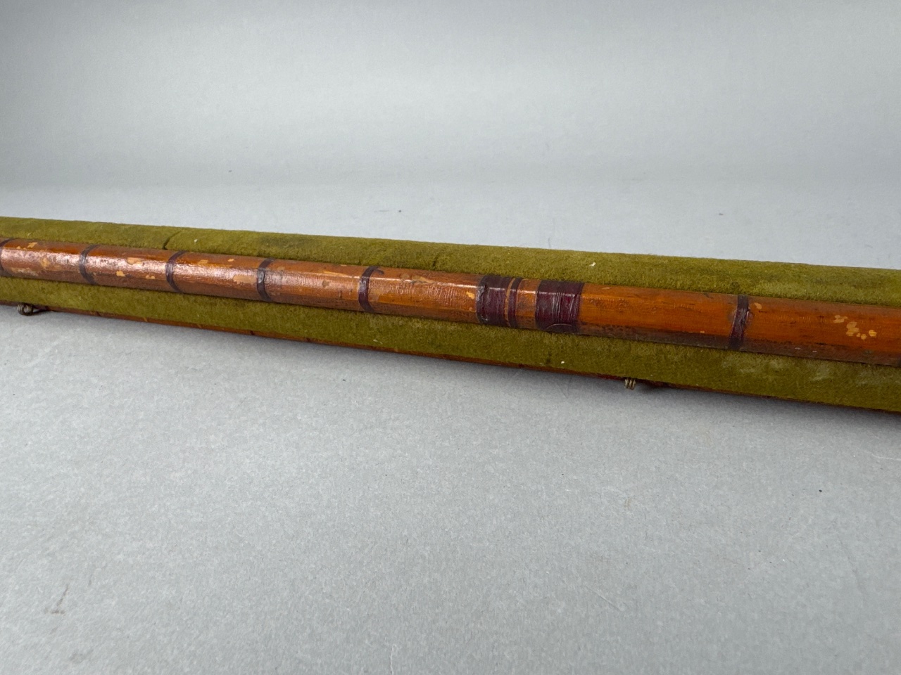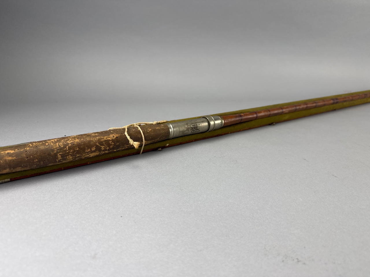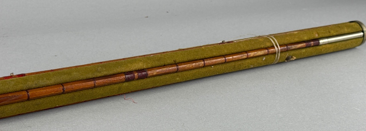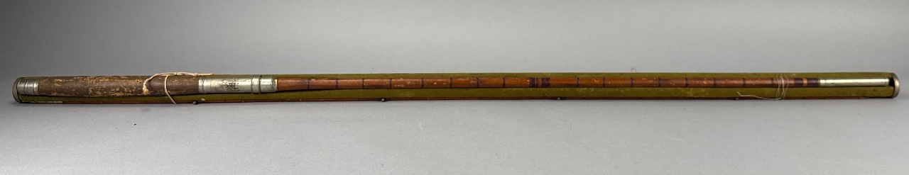 Fishing rod with wooden handle, metal ferrule, and green fabric wrapping. Multi-section design with brass ferrules for section connection. CONDITION: Surface wear and scratches on the wooden handle. Some discoloration on the green fabric covering. SHIPPING: In-House Shipping Available