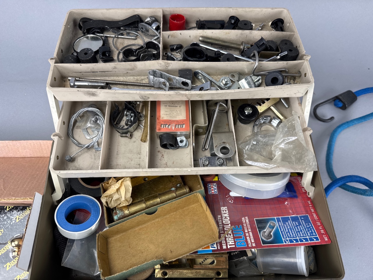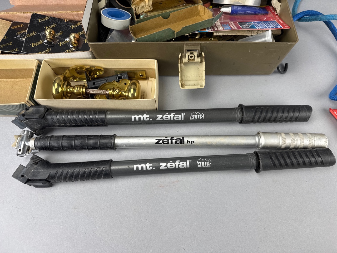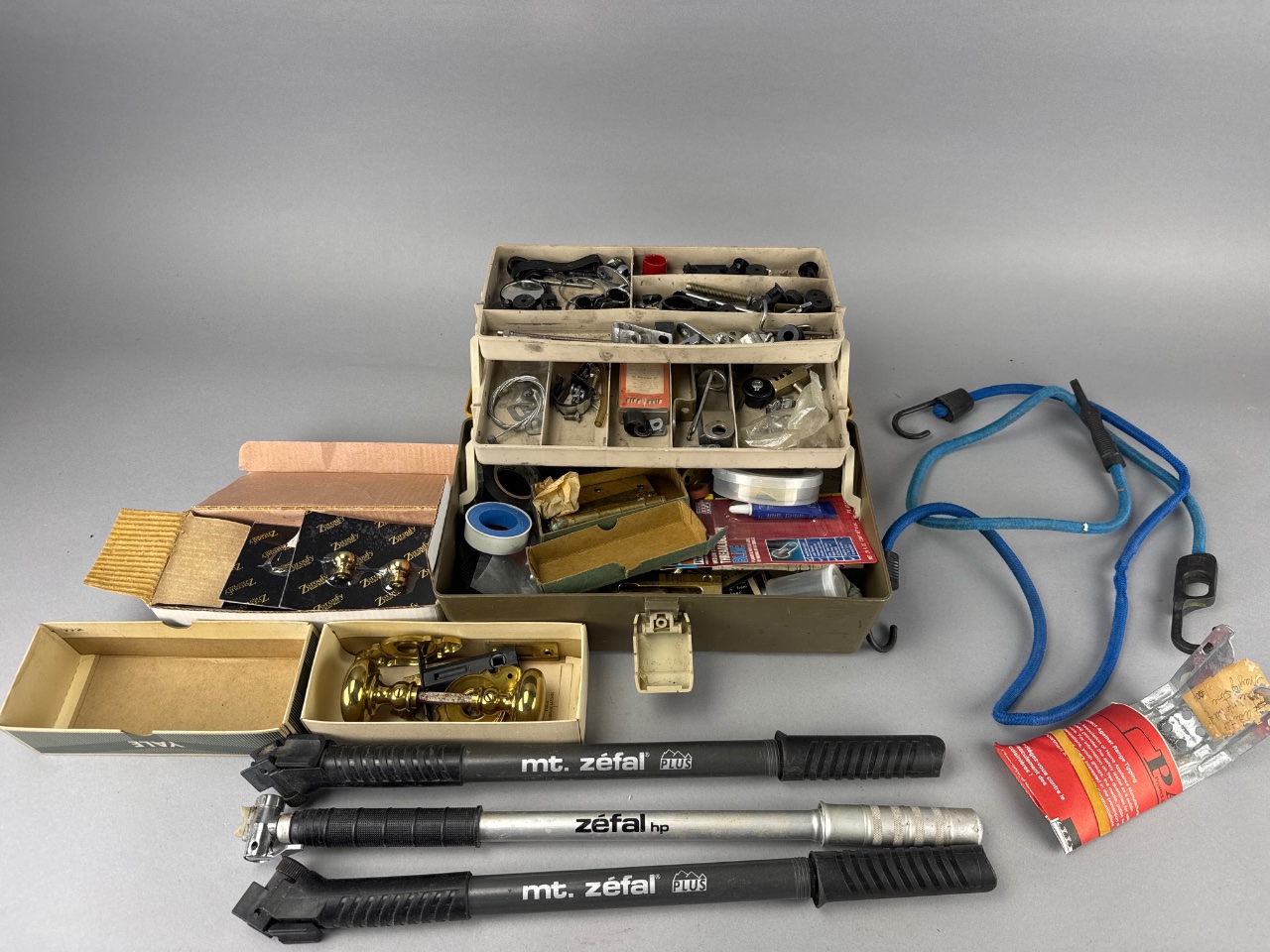 Metal toolbox with multiple compartments containing assorted hardware items, including two bicycle pumps marked ‘mt. zefal’, a blue bungee cord with hooks, and two boxes of brass door knobs with packaging marked ‘Zaroufy’. Various screws, bolts, and washers are also visible. CONDITION: The toolbox shows some surface wear. Packaging for the brass door knobs exhibits signs of age. SHIPPING: In-House Shipping Available