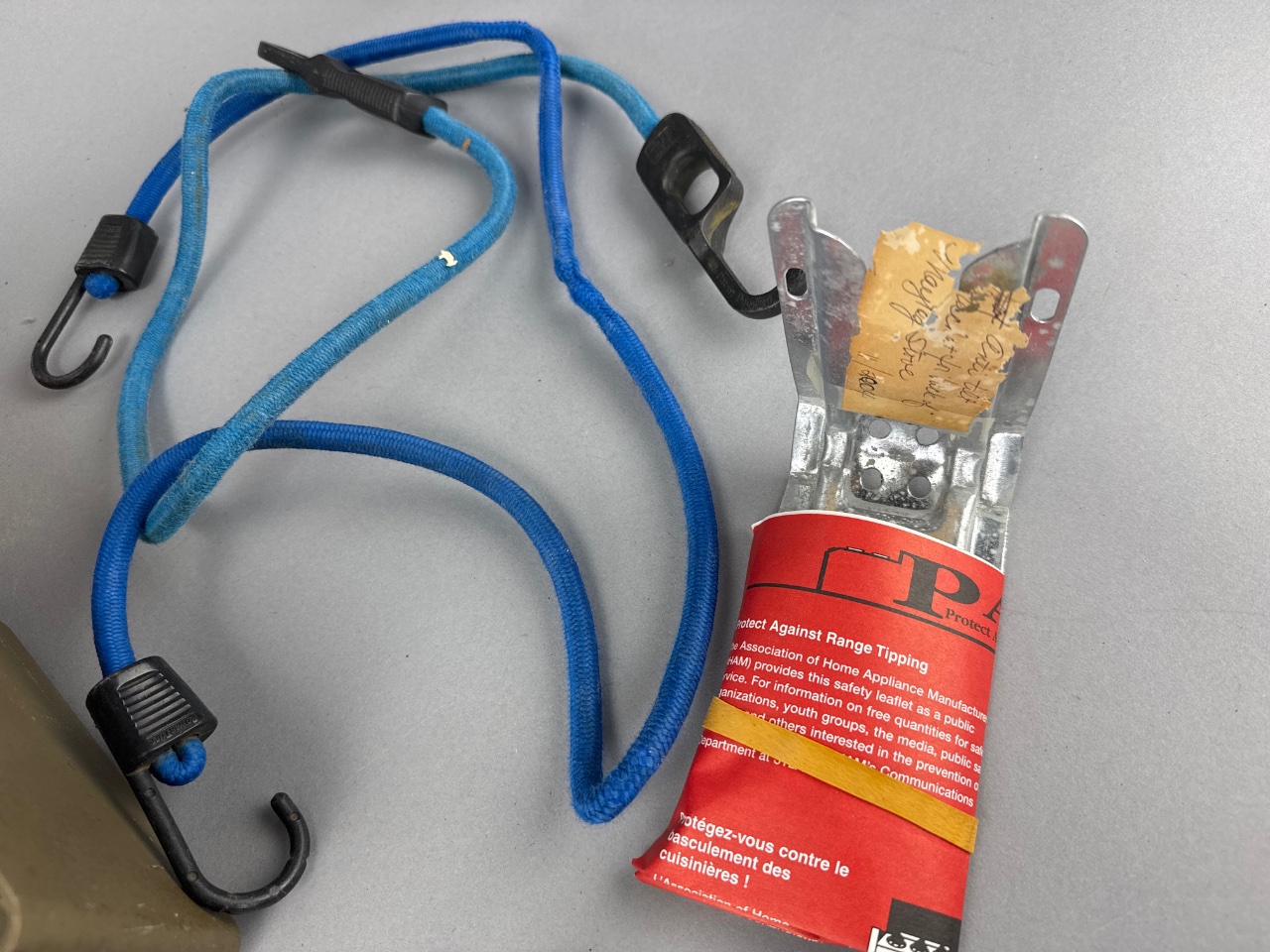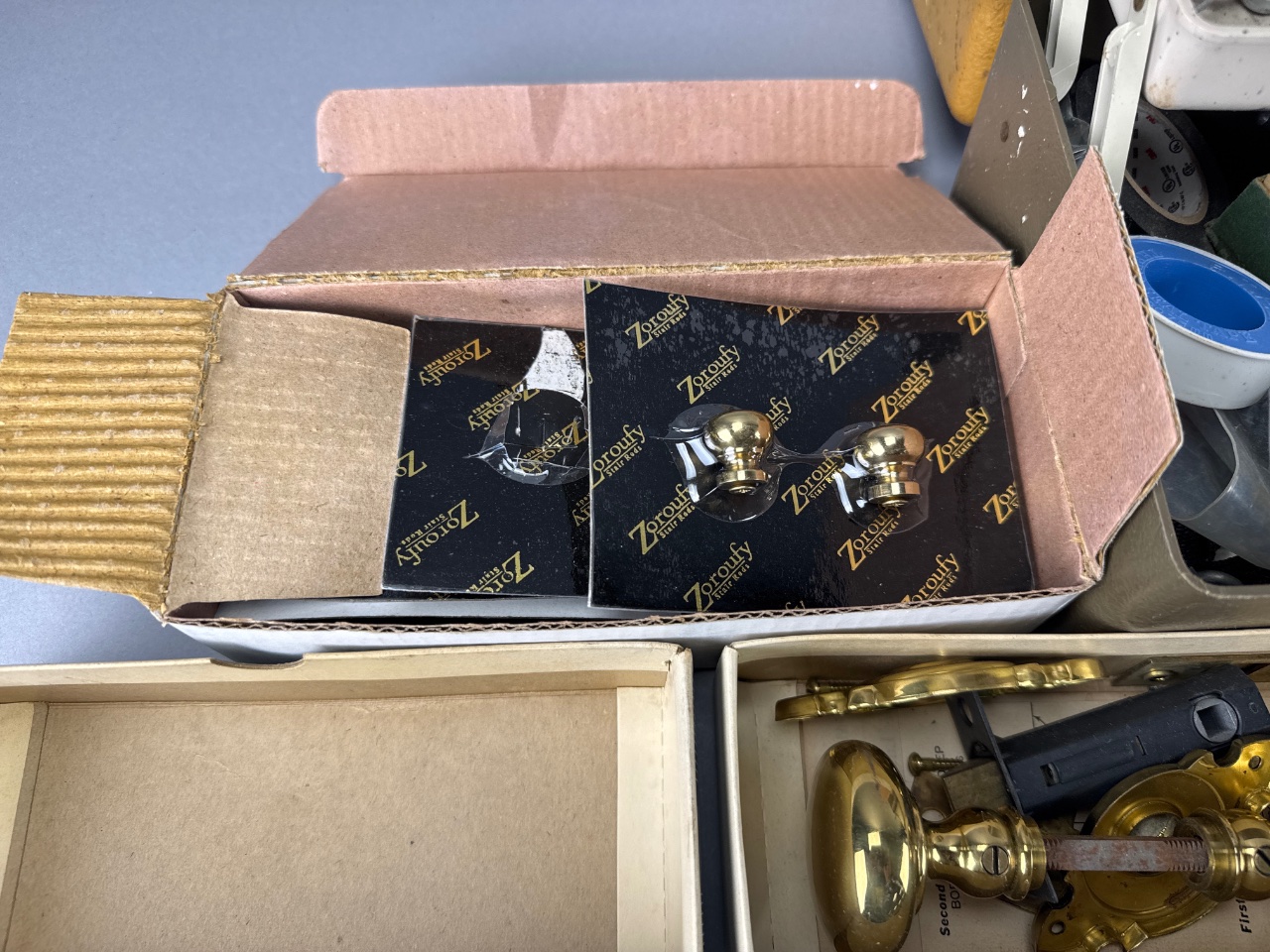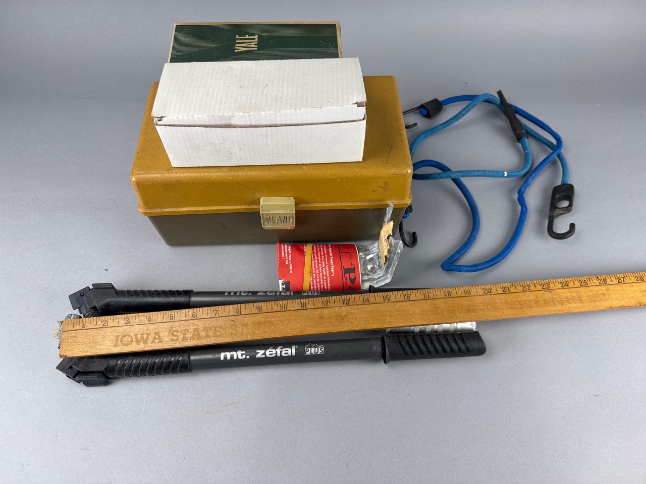 Metal toolbox with multiple compartments containing assorted hardware items, including two bicycle pumps marked ‘mt. zefal’, a blue bungee cord with hooks, and two boxes of brass door knobs with packaging marked ‘Zaroufy’. Various screws, bolts, and washers are also visible. CONDITION: The toolbox shows some surface wear. Packaging for the brass door knobs exhibits signs of age. SHIPPING: In-House Shipping Available