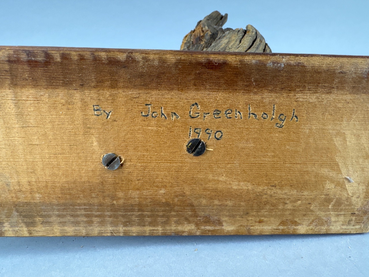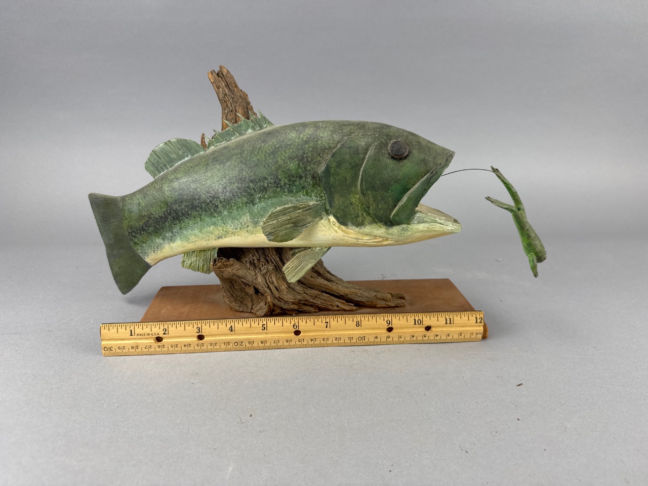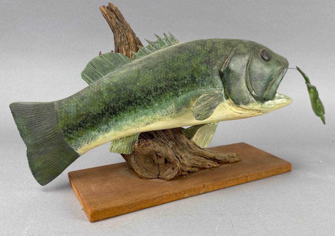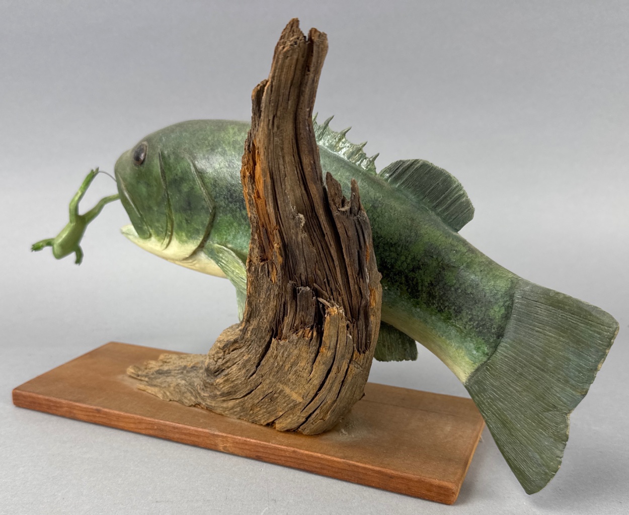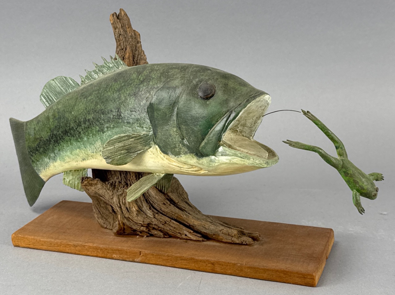 Sculpture of a fish with a frog in its mouth by John Greenhalgh, dated 1990. The fish features detailed scales and fins, while the frog appears to be leaping out of the fish’s mouth. Mounted on a wooden base with a piece of driftwood. Measures about 12″ wide. CONDITION: Condition not assessed. SHIPPING: In-House Shipping Available